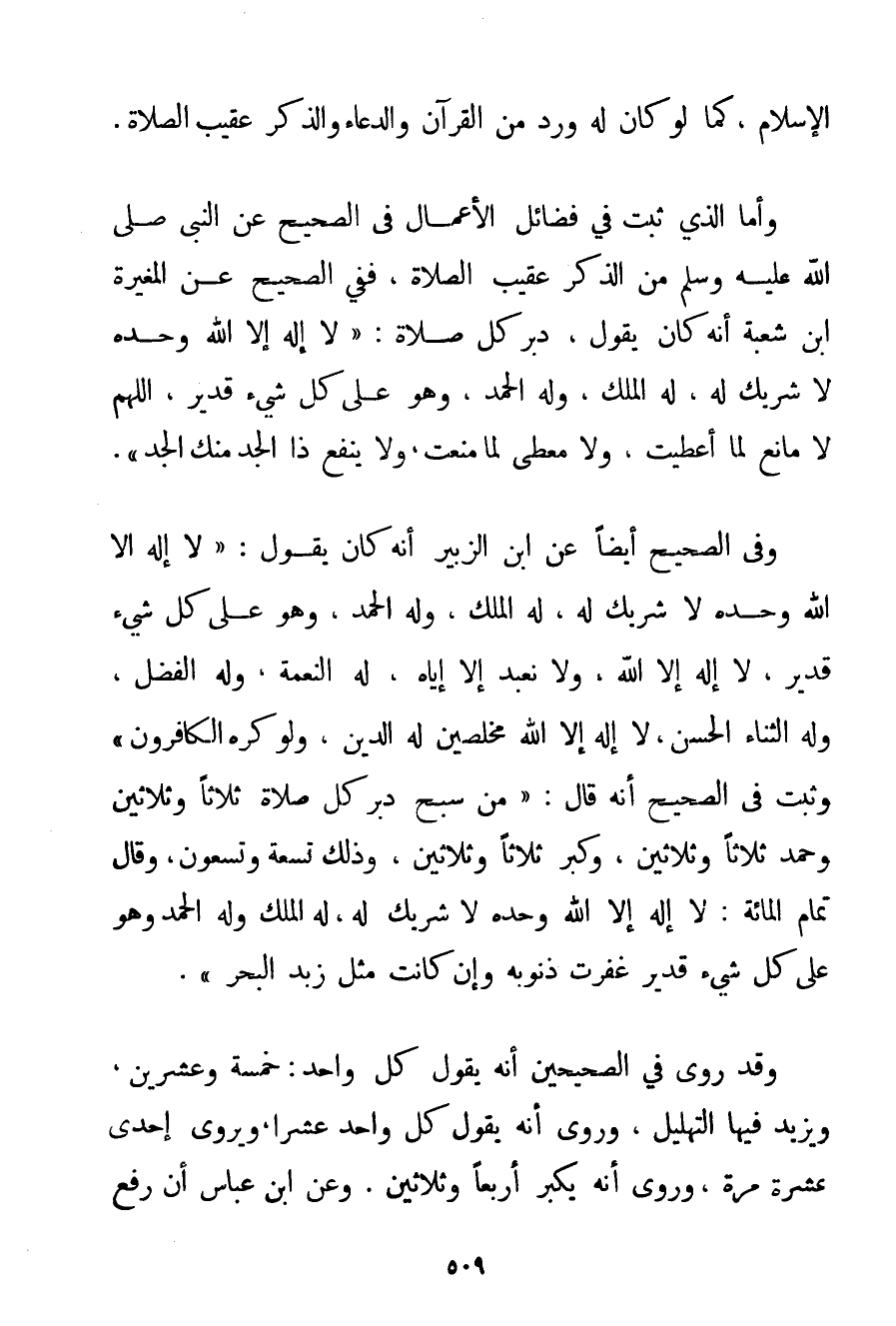 الْإِسْلَامِ كَمَا لَوْ كَانَ لَهُ وِرْدٌ مِنْ الْقُرْآنِ وَالدُّعَاءِ وَالذِّكْرِ عَقِيبَ الصَّلَاةِ. وَأَمَّا الَّذِي ثَبَتَ فِي فَضَائِلِ الْأَعْمَالِ فِي الصَّحِيحِ عَنْ النَّبِيِّ صَلَّى اللَّهُ عَلَيْهِ وَسَلَّمَ مِنْ الذِّكْرِ عَقِيبَ الصَّلَاةِ فَفِي الصَّحِيحِ عَنْ الْمُغِيرَةِ بْنِ شُعْبَةَ أَنَّهُ كَانَ يَقُولُ دُبُرَ كُلِّ صَلَاةٍ: {لَا إلَهَ إلَّا اللَّهُ وَحْدَهُ لَا شَرِيكَ لَهُ لَهُ الْمُلْكُ وَلَهُ الْحَمْدُ وَهُوَ عَلَى كُلِّ شَيْءٍ قَدِيرٌ اللَّهُمَّ لَا مَانِعَ لِمَا أَعْطَيْت وَلَا مُعْطِيَ لِمَا مَنَعْت وَلَا يَنْفَعُ ذَا الْجَدِّ مِنْك الْجَدُّ} . وَفِي الصَّحِيحِ أَيْضًا عَنْ ابْنِ الزُّبَيْرِ أَنَّهُ كَانَ يَقُولُ: {لَا إلَهَ إلَّا اللَّهُ وَحْدَهُ لَا شَرِيكَ لَهُ لَهُ الْمُلْكُ وَلَهُ الْحَمْدُ وَهُوَ عَلَى كُلِّ شَيْءٍ قَدِيرٌ لَا إلَهَ إلَّا اللَّهُ وَلَا نَعْبُدُ إلَّا إيَّاهُ لَهُ النِّعْمَةُ وَلَهُ الْفَضْلُ وَلَهُ الثَّنَاءُ الْحَسَنُ لَا إلَهَ إلَّا اللَّهُ مُخْلِصِينَ لَهُ الدِّينَ وَلَوْ كَرِهَ الْكَافِرُونَ} وَثَبَتَ فِي الصَّحِيحِ أَنَّهُ قَالَ: {مَنْ سَبَّحَ دُبُرَ كُلِّ صَلَاةٍ ثَلَاثًا وَثَلَاثِينَ وَحَمِدَ ثَلَاثًا وَثَلَاثِينَ وَكَبَّرَ ثَلَاثًا وَثَلَاثِينَ وَذَلِكَ تِسْعَةٌ وَتِسْعُونَ وَقَالَ تَمَامَ الْمِائَةِ: لَا إلَهَ إلَّا اللَّهُ وَحْدَهُ لَا شَرِيكَ لَهُ لَهُ الْمُلْكُ وَلَهُ الْحَمْدُ وَهُوَ عَلَى كُلِّ شَيْءٍ قَدِيرٌ غُفِرَتْ ذُنُوبُهُ وَإِنْ كَانَتْ مِثْلَ زَبَدِ الْبَحْرِ} . وَقَدْ رُوِيَ فِي الصَّحِيحَيْنِ أَنَّهُ يَقُولُ: كُلَّ وَاحِدٍ خَمْسَةً وَعِشْرِينَ وَيَزِيدُ فِيهَا التَّهْلِيلَ وَرُوِيَ أَنَّهُ يَقُولُ كُلَّ وَاحِدٍ عَشَرَةً وَيُرْوَى إحْدَى عَشْرَةَ مَرَّةً وَرُوِيَ أَنَّهُ يُكَبِّرُ أَرْبَعًا وَثَلَاثِينَ. {وَعَنْ ابْنِ عَبَّاسٍ أَنَّ رَفْعَ