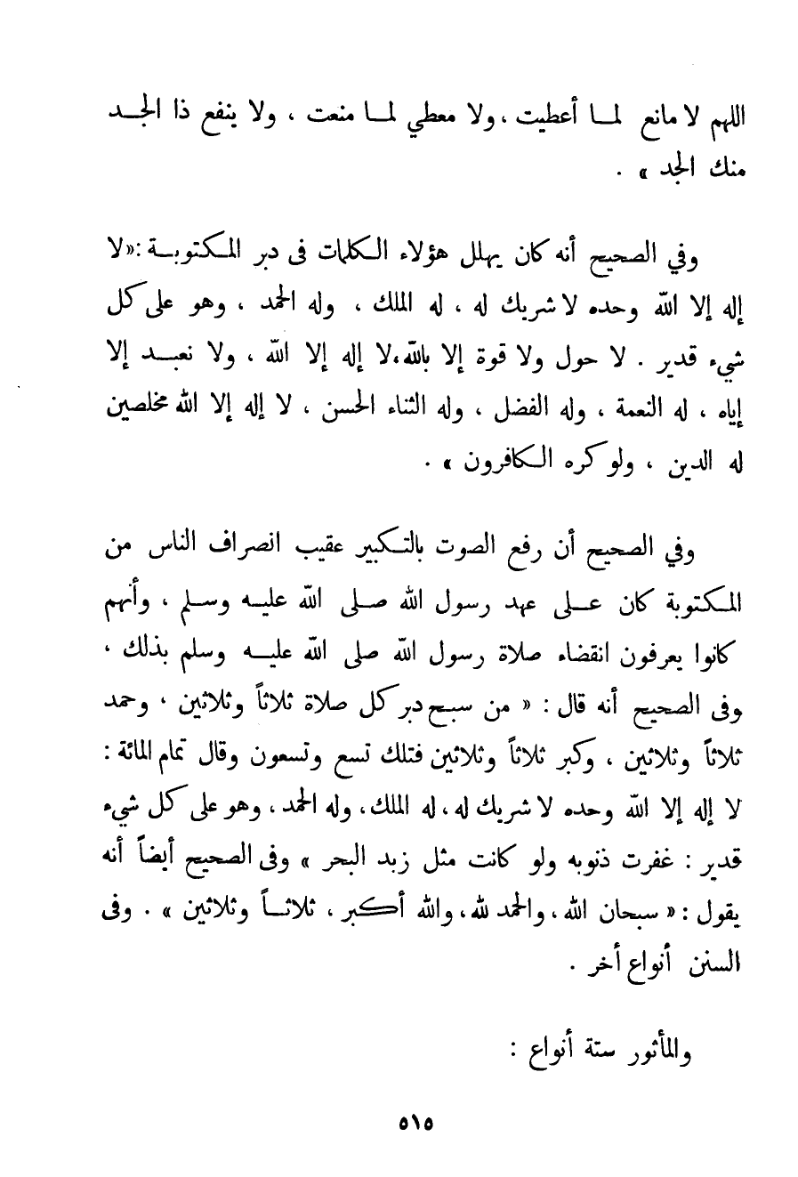 اللَّهُمَّ لَا مَانِعَ لِمَا أَعْطَيْت وَلَا مُعْطِيَ لِمَا مَنَعْت وَلَا يَنْفَعُ ذَا الْجَدِّ مِنْك الْجَدُّ} . وَفِي الصَّحِيحِ أَنَّهُ كَانَ يُهَلِّلُ هَؤُلَاءِ الْكَلِمَاتِ فِي دُبُرِ الْمَكْتُوبَةِ: {لَا إلَهَ إلَّا اللَّهُ وَحْدَهُ لَا شَرِيكَ لَهُ لَهُ الْمُلْكُ وَلَهُ الْحَمْدُ وَهُوَ عَلَى كُلِّ شَيْءٍ قَدِيرٌ. لَا حَوْلَ وَلَا قُوَّةَ إلَّا بِاَللَّهِ لَا إلَهَ إلَّا اللَّهُ وَلَا نَعْبُدُ إلَّا إيَّاهُ لَهُ النِّعْمَةُ وَلَهُ الْفَضْلُ وَلَهُ الثَّنَاءُ الْحَسَنُ لَا إلَهَ إلَّا اللَّهُ مُخْلِصِينَ لَهُ الدِّينَ وَلَوْ كَرِهَ الْكَافِرُونَ} . وَفِي الصَّحِيحِ {أَنَّ رَفْعَ الصَّوْتِ بِالتَّكْبِيرِ عَقِيبَ انْصِرَافِ النَّاسِ مِنْ الْمَكْتُوبَةِ كَانَ عَلَى عَهْدِ رَسُولِ اللَّهِ صَلَّى اللَّهُ عَلَيْهِ وَسَلَّمَ} وَأَنَّهُمْ كَانُوا يَعْرِفُونَ انْقِضَاءَ صَلَاةِ رَسُولِ اللَّهِ صَلَّى اللَّهُ عَلَيْهِ وَسَلَّمَ بِذَلِكَ وَفِي الصَّحِيحِ أَنَّهُ قَالَ: {مَنْ سَبَّحَ دُبُرَ كُلِّ صَلَاةٍ ثَلَاثًا وَثَلَاثِينَ وَحَمِدَ ثَلَاثًا وَثَلَاثِينَ وَكَبَّرَ ثَلَاثًا وَثَلَاثِينَ فَتِلْكَ تِسْعٌ وَتِسْعُونَ وَقَالَ تَمَامَ الْمِائَةِ: لَا إلَهَ إلَّا اللَّهُ وَحْدَهُ لَا شَرِيكَ لَهُ لَهُ الْمُلْكُ وَلَهُ الْحَمْدُ وَهُوَ عَلَى كُلِّ شَيْءٍ قَدِيرٌ: غُفِرَتْ ذُنُوبُهُ وَلَوْ كَانَتْ مِثْلَ زَبَدِ الْبَحْرِ} وَفِي الصَّحِيحِ أَيْضًا أَنَّهُ يَقُولُ: {سُبْحَانَ اللَّهِ وَالْحَمْدُ لِلَّهِ وَاَللَّهُ أَكْبَرُ ثَلَاثًا وَثَلَاثِينَ} . وَفِي السُّنَنِ أَنْوَاعٌ أُخَرُ. وَالْمَأْثُورُ سِتَّةُ أَنْوَاعٍ: