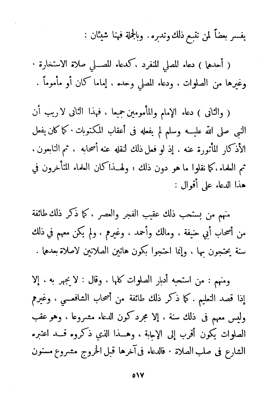 يُفَسِّرُ بَعْضًا لِمَنْ تَتَبَّعَ ذَلِكَ وَتَدَبَّرَهُ. وَبِالْجُمْلَةِ فَهُنَا شَيْئَانِ: أَحَدُهُمَا دُعَاءُ الْمُصَلِّي الْمُنْفَرِدِ كَدُعَاءِ الْمُصَلِّي صَلَاةَ الِاسْتِخَارَةِ وَغَيْرِهَا مِنْ الصَّلَوَاتِ وَدُعَاءِ الْمُصَلِّي وَحْدَهُ إمَامًا كَانَ أَوْ مَأْمُومًا. وَالثَّانِي دُعَاءُ الْإِمَامِ وَالْمَأْمُومِينَ جَمِيعًا فَهَذَا الثَّانِي لَا رَيْبَ أَنَّ النَّبِيَّ صَلَّى اللَّهُ عَلَيْهِ وَسَلَّمَ لَمْ يَفْعَلْهُ فِي أَعْقَابِ الْمَكْتُوبَاتِ كَمَا كَانَ يَفْعَلُ الْأَذْكَارَ الْمَأْثُورَةَ عَنْهُ إذْ لَوْ فَعَلَ ذَلِكَ لَنَقَلَهُ عَنْهُ أَصْحَابُهُ ثُمَّ التَّابِعُونَ ثُمَّ الْعُلَمَاءُ كَمَا نَقَلُوا مَا هُوَ دُونَ ذَلِكَ؛ وَلِهَذَا كَانَ الْعُلَمَاءُ الْمُتَأَخِّرُونَ فِي هَذَا الدُّعَاءِ عَلَى أَقْوَالٍ: مِنْهُمْ مَنْ يَسْتَحِبُّ ذَلِكَ عَقِيبَ الْفَجْرِ وَالْعَصْرِ كَمَا ذَكَرَ ذَلِكَ طَائِفَةٌ مِنْ أَصْحَابِ أَبِي حَنِيفَةَ وَمَالِكٍ وَأَحْمَد وَغَيْرِهِمْ وَلَمْ يَكُنْ مَعَهُمْ فِي ذَلِكَ سُنَّةٌ يَحْتَجُّونَ بِهَا وَإِنَّمَا احْتَجُّوا بِكَوْنِ هَاتَيْنِ الصَّلَاتَيْنِ لَا صَلَاةَ بَعْدَهُمَا. وَمِنْهُمْ: مَنْ اسْتَحَبَّهُ أَدْبَارَ الصَّلَوَاتِ كُلِّهَا وَقَالَ: لَا يَجْهَرُ بِهِ إلَّا إذَا قَصَدَ التَّعْلِيمَ. كَمَا ذَكَرَ ذَلِكَ طَائِفَةٌ مِنْ أَصْحَابِ الشَّافِعِيِّ وَغَيْرِهِمْ وَلَيْسَ مَعَهُمْ فِي ذَلِكَ سُنَّةٌ إلَّا مُجَرَّدَ كَوْنِ الدُّعَاءِ مَشْرُوعًا وَهُوَ عَقِبَ الصَّلَوَاتِ يَكُونُ أَقْرَبَ إلَى الْإِجَابَةِ وَهَذَا الَّذِي ذَكَرُوهُ قَدْ اعْتَبَرَهُ الشَّارِعُ فِي صُلْبِ الصَّلَاةِ فَالدُّعَاءُ فِي آخِرِهَا قَبْلَ الْخُرُوجِ مَشْرُوعٌ مَسْنُونٌ