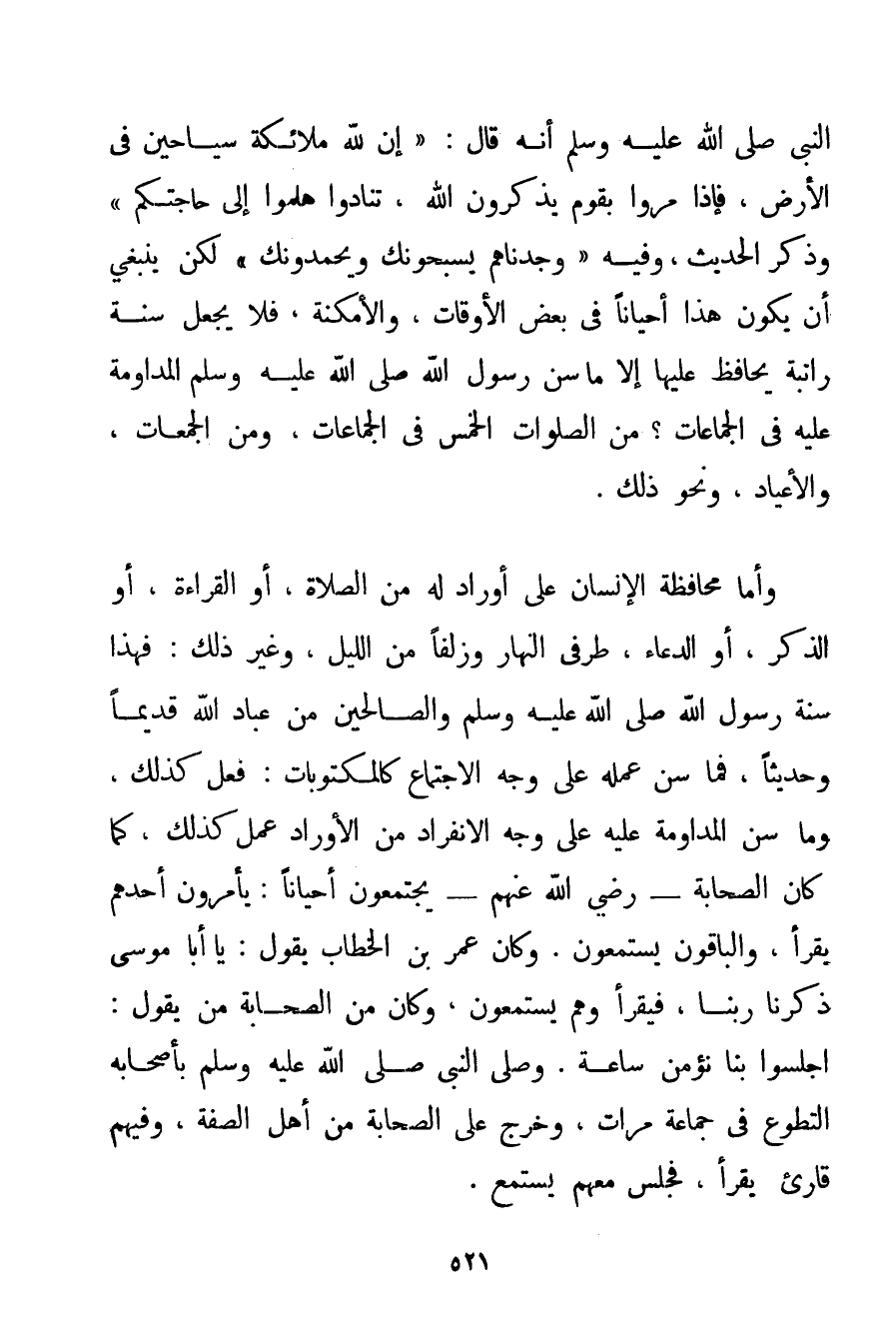 النَّبِيِّ صَلَّى اللَّهُ عَلَيْهِ وَسَلَّمَ أَنَّهُ قَالَ: {إنَّ لِلَّهِ مَلَائِكَةً سَيَّاحِينَ فِي الْأَرْضِ فَإِذَا مَرُّوا بِقَوْمِ يَذْكُرُونَ اللَّهَ تَنَادَوْا هَلُمُّوا إلَى حَاجَتِكُمْ} وَذَكَرَ الْحَدِيثَ وَفِيهِ {وَجَدْنَاهُمْ يُسَبِّحُونَك وَيَحْمَدُونَك} لَكِنْ يَنْبَغِي أَنْ يَكُونَ هَذَا أَحْيَانًا فِي بَعْضِ الْأَوْقَاتِ وَالْأَمْكِنَةِ فَلَا يُجْعَلُ سُنَّةً رَاتِبَةً يُحَافَظُ عَلَيْهَا إلَّا مَا سَنَّ رَسُولُ اللَّهِ صَلَّى اللَّهُ عَلَيْهِ وَسَلَّمَ الْمُدَاوَمَةَ عَلَيْهِ فِي الْجَمَاعَاتِ؟ مِنْ الصَّلَوَاتِ الْخَمْسِ فِي الْجَمَاعَاتِ وَمِنْ الْجُمُعَاتِ وَالْأَعْيَادِ وَنَحْوِ ذَلِكَ. وَأَمَّا مُحَافَظَةُ الْإِنْسَانِ عَلَى أَوْرَادٍ لَهُ مِنْ الصَّلَاةِ أَوْ الْقِرَاءَةِ أَوْ الذِّكْرِ أَوْ الدُّعَاءِ طَرَفَيْ النَّهَارِ وَزُلَفًا مِنْ اللَّيْلِ وَغَيْرُ ذَلِكَ: فَهَذَا سُنَّةُ رَسُولِ اللَّهِ صَلَّى اللَّهُ عَلَيْهِ وَسَلَّمَ وَالصَّالِحِينَ مِنْ عِبَادِ اللَّهِ قَدِيمًا وَحَدِيثًا فَمَا سُنَّ عَمَلُهُ عَلَى وَجْهِ الِاجْتِمَاعِ كَالْمَكْتُوبَاتِ: فُعِلَ كَذَلِكَ وَمَا سُنَّ الْمُدَاوَمَةُ عَلَيْهِ عَلَى وَجْهِ الِانْفِرَادِ مِنْ الْأَوْرَادِ عُمِلَ كَذَلِكَ كَمَا كَانَ الصَّحَابَةُ - رَضِيَ اللَّهُ عَنْهُمْ - يَجْتَمِعُونَ أَحْيَانًا: يَأْمُرُونَ أَحَدَهُمْ يَقْرَأُ وَالْبَاقُونَ يَسْتَمِعُونَ. وَكَانَ عُمَرُ بْنُ الْخَطَّابِ يَقُولُ: يَا أَبَا مُوسَى ذَكِّرْنَا رَبَّنَا فَيَقْرَأُ وَهُمْ يَسْتَمِعُونَ وَكَانَ مِنْ الصَّحَابَةِ مَنْ يَقُولُ: اجْلِسُوا بِنَا نُؤْمِنُ سَاعَةً. وَصَلَّى النَّبِيُّ صَلَّى اللَّهُ عَلَيْهِ وَسَلَّمَ بِأَصْحَابِهِ التَّطَوُّعَ فِي جَمَاعَةٍ مَرَّاتٍ وَخَرَجَ عَلَى الصَّحَابَةِ مِنْ أَهْلِ الصُّفَّةِ وَفِيهِمْ قَارِئٌ يَقْرَأُ فَجَلَسَ مَعَهُمْ يَسْتَمِعُ.