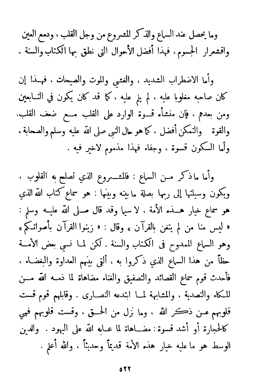 وَمَا يَحْصُلُ عِنْدَ السَّمَاعِ وَالذِّكْرِ الْمَشْرُوعِ مِنْ وَجَلِ الْقَلْبِ وَدَمْعِ الْعَيْنِ وَاقْشِعْرَارِ الْجُسُومِ فَهَذَا أَفْضَلُ الْأَحْوَالِ الَّتِي نَطَقَ بِهَا الْكِتَابُ وَالسُّنَّةُ. وَأَمَّا الِاضْطِرَابُ الشَّدِيدُ وَالْغَشْيُ وَالْمَوْتُ وَالصَّيْحَاتُ فَهَذَا إنْ كَانَ صَاحِبُهُ مَغْلُوبًا عَلَيْهِ لَمْ يُلَمْ عَلَيْهِ كَمَا قَدْ كَانَ يَكُونُ فِي التَّابِعِينَ وَمَنْ بَعْدَهُمْ فَإِنَّ مَنْشَأَهُ قُوَّةُ الْوَارِدِ عَلَى الْقَلْبِ مَعَ ضَعْفِ الْقَلْبِ وَالْقُوَّةُ وَالتَّمَكُّنُ أَفْضَلُ كَمَا هُوَ حَالُ النَّبِيِّ صَلَّى اللَّهُ عَلَيْهِ وَسَلَّمَ وَالصَّحَابَةِ وَأَمَّا السُّكُونُ قَسْوَةً وَجَفَاءً فَهَذَا مَذْمُومٌ لَا خَيْرَ فِيهِ. وَأَمَّا مَا ذُكِرَ مِنْ السَّمَاعِ: فَالْمَشْرُوعُ الَّذِي تَصْلُحُ بِهِ الْقُلُوبُ وَيَكُونُ وَسِيلَتَهَا إلَى رَبِّهَا بِصِلَةِ مَا بَيْنَهُ وَبَيْنَهَا: هُوَ سَمَاعُ كِتَابِ اللَّهِ الَّذِي هُوَ سَمَاعُ خِيَارِ هَذِهِ الْأُمَّةِ لَا سِيَّمَا وَقَدْ قَالَ صَلَّى اللَّهُ عَلَيْهِ وَسَلَّمَ {لَيْسَ مِنَّا مَنْ لَمْ يَتَغَنَّ بِالْقُرْآنِ} وَقَالَ: {زَيِّنُوا الْقُرْآنَ بِأَصْوَاتِكُمْ} وَهُوَ السَّمَاعُ الْمَمْدُوحُ فِي الْكِتَابِ وَالسُّنَّةِ. لَكِنْ لَمَّا نَسِيَ بَعْضُ الْأُمَّةِ حَظًّا مِنْ هَذَا السَّمَاعِ الَّذِي ذُكِّرُوا بِهِ أَلْقَى بَيْنَهُمْ الْعَدَاوَةَ وَالْبَغْضَاءَ فَأَحْدَثَ قَوْمٌ سَمَاعَ الْقَصَائِدِ وَالتَّصْفِيقَ وَالْغِنَاءَ مُضَاهَاةً لِمَا ذَمَّهُ اللَّهُ مِنْ الْمُكَاءِ وَالتَّصْدِيَةِ وَالْمُشَابَهَةِ لِمَا ابْتَدَعَهُ النَّصَارَى وَقَابَلَهُمْ قَوْمٌ قَسَتْ قُلُوبُهُمْ عَنْ ذِكْرِ اللَّهِ وَمَا نَزَلَ مِنْ الْحَقِّ وَقَسَتْ قُلُوبُهُمْ فَهِيَ كَالْحِجَارَةِ أَوْ أَشَدُّ قَسْوَةً: مُضَاهَاةً لِمَا عَابَهُ اللَّهُ عَلَى الْيَهُودِ. وَالدِّينُ الْوَسَطُ هُوَ مَا عَلَيْهِ خِيَارُ هَذِهِ الْأُمَّةِ قَدِيمًا وَحَدِيثًا وَاَللَّهُ أَعْلَمُ.