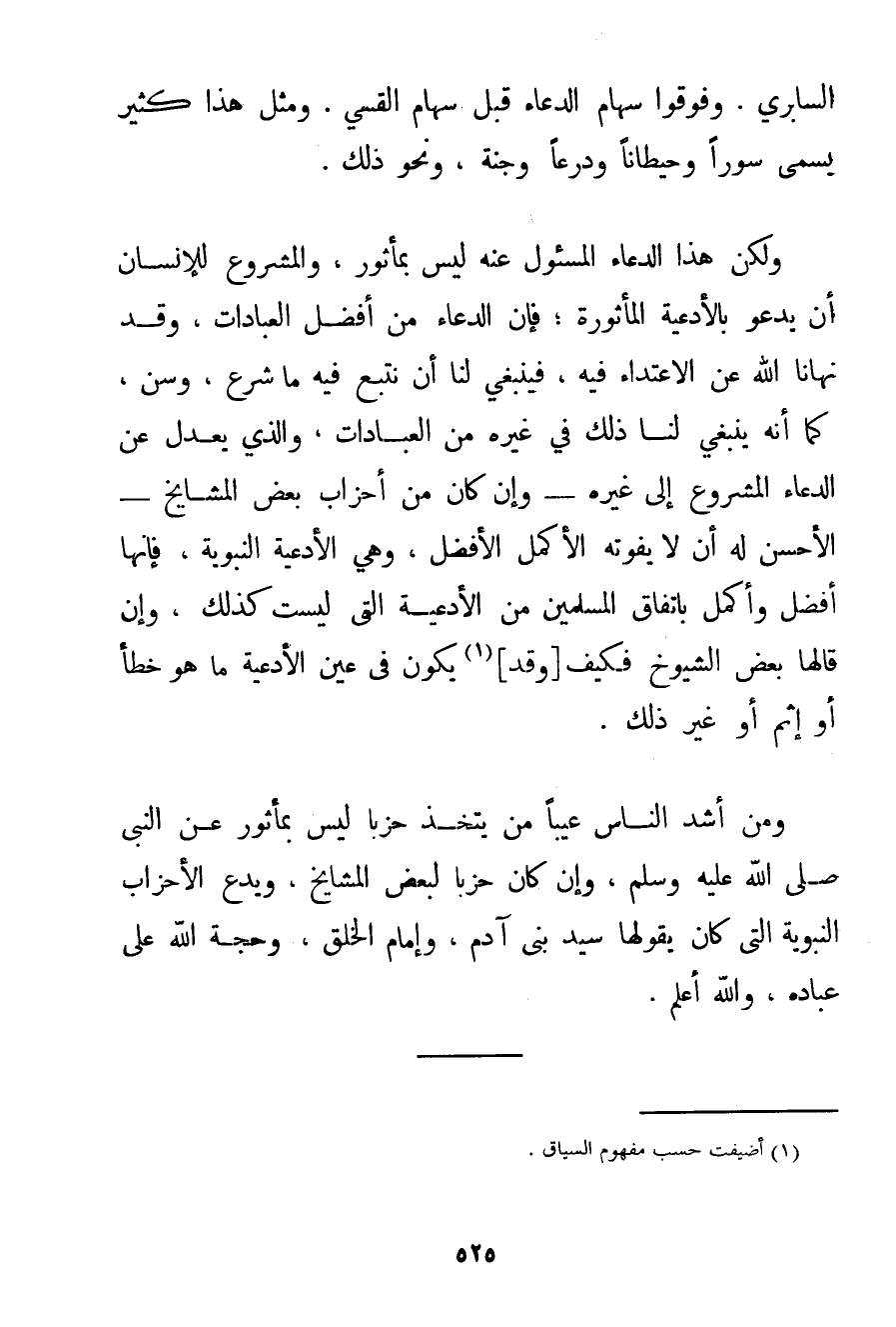 السابري. وَفُوقُوا سِهَامَ الدُّعَاءِ قَبْلَ سِهَامِ الْقِسِيِّ. وَمِثْلُ هَذَا كَثِيرٌ يُسَمَّى سُورًا وَحِيطَانًا وَدِرْعًا وَجُنَّةً وَنَحْوَ ذَلِكَ. وَلَكِنَّ هَذَا الدُّعَاءَ الْمَسْئُولَ عَنْهُ لَيْسَ بِمَأْثُورِ وَالْمَشْرُوعُ لِلْإِنْسَانِ أَنْ يَدْعُوَ بِالْأَدْعِيَةِ الْمَأْثُورَةِ؛ فَإِنَّ الدُّعَاءَ مِنْ أَفْضَلِ الْعِبَادَاتِ وَقَدْ نَهَانَا اللَّهُ عَنْ الِاعْتِدَاءِ فِيهِ فَيَنْبَغِي لَنَا أَنْ نَتَّبِعَ فِيهِ مَا شُرِعَ وَسُنَّ كَمَا أَنَّهُ يَنْبَغِي لَنَا ذَلِكَ فِي غَيْرِهِ مِنْ الْعِبَادَاتِ وَاَلَّذِي يَعْدِلُ عَنْ الدُّعَاءِ الْمَشْرُوعِ إلَى غَيْرِهِ - وَإِنْ كَانَ مِنْ أَحْزَابِ بَعْضِ الْمَشَايِخِ - الْأَحْسَنُ لَهُ أَنْ لَا يَفُوتَهُ الْأَكْمَلُ الْأَفْضَلُ وَهِيَ الْأَدْعِيَةُ النَّبَوِيَّةُ فَإِنَّهَا أَفْضَلُ وَأَكْمَلُ بِاتِّفَاقِ الْمُسْلِمِينَ مِنْ الْأَدْعِيَةِ الَّتِي لَيْسَتْ كَذَلِكَ وَإِنْ قَالَهَا بَعْضُ الشُّيُوخِ فَكَيْفَ [وَقَدْ] (1) يَكُونُ فِي عَيْنِ الْأَدْعِيَةِ مَا هُوَ خَطَأٌ أَوْ إثْمٌ أَوْ غَيْرُ ذَلِكَ. وَمِنْ أَشَدِّ النَّاسِ عَيْبًا مَنْ يَتَّخِذُ حِزْبًا لَيْسَ بِمَأْثُورِ عَنْ النَّبِيِّ صَلَّى اللَّهُ عَلَيْهِ وَسَلَّمَ وَإِنْ كَانَ حِزْبًا لِبَعْضِ الْمَشَايِخِ وَيَدَعُ الْأَحْزَابَ النَّبَوِيَّةَ الَّتِي كَانَ يَقُولُهَا سَيِّدُ بَنِي آدَمَ وَإِمَامُ الْخَلْقِ وَحُجَّةُ اللَّهِ عَلَى عِبَادِهِ وَاَللَّهُ أَعْلَمُ.