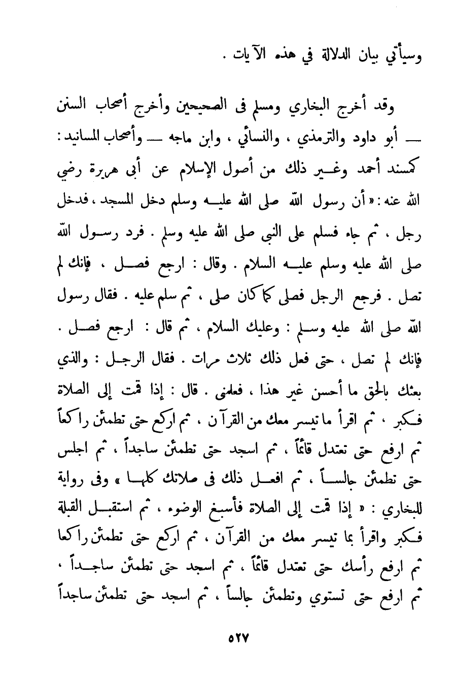 وَقُومُوا لِلَّهِ قَانِتِينَ} وَسَيَأْتِي بَيَانُ الدَّلَالَةِ فِي هَذِهِ الْآيَاتِ. وَقَدْ أَخْرَجَ الْبُخَارِيُّ وَمُسْلِمٌ فِي الصَّحِيحَيْنِ وَأَخْرَجَ أَصْحَابُ السُّنَنِ - أَبُو دَاوُد وَالتِّرْمِذِيُّ وَالنَّسَائِي وَابْنُ مَاجَه - وَأَصْحَابُ الْمَسَانِيدِ: كَمُسْنَدِ أَحْمَد وَغَيْرِ ذَلِكَ مِنْ أُصُولِ الْإِسْلَامِ عَنْ أَبِي هُرَيْرَةَ رَضِيَ اللَّهُ عَنْهُ {أَنَّ رَسُولَ اللَّهِ صَلَّى اللَّهُ عَلَيْهِ وَسَلَّمَ دَخَلَ الْمَسْجِدَ فَدَخَلَ رَجُلٌ ثُمَّ جَاءَ فَسَلَّمَ عَلَى النَّبِيِّ صَلَّى اللَّهُ عَلَيْهِ وَسَلَّمَ. فَرَدَّ رَسُولُ اللَّهِ صَلَّى اللَّهُ عَلَيْهِ وَسَلَّمَ عَلَيْهِ السَّلَامَ. وَقَالَ: ارْجِعْ فَصَلِّ فَإِنَّك لَمْ تُصَلِّ. فَرَجَعَ الرَّجُلُ فَصَلَّى كَمَا كَانَ صَلَّى ثُمَّ سَلَّمَ عَلَيْهِ. فَقَالَ رَسُولُ اللَّهِ صَلَّى اللَّهُ عَلَيْهِ وَسَلَّمَ وَعَلَيْك السَّلَامُ ثُمَّ قَالَ: ارْجِعْ فَصَلِّ. فَإِنَّك لَمْ تُصَلِّ حَتَّى فَعَلَ ذَلِكَ ثَلَاثَ مَرَّاتٍ. فَقَالَ الرَّجُلُ: وَاَلَّذِي بَعَثَك بِالْحَقِّ مَا أُحْسِنُ غَيْرَ هَذَا فَعَلِّمْنِي. قَالَ: إذَا قُمْت إلَى الصَّلَاةِ فَكَبِّرْ ثُمَّ اقْرَأْ مَا تَيَسَّرَ مَعَك مِنْ الْقُرْآنِ ثُمَّ ارْكَعْ حَتَّى تَطْمَئِنَّ رَاكِعًا ثُمَّ ارْفَعْ حَتَّى تَعْتَدِلَ قَائِمًا ثُمَّ اُسْجُدْ حَتَّى تَطْمَئِنَّ سَاجِدًا ثُمَّ اجْلِسْ حَتَّى تَطْمَئِنّ جَالِسًا ثُمَّ افْعَلْ ذَلِكَ فِي صَلَاتِك كُلِّهَا} وَفِي رِوَايَةٍ لِلْبُخَارِيِّ: {إذَا قُمْت إلَى الصَّلَاةِ فَأَسْبِغْ الْوُضُوءَ ثُمَّ اسْتَقْبِلْ الْقِبْلَةَ فَكَبِّرْ وَاقْرَأْ بِمَا تَيَسَّرَ مَعَك مِنْ الْقُرْآنِ ثُمَّ ارْكَعْ حَتَّى تَطْمَئِنّ رَاكِعًا ثُمَّ ارْفَعْ رَأْسَك حَتَّى تَعْتَدِلَ قَائِمًا ثُمَّ اُسْجُدْ حَتَّى تَطْمَئِنَّ سَاجِدًا ثُمَّ ارْفَعْ حَتَّى تَسْتَوِيَ وَتَطْمَئِنَّ جَالِسًا ثُمَّ اُسْجُدْ حَتَّى تَطْمَئِنَّ سَاجِدًا