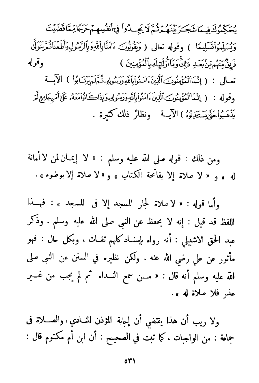 يُحَكِّمُوكَ فِيمَا شَجَرَ بَيْنَهُمْ ثُمَّ لَا يَجِدُوا فِي أَنْفُسِهِمْ حَرَجًا مِمَّا قَضَيْتَ وَيُسَلِّمُوا تَسْلِيمًا} وقَوْله تَعَالَى {وَيَقُولُونَ آمَنَّا بِاللَّهِ وَبِالرَّسُولِ وَأَطَعْنَا ثُمَّ يَتَوَلَّى فَرِيقٌ مِنْهُمْ مِنْ بَعْدِ ذَلِكَ وَمَا أُولَئِكَ بِالْمُؤْمِنِينَ} وقَوْله تَعَالَى {إنَّمَا الْمُؤْمِنُونَ الَّذِينَ آمَنُوا بِاللَّهِ وَرَسُولِهِ ثُمَّ لَمْ يَرْتَابُوا} - الْآيَةَ وَقَوْلِهِ: {إنَّمَا الْمُؤْمِنُونَ الَّذِينَ آمَنُوا بِاللَّهِ وَرَسُولِهِ وَإِذَا كَانُوا مَعَهُ عَلَى أَمْرٍ جَامِعٍ لَمْ يَذْهَبُوا حَتَّى يَسْتَأْذِنُوهُ} - الْآيَةَ وَنَظَائِرُ ذَلِكَ كَثِيرَةٌ. وَمِنْ ذَلِكَ: قَوْلُهُ صَلَّى اللَّهُ عَلَيْهِ وَسَلَّمَ {لَا إيمَانَ لِمَنْ لَا أَمَانَةَ لَهُ} و {لَا صَلَاةَ إلَّا بِفَاتِحَةِ الْكِتَابِ} و {لَا صَلَاةَ إلَّا بِوُضُوءِ} . وَأَمَّا قَوْلُهُ: {لَا صَلَاةَ لِجَارِ الْمَسْجِدِ إلَّا فِي الْمَسْجِدِ} فَهَذَا اللَّفْظُ قَدْ قِيلَ: إنَّهُ لَا يُحْفَظُ عَنْ النَّبِيِّ صَلَّى اللَّهُ عَلَيْهِ وَسَلَّمَ. وَذَكَرَ عَبْدُ الْحَقِّ الإشبيلي: أَنَّهُ رَوَاهُ بِإِسْنَادِ كُلُّهُمْ ثِقَاتٌ وَبِكُلِّ حَالٍ: فَهُوَ مَأْثُورٌ عَنْ عَلِيٍّ رَضِيَ اللَّهُ عَنْهُ وَلَكِنَّ نَظِيرَهُ فِي السُّنَنِ عَنْ النَّبِيِّ صَلَّى اللَّهُ عَلَيْهِ وَسَلَّمَ أَنَّهُ قَالَ: {مَنْ سَمِعَ النِّدَاءَ ثُمَّ لَمْ يُجِبْ مِنْ غَيْرِ عُذْرٍ فَلَا صَلَاةَ لَهُ} . وَلَا رَيْبَ أَنَّ هَذَا يَقْتَضِي أَنَّ إجَابَةَ الْمُؤَذِّنِ الْمُنَادِيَ وَالصَّلَاةَ فِي جَمَاعَةٍ: مِنْ الْوَاجِبَاتِ كَمَا ثَبَتَ فِي الصَّحِيحِ: أَنَّ ابْنَ أُمِّ مَكْتُومٍ قَالَ: