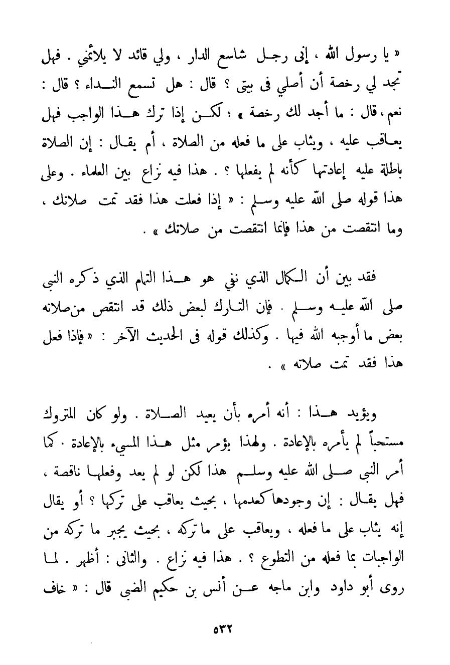 {يَا رَسُولَ اللَّهِ إنِّي رَجُلٌ شَاسِعُ الدَّارِ وَلِي قَائِدٌ لَا يُلَائِمُنِي. فَهَلْ تَجِدُ لِي رُخْصَةً أَنْ أُصَلِّيَ فِي بَيْتِي؟ قَالَ: هَلْ تَسْمَعُ النِّدَاءَ؟ قَالَ: نَعَمْ قَالَ: مَا أَجِدُ لَك رُخْصَةً} لَكِنْ إذَا تَرَكَ هَذَا الْوَاجِبَ فَهَلْ يُعَاقَبُ عَلَيْهِ وَيُثَابُ عَلَى مَا فَعَلَهُ مِنْ الصَّلَاةِ أَمْ يُقَالُ. إنَّ الصَّلَاةَ بَاطِلَةٌ عَلَيْهِ إعَادَتُهَا كَأَنَّهُ لَمْ يَفْعَلْهَا؟ . هَذَا فِيهِ نِزَاعٌ بَيْنَ الْعُلَمَاءِ. وَعَلَى هَذَا قَوْلُهُ صَلَّى اللَّهُ عَلَيْهِ وَسَلَّمَ {إذَا فَعَلْت هَذَا فَقَدْ تَمَّتْ صَلَاتُك وَمَا انْتَقَصْت مِنْ هَذَا فَإِنَّمَا انْتَقَصْت مِنْ صَلَاتِك} . فَقَدْ بَيَّنَ أَنَّ الْكَمَالَ الَّذِي نُفِيَ هُوَ هَذَا التَّمَامُ الَّذِي ذَكَرَهُ النَّبِيُّ صَلَّى اللَّهُ عَلَيْهِ وَسَلَّمَ. فَإِنَّ التَّارِكَ لِبَعْضِ ذَلِكَ قَدْ انْتَقَصَ مِنْ صَلَاتِهِ بَعْضَ مَا أَوْجَبَهُ اللَّهُ فِيهَا. وَكَذَلِكَ قَوْلُهُ فِي الْحَدِيثِ الْآخَرِ: {فَإِذَا فَعَلَ هَذَا فَقَدَ تَمَّتْ صَلَاتُهُ} . وَيُؤَيِّدُ هَذَا: أَنَّهُ أَمَرَهُ بِأَنْ يُعِيدَ الصَّلَاةَ. وَلَوْ كَانَ الْمَتْرُوكُ مُسْتَحَبًّا لَمْ يَأْمُرْهُ بِالْإِعَادَةِ. وَلِهَذَا يُؤْمَرُ مِثْلُ هَذَا الْمُسِيءِ بِالْإِعَادَةِ كَمَا أَمَرَ النَّبِيُّ صَلَّى اللَّهُ عَلَيْهِ وَسَلَّمَ هَذَا لَكِنْ لَوْ لَمْ يَعُدْ وَفَعَلَهَا نَاقِصَةً فَهَلْ يُقَالُ: إنَّ وُجُودَهَا كَعَدَمِهَا بِحَيْثُ يُعَاقَبُ عَلَى تَرْكِهَا؟ أَوْ يُقَالُ إنَّهُ يُثَابُ عَلَى مَا فَعَلَهُ وَيُعَاقَبُ عَلَى مَا تَرَكَهُ بِحَيْثُ يَجْبُرُ مَا تَرَكَهُ مِنْ الْوَاجِبَاتِ بِمَا فَعَلَهُ مِنْ التَّطَوُّعِ؟ . هَذَا فِيهِ نِزَاعٌ. وَالثَّانِي: أَظْهَرُ. لِمَا رَوَى أَبُو دَاوُد وَابْنُ مَاجَه عَنْ أَنَسِ بْنِ حَكِيمٍ الضبي قَالَ: {خَافَ