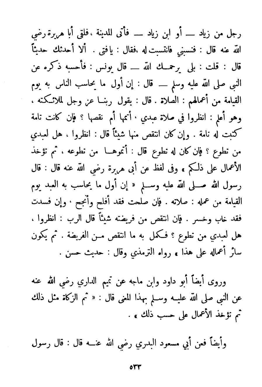 رَجُلٌ مِنْ زِيَادٍ - أَوْ ابْنِ زِيَادٍ - فَأَتَى الْمَدِينَةَ فَلَقِيَ أَبَا هُرَيْرَةَ رَضِيَ اللَّهُ عَنْهُ قَالَ: فَنَسَبَنِي فَانْتَسَبْت لَهُ فَقَالَ: يَا فَتَى. أَلَا أُحَدِّثُك حَدِيثًا قَالَ: قُلْت: بَلَى يَرْحَمُك اللَّهُ - قَالَ يُونُسُ: فَأَحْسَبُهُ ذَكَرَهُ عَنْ النَّبِيِّ صَلَّى اللَّهُ عَلَيْهِ وَسَلَّمَ - قَالَ: إنَّ أَوَّلَ مَا يُحَاسَبُ النَّاسُ بِهِ يَوْمَ الْقِيَامَةِ مِنْ أَعْمَالِهِمْ: الصَّلَاةُ. قَالَ: يَقُولُ رَبُّنَا عَزَّ وَجَلَّ لِمَلَائِكَتِهِ وَهُوَ أَعْلَمُ: اُنْظُرُوا فِي صَلَاةِ عَبْدِي أَتَمَّهَا أَمْ نَقَصَهَا؟ فَإِنْ كَانَتْ تَامَّةً كُتِبَتْ لَهُ تَامَّةً. وَإِنْ كَانَ انْتَقَصَ مِنْهَا شَيْئًا قَالَ: اُنْظُرُوا هَلْ لِعَبْدِي مِنْ تَطَوُّعٍ؟ فَإِنْ كَانَ لَهُ تَطَوُّعٌ قَالَ: أَتِمُّوهَا مِنْ تَطَوُّعِهِ ثُمَّ تُؤْخَذُ الْأَعْمَالُ عَلَى ذَلِكُمْ} وَفِي لَفْظٍ عَنْ أَبِي هُرَيْرَةَ رَضِيَ اللَّهُ عَنْهُ قَالَ: قَالَ رَسُولُ اللَّهِ صَلَّى اللَّهُ عَلَيْهِ وَسَلَّمَ {إنَّ أَوَّلَ مَا يُحَاسَبُ بِهِ الْعَبْدُ يَوْمَ الْقِيَامَةِ مِنْ عَمَلِهِ: صَلَاتُهُ. فَإِنْ صَلُحَتْ فَقَدْ أَفْلَحَ وَأَنْجَحَ وَإِنْ فَسَدَتْ فَقَدْ خَابَ وَخَسِرَ. فَإِنْ انْتَقَصَ مِنْ فَرِيضَتِهِ شَيْئًا قَالَ الرَّبُّ: اُنْظُرُوا هَلْ لِعَبْدِي مَنْ تَطَوُّعٍ؟ فَكَمُلَ بِهِ مَا انْتَقَصَ مِنْ الْفَرِيضَةِ. ثُمَّ يَكُونُ سَائِرُ أَعْمَالِهِ عَلَى هَذَا} رَوَاهُ التِّرْمِذِيُّ وَقَالَ: حَدِيثٌ حَسَنٌ. وَرَوَى أَيْضًا أَبُو دَاوُد وَابْنُ مَاجَه عَنْ تَمِيمٍ الداري رَضِيَ اللَّهُ عَنْهُ عَنْ النَّبِيِّ صَلَّى اللَّهُ عَلَيْهِ وَسَلَّمَ بِهَذَا الْمَعْنَى قَالَ: {ثُمَّ الزَّكَاةُ مِثْلُ ذَلِكَ ثُمَّ تُؤْخَذُ الْأَعْمَالُ عَلَى حَسَبِ ذَلِكَ} .
