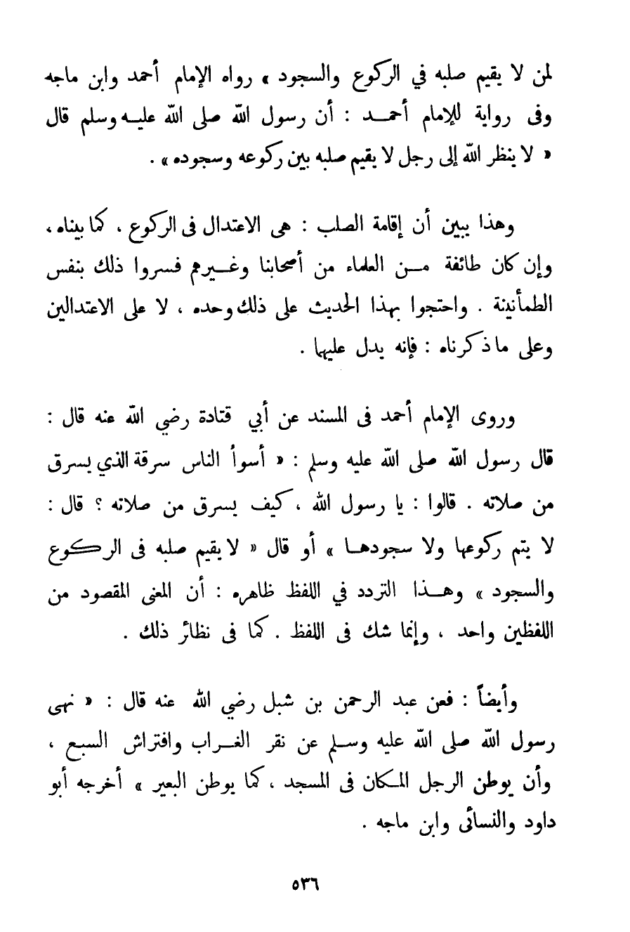 لِمَنْ لَا يُقِيمُ صُلْبَهُ فِي الرُّكُوعِ وَالسُّجُودِ} رَوَاهُ الْإِمَامُ أَحْمَد وَابْنُ مَاجَه وَفِي رِوَايَةٍ لِلْإِمَامِ أَحْمَد: أَنَّ رَسُولَ اللَّهِ صَلَّى اللَّهُ عَلَيْهِ وَسَلَّمَ قَالَ {لَا يَنْظُرُ اللَّهُ إلَى رَجُلٍ لَا يُقِيمُ صُلْبَهُ بَيْنَ رُكُوعِهِ وَسُجُودِهِ} . وَهَذَا يُبَيِّنُ أَنَّ إقَامَةَ الصُّلْبِ: هِيَ الِاعْتِدَالُ فِي الرُّكُوعِ كَمَا بَيَّنَّاهُ وَإِنْ كَانَ طَائِفَةٌ مِنْ الْعُلَمَاءِ مِنْ أَصْحَابِنَا وَغَيْرِهِمْ فَسَّرُوا ذَلِكَ بِنَفْسِ الطُّمَأْنِينَةِ. وَاحْتَجُّوا بِهَذَا الْحَدِيثِ عَلَى ذَلِكَ وَحْدَهُ لَا عَلَى الِاعْتِدَالَيْنِ وَعَلَى مَا ذَكَرْنَاهُ: فَإِنَّهُ يَدُلُّ عَلَيْهِمَا. وَرَوَى الْإِمَامُ أَحْمَد فِي الْمُسْنَدِ عَنْ أَبِي قتادة رَضِيَ اللَّهُ عَنْهُ قَالَ: قَالَ رَسُولُ اللَّهِ صَلَّى اللَّهُ عَلَيْهِ وَسَلَّمَ {أَسْوَأُ النَّاسِ سَرِقَةً الَّذِي يَسْرِقُ مِنْ صَلَاتِهِ. قَالُوا: يَا رَسُولَ اللَّهِ كَيْفَ يَسْرِقُ مِنْ صَلَاتِهِ؟ قَالَ: لَا يُتِمُّ رُكُوعَهَا وَلَا سُجُودَهَا} أَوْ قَالَ {لَا يُقِيمُ صُلْبَهُ فِي الرُّكُوعِ وَالسُّجُودِ} وَهَذَا التَّرَدُّدُ فِي اللَّفْظِ ظَاهِرُهُ: أَنَّ الْمَعْنَى الْمَقْصُودَ مِنْ اللَّفْظَيْنِ وَاحِدٌ وَإِنَّمَا شَكَّ فِي اللَّفْظِ. كَمَا فِي نَظَائِرِ ذَلِكَ. وَأَيْضًا: فَعَنْ عَبْدِ الرَّحْمَنِ بْنِ شِبْلٍ رَضِيَ اللَّهُ عَنْهُ قَالَ: {نَهَى رَسُولُ اللَّهِ صَلَّى اللَّهُ عَلَيْهِ وَسَلَّمَ عَنْ نَقْرِ الْغُرَابِ وَافْتِرَاشِ السَّبُعِ وَأَنْ يُوَطِّنَ الرَّجُلُ الْمَكَانَ فِي الْمَسْجِدِ كَمَا يُوَطِّنُ الْبَعِيرُ} أَخْرَجَهُ أَبُو دَاوُد وَالنَّسَائِي وَابْنُ مَاجَه. وَإِنَّمَا