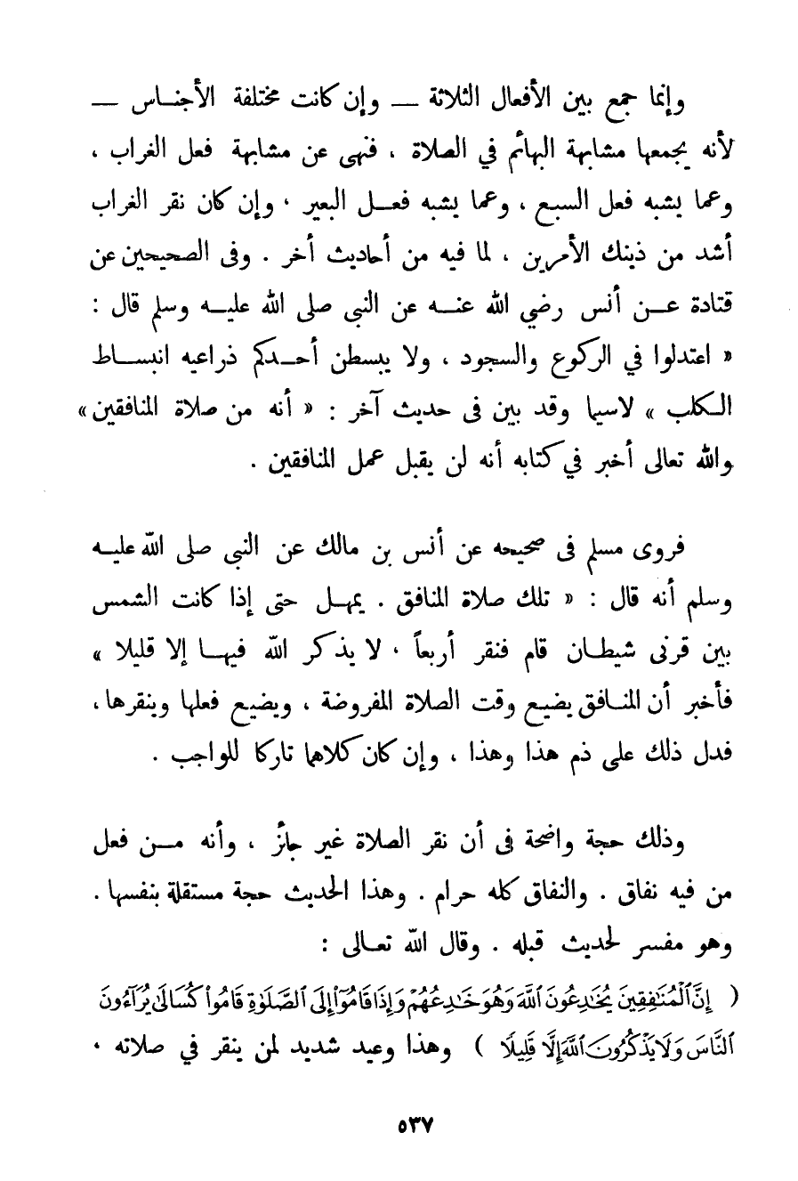 جَمَعَ بَيْنَ الْأَفْعَالِ الثَّلَاثَةِ - وَإِنْ كَانَتْ مُخْتَلِفَةَ الْأَجْنَاسِ - لِأَنَّهُ يَجْمَعُهَا مُشَابَهَةُ الْبَهَائِمِ فِي الصَّلَاةِ فَنَهَى عَنْ مُشَابَهَةِ فِعْلِ الْغُرَابِ وَعَمَّا يُشْبِهُ فِعْلَ السَّبُعِ وَعَمَّا يُشْبِهُ فِعْلَ الْبَعِيرِ وَإِنْ كَانَ نَقْرُ الْغُرَابِ أَشَدَّ مِنْ ذَيْنِك الْأَمْرَيْنِ لِمَا فِيهِ مِنْ أَحَادِيثَ أُخَرَ. وَفِي الصَّحِيحَيْنِ عَنْ قتادة عَنْ أَنَسٍ رَضِيَ اللَّهُ عَنْهُ عَنْ النَّبِيِّ صَلَّى اللَّهُ عَلَيْهِ وَسَلَّمَ قَالَ: {اعْتَدِلُوا فِي الرُّكُوعِ وَالسُّجُودِ وَلَا يَبْسُطَنَّ أَحَدُكُمْ ذِرَاعَيْهِ انْبِسَاطَ الْكَلْبِ} لَا سِيَّمَا وَقَدْ بَيَّنَ فِي حَدِيثٍ آخَرَ: {أَنَّهُ مِنْ صَلَاةِ الْمُنَافِقِينَ} وَاَللَّهُ تَعَالَى أَخْبَرَ فِي كِتَابِهِ أَنَّهُ لَنْ يَقْبَلَ عَمَلَ الْمُنَافِقِينَ. فَرَوَى مُسْلِمٌ فِي صَحِيحِهِ عَنْ أَنَسِ بْنِ مَالِكٍ عَنْ النَّبِيِّ صَلَّى اللَّهُ عَلَيْهِ وَسَلَّمَ أَنَّهُ قَالَ: {تِلْكَ صَلَاةُ الْمُنَافِقِ. يُمْهِلُ حَتَّى إذَا كَانَتْ الشَّمْسُ بَيْنَ قَرْنَيْ شَيْطَانٍ قَامَ فَنَقَرَ أَرْبَعًا لَا يَذْكُرُ اللَّهَ فِيهَا إلَّا قَلِيلًا} فَأَخْبَرَ أَنَّ الْمُنَافِقَ يُضَيِّعُ وَقْتَ الصَّلَاةِ الْمَفْرُوضَةِ وَيُضَيِّعُ فِعْلَهَا وَيَنْقُرُهَا فَدَلَّ ذَلِكَ عَلَى ذَمِّ هَذَا وَهَذَا وَإِنْ كَانَ كِلَاهُمَا تَارِكًا لِلْوَاجِبِ. وَذَلِكَ حُجَّةٌ وَاضِحَةٌ فِي أَنَّ نَقْرَ الصَّلَاةِ غَيْرُ جَائِزٍ وَأَنَّهُ مَنْ فِعْلِ مَنْ فِيهِ نِفَاقٌ. وَالنِّفَاقُ كُلُّهُ حَرَامٌ. وَهَذَا الْحَدِيثُ حُجَّةٌ مُسْتَقِلَّةٌ بِنَفْسِهَا. وَهُوَ مُفَسِّرٌ لِحَدِيثِ قَبْلَهُ. وَقَالَ اللَّهُ تَعَالَى: {إنَّ الْمُنَافِقِينَ يُخَادِعُونَ اللَّهَ وَهُوَ خَادِعُهُمْ وَإِذَا قَامُوا إلَى الصَّلَاةِ قَامُوا كُسَالَى يُرَاءُونَ النَّاسَ وَلَا يَذْكُرُونَ اللَّهَ إلَّا قَلِيلًا} وَهَذَا وَعِيدٌ شَدِيدٌ لِمَنْ يَنْقُرُ فِي صَلَاتِهِ