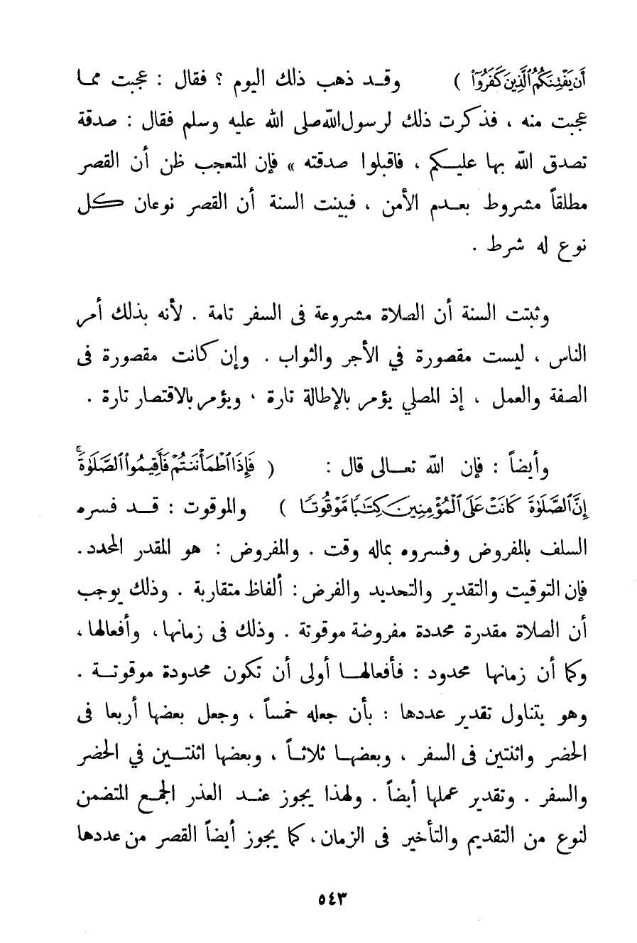 {إنْ خِفْتُمْ أَنْ يَفْتِنَكُمُ الَّذِينَ كَفَرُوا} وَقَدْ ذَهَبَ ذَلِكَ الْيَوْمَ؟ فَقَالَ: عَجِبْت مِمَّا عَجِبْت مِنْهُ فَذَكَرْت ذَلِكَ لِرَسُولِ اللَّهِ صَلَّى اللَّهُ عَلَيْهِ وَسَلَّمَ فَقَالَ: صَدَقَةٌ تَصَدَّقَ اللَّهُ بِهَا عَلَيْكُمْ فَاقْبَلُوا صَدَقَتَهُ} فَإِنَّ الْمُتَعَجِّبَ ظَنَّ أَنَّ الْقَصْرَ مُطْلَقًا مَشْرُوطٌ بِعَدَمِ الْأَمْنِ فَبَيَّنَتْ السُّنَّةُ أَنَّ الْقَصْرَ نَوْعَانِ كُلُّ نَوْعٍ لَهُ شَرْطٌ. وَثَبَتَتْ السُّنَّةُ أَنَّ الصَّلَاةَ مَشْرُوعَةٌ فِي السَّفَرِ تَامَّةٌ. لِأَنَّهُ بِذَلِكَ أَمَرَ النَّاسَ لَيْسَتْ مَقْصُورَةً فِي الْأَجْرِ وَالثَّوَابِ. وَإِنْ كَانَتْ مَقْصُورَةً فِي الصِّفَةِ وَالْعَمَلِ إذْ الْمُصَلِّي يُؤْمَرُ بِالْإِطَالَةِ تَارَةً وَيُؤْمَرُ بِالِاقْتِصَارِ تَارَةً. وَأَيْضًا: فَإِنَّ اللَّهَ تَعَالَى قَالَ: {فَإِذَا اطْمَأْنَنْتُمْ فَأَقِيمُوا الصَّلَاةَ إنَّ الصَّلَاةَ كَانَتْ عَلَى الْمُؤْمِنِينَ كِتَابًا مَوْقُوتًا} وَالْمَوْقُوتُ: قَدْ فَسَّرَهُ السَّلَفُ بِالْمَفْرُوضِ وَفَسَّرُوهُ بِمَا لَهُ وَقْتٌ. وَالْمَفْرُوضُ: هُوَ الْمُقَدَّرُ الْمُحَدَّدُ. فَإِنَّ التَّوْقِيتَ وَالتَّقْدِيرَ وَالتَّحْدِيدَ وَالْفَرْضَ: أَلْفَاظٌ مُتَقَارِبَةٌ. وَذَلِكَ يُوجِبُ أَنَّ الصَّلَاةَ مُقَدَّرَةٌ مُحَدَّدَةٌ مَفْرُوضَةٌ مَوْقُوتَةٌ. وَذَلِكَ فِي زَمَانِهَا وَأَفْعَالِهَا وَكَمَا أَنَّ زَمَانَهَا مَحْدُودٌ: فَأَفْعَالُهَا أَوْلَى أَنْ تَكُونَ مَحْدُودَةً مَوْقُوتَةً. وَهُوَ يَتَنَاوَلُ تَقْدِيرَ عَدَدِهَا: بِأَنْ جَعَلَهُ خَمْسًا وَجَعَلَ بَعْضَهَا أَرْبَعًا فِي الْحَضَرِ وَاثْنَتَيْنِ فِي السَّفَرِ وَبَعْضَهَا ثَلَاثًا وَبَعْضَهَا اثْنَتَيْنِ فِي الْحَضَرِ وَالسَّفَرِ. وَتَقْدِيرُ عَمَلِهَا أَيْضًا. وَلِهَذَا يَجُوزُ عِنْدَ الْعُذْرِ الْجَمْعُ الْمُتَضَمِّنُ لِنَوْعِ مِنْ التَّقْدِيمِ وَالتَّأْخِيرِ فِي الزَّمَانِ كَمَا يَجُوزُ أَيْضًا الْقَصْرُ مِنْ عَدَدِهَا