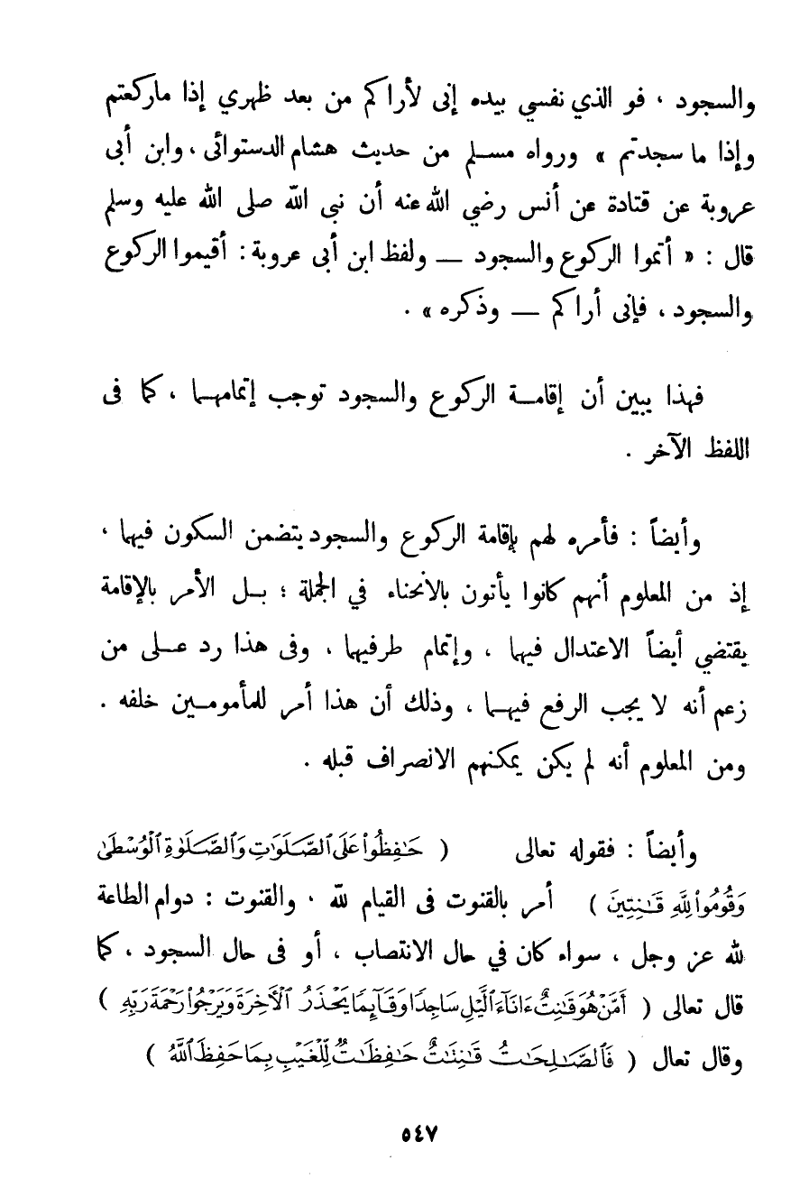 وَالسُّجُودَ فَوَاَلَّذِي نَفْسِي بِيَدِهِ إنِّي لَأَرَاكُمْ مِنْ بَعْدِ ظَهْرِي إذَا مَا رَكَعْتُمْ وَإِذَا مَا سَجَدْتُمْ} وَرَوَاهُ مُسْلِمٌ مِنْ حَدِيثِ هِشَامٍ الدستوائي وَابْنِ أَبِي عَرُوبَةَ عَنْ قتادة عَنْ أَنَسٍ رَضِيَ اللَّهُ عَنْهُ أَنَّ نَبِيَّ اللَّهِ صَلَّى اللَّهُ عَلَيْهِ وَسَلَّمَ قَالَ: {أَتِمُّوا الرُّكُوعَ وَالسُّجُودَ - وَلَفْظُ ابْنِ أَبِي عَرُوبَةَ: أَقِيمُوا الرُّكُوعَ وَالسُّجُودَ فَإِنِّي أَرَاكُمْ - وَذَكَرَهُ} . فَهَذَا يُبَيِّنُ أَنَّ إقَامَةَ الرُّكُوعِ وَالسُّجُودِ تُوجِبُ إتْمَامَهُمَا كَمَا فِي اللَّفْظِ الْآخَرِ. وَأَيْضًا: فَأَمْرُهُ لَهُمْ بِإِقَامَةِ الرُّكُوعِ وَالسُّجُودِ يَتَضَمَّنُ السُّكُونَ فِيهِمَا إذْ مِنْ الْمَعْلُومِ أَنَّهُمْ كَانُوا يَأْتُونَ بِالِانْحِنَاءِ فِي الْجُمْلَةِ؛ بَلْ الْأَمْرُ بِالْإِقَامَةِ يَقْتَضِي أَيْضًا الِاعْتِدَالَ فِيهِمَا وَإِتْمَامَ طَرَفَيْهِمَا وَفِي هَذَا رَدٌّ عَلَى مَنْ زَعَمَ أَنَّهُ لَا يَجِبُ الرَّفْعُ فِيهِمَا وَذَلِكَ أَنَّ هَذَا أَمْرٌ لِلْمَأْمُومِينَ خَلْفَهُ. وَمِنْ الْمَعْلُومِ أَنَّهُ لَمْ يَكُنْ يُمْكِنُهُمْ الِانْصِرَافُ قَبْلَهُ. وَأَيْضًا: فَقَوْلُهُ تَعَالَى {حَافِظُوا عَلَى الصَّلَوَاتِ وَالصَّلَاةِ الْوُسْطَى وَقُومُوا لِلَّهِ قَانِتِينَ} أَمْرٌ بِالْقُنُوتِ فِي الْقِيَامِ لِلَّهِ وَالْقُنُوتُ: دَوَامُ الطَّاعَةِ لِلَّهِ عَزَّ وَجَلَّ سَوَاءٌ كَانَ فِي حَالِ الِانْتِصَابِ أَوْ فِي حَالِ السُّجُودِ كَمَا قَالَ تَعَالَى {أَمْ مَنْ هُوَ قَانِتٌ آنَاءَ اللَّيْلِ سَاجِدًا وَقَائِمًا يَحْذَرُ الْآخِرَةَ وَيَرْجُو رَحْمَةَ رَبِّهِ} وَقَالَ تَعَالَى {فَالصَّالِحَاتُ قَانِتَاتٌ حَافِظَاتٌ لِلْغَيْبِ بِمَا