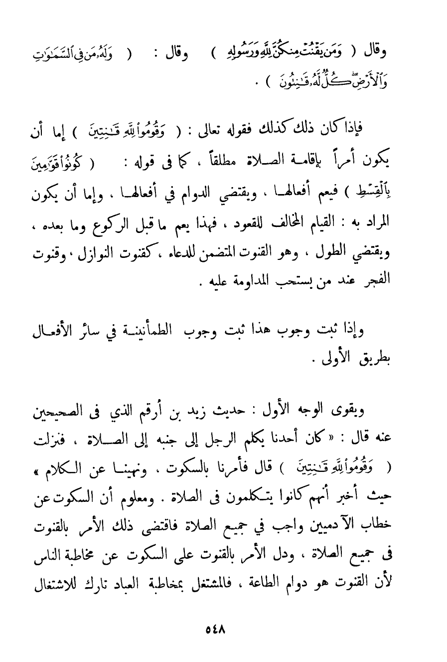 حَفِظَ اللَّهُ} وَقَالَ {وَمَنْ يَقْنُتْ مِنْكُنَّ لِلَّهِ وَرَسُولِهِ} وَقَالَ: {وَلَهُ مَنْ فِي السَّمَاوَاتِ وَالْأَرْضِ كُلٌّ لَهُ قَانِتُونَ} . فَإِذَا كَانَ ذَلِكَ كَذَلِكَ فَقَوْلُهُ تَعَالَى: {وَقُومُوا لِلَّهِ قَانِتِينَ} إمَّا أَنْ يَكُونَ أَمْرًا بِإِقَامَةِ الصَّلَاةِ مُطْلَقًا كَمَا فِي قَوْلِهِ: {كُونُوا قَوَّامِينَ بِالْقِسْطِ} فَيَعُمُّ أَفْعَالَهَا وَيَقْتَضِي الدَّوَامَ فِي أَفْعَالِهَا وَإِمَّا أَنْ يَكُونَ الْمُرَادُ بِهِ: الْقِيَامَ الْمُخَالِفَ لِلْقُعُودِ فَهَذَا يَعُمُّ مَا قَبْلَ الرُّكُوعِ وَمَا بَعْدَهُ وَيَقْتَضِي الطُّولَ وَهُوَ الْقُنُوتُ الْمُتَضَمِّنُ لِلدُّعَاءِ كَقُنُوتِ النَّوَازِلِ وَقُنُوتِ الْفَجْرِ عِنْدَ مَنْ يَسْتَحِبُّ الْمُدَاوَمَةَ عَلَيْهِ. وَإِذَا ثَبَتَ وُجُوبُ هَذَا ثَبَتَ وُجُوبُ الطُّمَأْنِينَةِ فِي سَائِرِ الْأَفْعَالِ. بِطَرِيقِ الْأَوْلَى. وَيُقَوِّي الْوَجْهَ الْأَوَّلَ: حَدِيثُ زَيْدِ بْنِ أَرْقَم الَّذِي فِي الصَّحِيحَيْنِ عَنْهُ قَالَ: {كَانَ أَحَدُنَا يُكَلِّمُ الرَّجُلَ إلَى جَنْبِهِ إلَى الصَّلَاةِ فَنَزَلَتْ {وَقُومُوا لِلَّهِ قَانِتِينَ} قَالَ فَأُمِرْنَا بِالسُّكُوتِ وَنُهِينَا عَنْ الْكَلَامِ} حَيْثُ أَخْبَرَ أَنَّهُمْ كَانُوا يَتَكَلَّمُونَ فِي الصَّلَاةِ. وَمَعْلُومٌ أَنَّ السُّكُوتَ عَنْ خِطَابِ الْآدَمِيِّينَ وَاجِبٌ فِي جَمِيعِ الصَّلَاةِ فَاقْتَضَى ذَلِكَ الْأَمْرَ بِالْقُنُوتِ فِي جَمِيعِ الصَّلَاةِ وَدَلَّ الْأَمْرُ بِالْقُنُوتِ عَلَى السُّكُوتِ عَنْ مُخَاطَبَةِ النَّاسِ لِأَنَّ الْقُنُوتَ هُوَ دَوَامُ الطَّاعَةِ فَالْمُشْتَغِلُ بِمُخَاطَبَةِ الْعِبَادِ تَارِكٌ لِلِاشْتِغَالِ