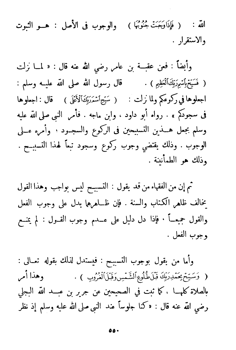 اللَّهُ: {فَإِذَا وَجَبَتْ جُنُوبُهَا} وَالْوُجُوبُ فِي الْأَصْلِ: هُوَ الثُّبُوتُ وَالِاسْتِقْرَارُ. وَأَيْضًا: فَعَنْ عُقْبَةَ بْنِ عَامِرٍ رَضِيَ اللَّهُ عَنْهُ قَالَ: {لَمَّا نَزَلَتْ {فَسَبِّحْ بِاسْمِ رَبِّكَ الْعَظِيمِ} . قَالَ رَسُولُ اللَّهِ صَلَّى اللَّهُ عَلَيْهِ وَسَلَّمَ اجْعَلُوهَا فِي رُكُوعِكُمْ وَلَمَّا نَزَلَتْ: {سَبِّحِ اسْمَ رَبِّكَ الْأَعْلَى} قَالَ: اجْعَلُوهَا فِي سُجُودِكُمْ} . رَوَاهُ أَبُو دَاوُد وَابْنُ مَاجَه. فَأَمَرَ النَّبِيُّ صَلَّى اللَّهُ عَلَيْهِ وَسَلَّمَ بِجَعْلِ هَذَيْنِ التَّسْبِيحَيْنِ فِي الرُّكُوعِ وَالسُّجُودِ وَأَمْرُهُ عَلَى الْوُجُوبِ. وَذَلِكَ يَقْتَضِي وُجُوبَ رُكُوعٍ وَسُجُودٍ تَبَعًا لِهَذَا التَّسْبِيحِ. وَذَلِكَ هُوَ الطُّمَأْنِينَةُ. ثُمَّ إنَّ مِنْ الْفُقَهَاءِ مَنْ قَدْ يَقُولُ: التَّسْبِيحُ لَيْسَ بِوَاجِبِ وَهَذَا الْقَوْلُ يُخَالِفُ ظَاهِرَ الْكِتَابِ وَالسُّنَّةِ. فَإِنَّ ظَاهِرَهُمَا يَدُلُّ عَلَى وُجُوبِ الْفِعْلِ وَالْقَوْلِ جَمِيعًا فَإِذَا دَلَّ دَلِيلٌ عَلَى عَدَمِ وُجُوبِ الْقَوْلِ: لَمْ يَمْنَعْ وُجُوبَ الْفِعْلِ. وَأَمَّا مَنْ يَقُولُ بِوُجُوبِ التَّسْبِيحِ: فَيَسْتَدِلُّ لِذَلِكَ بِقَوْلِهِ تَعَالَى: {وَسَبِّحْ بِحَمْدِ رَبِّكَ قَبْلَ طُلُوعِ الشَّمْسِ وَقَبْلَ الْغُرُوبِ} . وَهَذَا أَمْرٌ بِالصَّلَاةِ كُلِّهَا كَمَا ثَبَتَ فِي الصَّحِيحَيْنِ عَنْ جَرِيرِ بْنِ عَبْدِ اللَّهِ البجلي رَضِيَ اللَّهُ عَنْهُ قَالَ: {كُنَّا جُلُوسًا عِنْدَ النَّبِيِّ صَلَّى اللَّهُ عَلَيْهِ وَسَلَّمَ إذْ نَظَرَ
