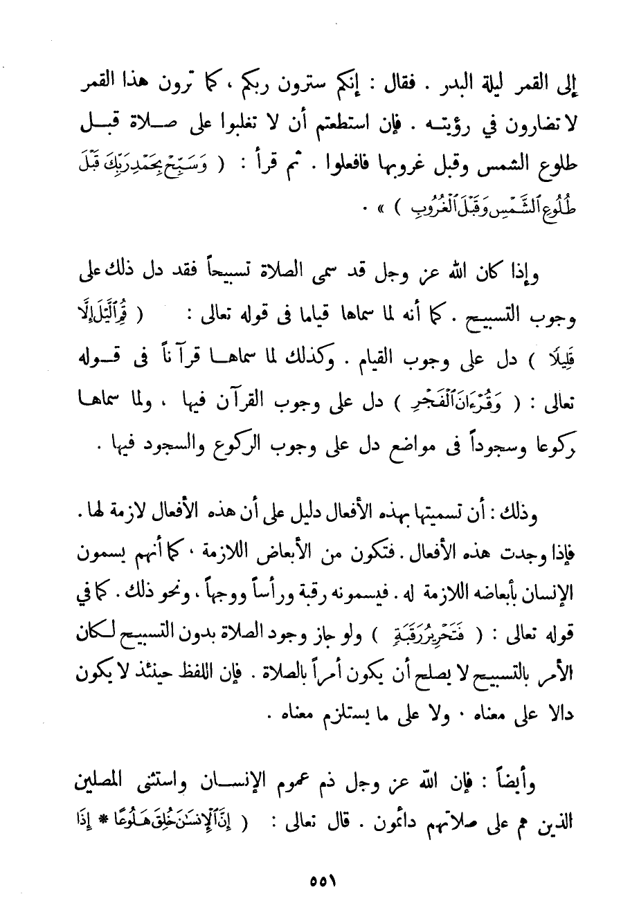 إلَى الْقَمَرِ لَيْلَةَ الْبَدْرِ. فَقَالَ: إنَّكُمْ سَتَرَوْنَ رَبَّكُمْ كَمَا تَرَوْنَ هَذَا الْقَمَرَ لَا تُضَارُّونَ فِي رُؤْيَتِهِ. فَإِنْ اسْتَطَعْتُمْ أَنْ لَا تُغْلَبُوا عَلَى صَلَاةٍ قَبْلَ طُلُوعِ الشَّمْسِ وَقَبْلَ غُرُوبِهَا فَافْعَلُوا. ثُمَّ قَرَأَ: {وَسَبِّحْ بِحَمْدِ رَبِّكَ قَبْلَ طُلُوعِ الشَّمْسِ وَقَبْلَ الْغُرُوبِ} } . وَإِذَا كَانَ اللَّهُ عَزَّ وَجَلَّ قَدْ سَمَّى الصَّلَاةَ تَسْبِيحًا فَقَدْ دَلَّ ذَلِكَ عَلَى وُجُوبِ التَّسْبِيحِ. كَمَا أَنَّهُ لَمَّا سَمَّاهَا قِيَامًا فِي قَوْله تَعَالَى {قُمِ اللَّيْلَ إلَّا قَلِيلًا} دَلَّ عَلَى وُجُوبِ الْقِيَامِ. وَكَذَلِكَ لَمَّا سَمَّاهَا قُرْآنًا فِي قَوْله تَعَالَى {وَقُرْآنَ الْفَجْرِ} دَلَّ عَلَى وُجُوبِ الْقُرْآنِ فِيهَا وَلَمَّا سَمَّاهَا رُكُوعًا وَسُجُودًا فِي مَوَاضِعَ دَلَّ عَلَى وُجُوبِ الرُّكُوعِ وَالسُّجُودِ فِيهَا. وَذَلِكَ: أَنَّ تَسْمِيَتَهَا بِهَذِهِ الْأَفْعَالِ دَلِيلٌ عَلَى أَنَّ هَذِهِ الْأَفْعَالَ لَازِمَةٌ لَهَا. فَإِذَا وُجِدَتْ هَذِهِ الْأَفْعَالُ. فَتَكُونُ مِنْ الْأَبْعَاضِ اللَّازِمَةِ كَمَا أَنَّهُمْ يُسَمُّونَ الْإِنْسَانَ بِأَبْعَاضِهِ اللَّازِمَةِ لَهُ. فَيُسَمُّونَهُ رَقَبَةً وَرَأْسًا وَوَجْهًا وَنَحْوَ ذَلِكَ. كَمَا فِي قَوْله تَعَالَى {فَتَحْرِيرُ رَقَبَةٍ} وَلَوْ جَازَ وُجُودُ الصَّلَاةِ بِدُونِ التَّسْبِيحِ لَكَانَ الْأَمْرُ بِالتَّسْبِيحِ لَا يَصْلُحُ أَنْ يَكُونَ أَمْرًا بِالصَّلَاةِ. فَإِنَّ اللَّفْظَ حِينَئِذٍ لَا يَكُونُ دَالًّا عَلَى مَعْنَاهُ. وَلَا عَلَى مَا يَسْتَلْزِمُ مَعْنَاهُ. وَأَيْضًا: فَإِنَّ اللَّهَ عَزَّ وَجَلَّ ذَمَّ عُمُومَ الْإِنْسَانِ وَاسْتَثْنَى الْمُصَلِّينَ الَّذِينَ هُمْ عَلَى صَلَاتِهِمْ دَائِمُونَ. قَالَ تَعَالَى: {إنَّ الْإِنْسَانَ خُلِقَ هَلُوعًا}
