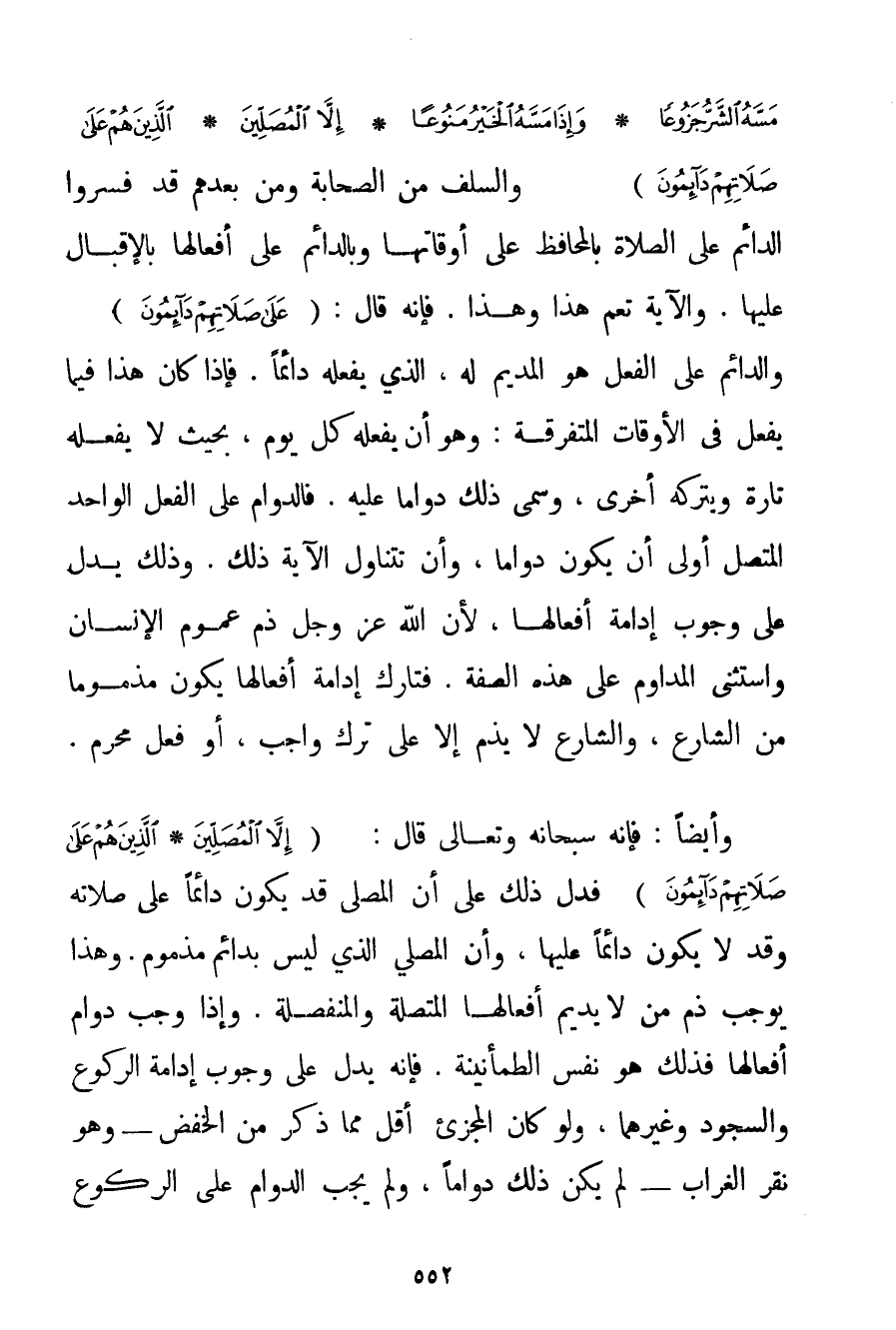 {إذَا مَسَّهُ الشَّرُّ جَزُوعًا} {وَإِذَا مَسَّهُ الْخَيْرُ مَنُوعًا} {إلَّا الْمُصَلِّينَ} {الَّذِينَ هُمْ عَلَى صَلَاتِهِمْ دَائِمُونَ} وَالسَّلَفُ مِنْ الصَّحَابَةِ وَمَنْ بَعْدَهُمْ قَدْ فَسَّرُوا الدَّائِمَ عَلَى الصَّلَاةِ بِالْمُحَافَظِ عَلَى أَوْقَاتِهَا وَبِالدَّائِمِ عَلَى أَفْعَالِهَا بِالْإِقْبَالِ عَلَيْهَا. وَالْآيَةُ تَعُمُّ هَذَا وَهَذَا. فَإِنَّهُ قَالَ: {عَلَى صَلَاتِهِمْ دَائِمُونَ} وَالدَّائِمُ عَلَى الْفِعْلِ هُوَ الْمُدِيمُ لَهُ الَّذِي يَفْعَلُهُ دَائِمًا. فَإِذَا كَانَ هَذَا فِيمَا يُفْعَلُ فِي الْأَوْقَاتِ الْمُتَفَرِّقَةِ: وَهُوَ أَنْ يَفْعَلَهُ كُلَّ يَوْمٍ بِحَيْثُ لَا يَفْعَلُهُ تَارَةً وَيَتْرُكُهُ أُخْرَى وَسَمَّى ذَلِكَ دَوَامًا عَلَيْهِ. فَالدَّوَامُ عَلَى الْفِعْلِ الْوَاحِدِ الْمُتَّصِلِ أَوْلَى أَنْ يَكُونَ دَوَامًا وَأَنْ تَتَنَاوَلَ الْآيَةُ ذَلِكَ. وَذَلِكَ يَدُلُّ عَلَى وُجُوبِ إدَامَةِ أَفْعَالِهَا لِأَنَّ اللَّهَ عَزَّ وَجَلَّ ذَمَّ عُمُومَ الْإِنْسَانِ وَاسْتَثْنَى الْمُدَاوِمَ عَلَى هَذِهِ الصِّفَةِ. فَتَارِكُ إدَامَةِ أَفْعَالِهَا يَكُونُ مَذْمُومًا مِنْ الشَّارِعِ وَالشَّارِعُ لَا يَذُمُّ إلَّا عَلَى تَرْكِ وَاجِبٍ أَوْ فِعْلِ مُحَرَّمٍ. وَأَيْضًا: فَإِنَّهُ سُبْحَانَهُ وَتَعَالَى قَالَ: {إلَّا الْمُصَلِّينَ} {الَّذِينَ هُمْ عَلَى صَلَاتِهِمْ دَائِمُونَ} فَدَلَّ ذَلِكَ عَلَى أَنَّ الْمُصَلِّيَ قَدْ يَكُونُ دَائِمًا عَلَى صَلَاتِهِ وَقَدْ لَا يَكُونُ دَائِمًا عَلَيْهَا وَأَنَّ الْمُصَلِّيَ الَّذِي لَيْسَ بِدَائِمِ مَذْمُومٌ. وَهَذَا يُوجِبُ ذَمَّ مَنْ لَا يُدِيمُ أَفْعَالَهَا الْمُتَّصِلَةَ وَالْمُنْفَصِلَةَ. وَإِذَا وَجَبَ دَوَامُ أَفْعَالِهَا فَذَلِكَ هُوَ نَفْسُ الطُّمَأْنِينَةِ. فَإِنَّهُ يَدُلُّ عَلَى وُجُوبِ إدَامَةِ الرُّكُوعِ وَالسُّجُودِ وَغَيْرِهِمَا وَلَوْ كَانَ الْمُجْزِئُ أَقَلَّ مِمَّا ذَكَرَ مِنْ الْخَفْضِ - وَهُوَ نَقْرُ الْغُرَابِ - لَمْ يَكُنْ ذَلِكَ دَوَامًا وَلَمْ يَجِبْ الدَّوَامُ عَلَى الرُّكُوعِ