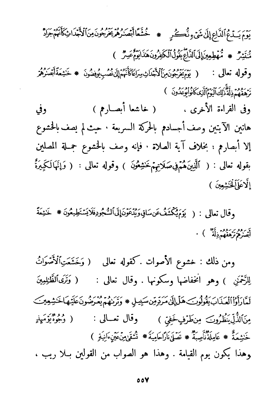 يَوْمَ يَدْعُو الدَّاعِي إلَى شَيْءٍ نُكُرٍ} {خُشَّعًا أَبْصَارُهُمْ يَخْرُجُونَ مِنَ الْأَجْدَاثِ كَأَنَّهُمْ جَرَادٌ مُنْتَشِرٌ} {مُهْطِعِينَ إلَى الدَّاعِي يَقُولُ الْكَافِرُونَ هَذَا يَوْمٌ عَسِرٌ} وقَوْله تَعَالَى {يَوْمَ يَخْرُجُونَ مِنَ الْأَجْدَاثِ سِرَاعًا كَأَنَّهُمْ إلَى نُصُبٍ يُوفِضُونَ} {خَاشِعَةً أَبْصَارُهُمْ تَرْهَقُهُمْ ذِلَّةٌ ذَلِكَ الْيَوْمُ الَّذِي كَانُوا يُوعَدُونَ} وَفِي الْقِرَاءَةِ الْأُخْرَى {خُشَّعًا أَبْصَارُهُمْ} وَفِي هَاتَيْنِ الْآيَتَيْنِ وَصَفَ أَجْسَادَهُمْ بِالْحَرَكَةِ السَّرِيعَةِ حَيْثُ لَمْ يَصِفْ بِالْخُشُوعِ إلَّا أَبْصَارَهُمْ؛ بِخِلَافِ آيَةِ الصَّلَاةِ فَإِنَّهُ وَصَفَ بِالْخُشُوعِ جُمْلَةَ الْمُصَلِّينَ بِقَوْلِهِ تَعَالَى: {الَّذِينَ هُمْ فِي صَلَاتِهِمْ خَاشِعُونَ} وقَوْله تَعَالَى {وَإِنَّهَا لَكَبِيرَةٌ إلَّا عَلَى الْخَاشِعِينَ} وَقَالَ تَعَالَى " {يَوْمَ يُكْشَفُ عَنْ سَاقٍ وَيُدْعَوْنَ إلَى السُّجُودِ فَلَا يَسْتَطِيعُونَ خَاشِعَةً أَبْصَارُهُمْ تَرْهَقُهُمْ ذِلَّةٌ} . وَمِنْ ذَلِكَ: خُشُوعُ الْأَصْوَاتِ. كَقَوْلِهِ تَعَالَى: {وَخَشَعَتِ الْأَصْوَاتُ لِلرَّحْمَنِ} وَهُوَ انْخِفَاضُهَا وَسُكُوتُهَا. وَقَالَ تَعَالَى: {وَتَرَى الظَّالِمِينَ لَمَّا رَأَوُا الْعَذَابَ يَقُولُونَ هَلْ إلَى مَرَدٍّ مِنْ سَبِيلٍ} {وَتَرَاهُمْ يُعْرَضُونَ عَلَيْهَا خَاشِعِينَ مِنَ الذُّلِّ يَنْظُرُونَ مِنْ طَرْفٍ خَفِيٍّ} وَقَالَ تَعَالَى: {وُجُوهٌ يَوْمَئِذٍ خَاشِعَةٌ} {عَامِلَةٌ نَاصِبَةٌ} {تَصْلَى نَارًا حَامِيَةً} {تُسْقَى مِنْ عَيْنٍ آنِيَةٍ} وَهَذَا يَكُونُ يَوْمَ الْقِيَامَةِ. وَهَذَا هُوَ الصَّوَابُ مِنْ الْقَوْلَيْنِ بِلَا رَيْبٍ