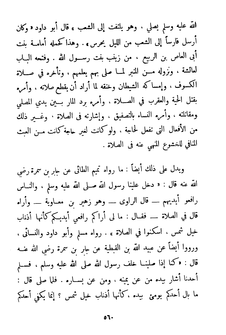 صَلَّى اللَّهُ عَلَيْهِ وَسَلَّمَ يُصَلِّي وَهُوَ يَلْتَفِتُ إلَى الشِّعْبِ قَالَ أَبُو دَاوُد وَكَانَ أَرْسَلَ فَارِسًا إلَى الشِّعْبِ مِنْ اللَّيْلِ يَحْرُسُ} . وَهَذَا كَحَمْلِهِ أمامة بِنْتِ أَبِي العاص بْنِ الرَّبِيعِ مِنْ زَيْنَبَ بِنْتِ رَسُولِ اللَّهِ. وَفَتْحِهِ الْبَابَ لِعَائِشَةَ وَنُزُولِهِ مِنْ الْمِنْبَرِ لَمَّا صَلَّى بِهِمْ يُعَلِّمُهُمْ وَتَأَخُّرِهِ فِي صَلَاةِ الْكُسُوفِ وَإِمْسَاكِهِ الشَّيْطَانَ وَخَنْقِهِ لَمَّا أَرَادَ أَنْ يَقْطَعَ صَلَاتَهُ وَأَمْرِهِ بِقَتْلِ الْحَيَّةِ وَالْعَقْرَبِ فِي الصَّلَاةِ وَأَمْرِهِ بِرَدِّ الْمَارِّ بَيْنَ يَدَيْ الْمُصَلِّي وَمُقَاتَلَتِهِ وَأَمْرِهِ النِّسَاءَ بِالتَّصْفِيقِ وَإِشَارَتِهِ فِي الصَّلَاةِ وَغَيْرِ ذَلِكَ مِنْ الْأَفْعَالِ الَّتِي تُفْعَلُ لِحَاجَةِ وَلَوْ كَانَتْ لِغَيْرِ حَاجَةٍ كَانَتْ مِنْ الْعَبَثِ الْمُنَافِي لِلْخُشُوعِ الْمَنْهِيِّ عَنْهُ فِي الصَّلَاةِ. وَيَدُلُّ عَلَى ذَلِكَ أَيْضًا: مَا رَوَاهُ تَمِيمٌ الطَّائِيُّ عَنْ {جَابِرِ بْنِ سَمُرَةَ رَضِيَ اللَّهُ عَنْهُ قَالَ: دَخَلَ عَلَيْنَا رَسُولُ اللَّهِ صَلَّى اللَّهُ عَلَيْهِ وَسَلَّمَ وَالنَّاسُ رَافِعُوا أَيْدِيهِمْ - قَالَ الرَّاوِي - وَهُوَ زُهَيْرُ بْنُ مُعَاوِيَةَ - وَأُرَاهُ قَالَ فِي الصَّلَاةِ - فَقَالَ: مَا لِي أَرَاكُمْ رَافِعِي أَيْدِيَكُمْ كَأَنَّهَا أَذْنَابُ خَيْلٍ شمس اُسْكُنُوا فِي الصَّلَاةِ} . رَوَاهُ مُسْلِمٌ وَأَبُو دَاوُد وَالنَّسَائِي وَرَوَوْا أَيْضًا عَنْ عُبَيْدِ اللَّهِ بْنِ الْقِبْطِيَّةِ عَنْ {جَابِرِ بْنِ سَمُرَةَ رَضِيَ اللَّهُ عَنْهُ قَالَ: كُنَّا إذَا صَلَّيْنَا خَلْفَ رَسُولِ اللَّهِ صَلَّى اللَّهُ عَلَيْهِ وَسَلَّمَ فَسَلَّمَ أَحَدُنَا أَشَارَ بِيَدِهِ مِنْ عَنْ يَمِينِهِ وَمِنْ عَنْ يَسَارِهِ. فَلَمَّا صَلَّى قَالَ: مَا بَالُ أَحَدِكُمْ يُومِئُ بِيَدِهِ كَأَنَّهَا أَذْنَابُ خَيْلٍ شمس؟ إنَّمَا يَكْفِي أَحَدَكُمْ - أَوْ أَلَا يَكْفِي أَحَدَكُمْ -