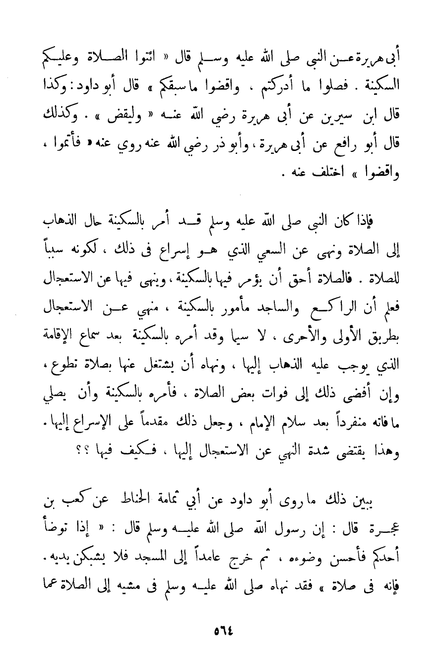 هُرَيْرَةَ عَنْ النَّبِيِّ صَلَّى اللَّهُ عَلَيْهِ وَسَلَّمَ قَالَ {ائْتُوا الصَّلَاةَ وَعَلَيْكُمْ السَّكِينَةُ. فَصَلُّوا مَا أَدْرَكْتُمْ وَاقْضُوا مَا سَبَقَكُمْ} قَالَ أَبُو دَاوُد: وَكَذَا قَالَ ابْنُ سِيرِين عَنْ أَبِي هُرَيْرَةَ صَلَّى اللَّهُ عَلَيْهِ وَسَلَّمَ {وَلْيَقْضِ} . وَكَذَلِكَ قَالَ أَبُو رَافِعٍ عَنْ أَبِي هُرَيْرَةَ وَأَبُو ذَرٍّ رَضِيَ اللَّهُ عَنْهُ رَوَى عَنْهُ {فَأَتِمُّوا وَاقْضُوا} اخْتَلَفَ عَنْهُ. فَإِذَا كَانَ النَّبِيُّ صَلَّى اللَّهُ عَلَيْهِ وَسَلَّمَ قَدْ أَمَرَ بِالسَّكِينَةِ حَالَ الذَّهَابِ إلَى الصَّلَاةِ وَنَهَى عَنْ السَّعْيِ الَّذِي هُوَ إسْرَاعٌ فِي ذَلِكَ لِكَوْنِهِ سَبَبًا لِلصَّلَاةِ. فَالصَّلَاةُ أَحَقُّ أَنْ يُؤْمَرَ فِيهَا بِالسَّكِينَةِ وَيُنْهَى فِيهَا عَنْ الِاسْتِعْجَالِ فَعُلِمَ أَنَّ الرَّاكِعَ وَالسَّاجِدَ مَأْمُورٌ بِالسَّكِينَةِ مَنْهِيٌّ عَنْ الِاسْتِعْجَالِ بِطَرِيقِ الْأَوْلَى وَالْأَحْرَى لَا سِيَّمَا وَقَدْ أَمَرَهُ بِالسَّكِينَةِ بَعْدَ سَمَاعِ الْإِقَامَةِ الَّذِي يُوجِبُ عَلَيْهِ الذَّهَابَ إلَيْهَا وَنَهَاهُ أَنْ يَشْتَغِلَ عَنْهَا بِصَلَاةِ تَطَوُّعٍ وَإِنْ أَفْضَى ذَلِكَ إلَى فَوَاتِ بَعْضِ الصَّلَاةِ فَأَمَرَهُ بِالسَّكِينَةِ وَأَنْ يُصَلِّيَ مَا فَاتَهُ مُنْفَرِدًا بَعْدَ سَلَامِ الْإِمَامِ وَجَعَلَ ذَلِكَ مُقَدَّمًا عَلَى الْإِسْرَاعِ إلَيْهَا. وَهَذَا يَقْتَضِي شِدَّةَ النَّهْيِ عَنْ الِاسْتِعْجَالِ إلَيْهَا فَكَيْفَ فِيهَا؟ ؟ يُبَيِّنُ ذَلِكَ مَا رَوَى أَبُو دَاوُد عَنْ أَبِي ثُمَامَةَ الْحَنَّاطِ عَنْ كَعْبِ بْنِ عُجْرَةَ قَالَ: إنَّ رَسُولَ اللَّهِ صَلَّى اللَّهُ عَلَيْهِ وَسَلَّمَ قَالَ: {إذَا تَوَضَّأَ أَحَدُكُمْ فَأَحْسَنَ وُضُوءَهُ ثُمَّ خَرَجَ عَامِدًا إلَى الْمَسْجِدِ فَلَا يُشَبِّكَن يَدَيْهِ. فَإِنَّهُ فِي صَلَاةٍ} فَقَدْ نَهَاهُ صَلَّى اللَّهُ عَلَيْهِ وَسَلَّمَ فِي مَشْيِهِ إلَى الصَّلَاةِ عَمَّا
