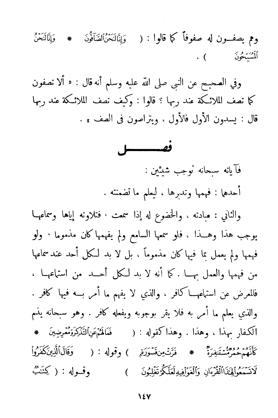 وَهُمْ يَصُفُّونَ لَهُ صُفُوفًا كَمَا قَالُوا: {وَإِنَّا لَنَحْنُ الصَّافُّونَ} {وَإِنَّا لَنَحْنُ الْمُسَبِّحُونَ} . وَفِي الصَّحِيحِ عَنْ النَّبِيِّ صَلَّى اللَّهُ عَلَيْهِ وَسَلَّمَ أَنَّهُ قَالَ: {أَلَّا تَصُفُّونَ كَمَا تَصُفُّ الْمَلَائِكَةُ عِنْدَ رَبِّهَا؟ قَالُوا: وَكَيْفَ تَصُفُّ الْمَلَائِكَةُ عِنْدَ رَبِّهَا قَالَ: يَسُدُّونَ الْأَوَّلَ فَالْأَوَّلَ وَيَتَرَاصُّونَ فِي الصَّفِّ} .