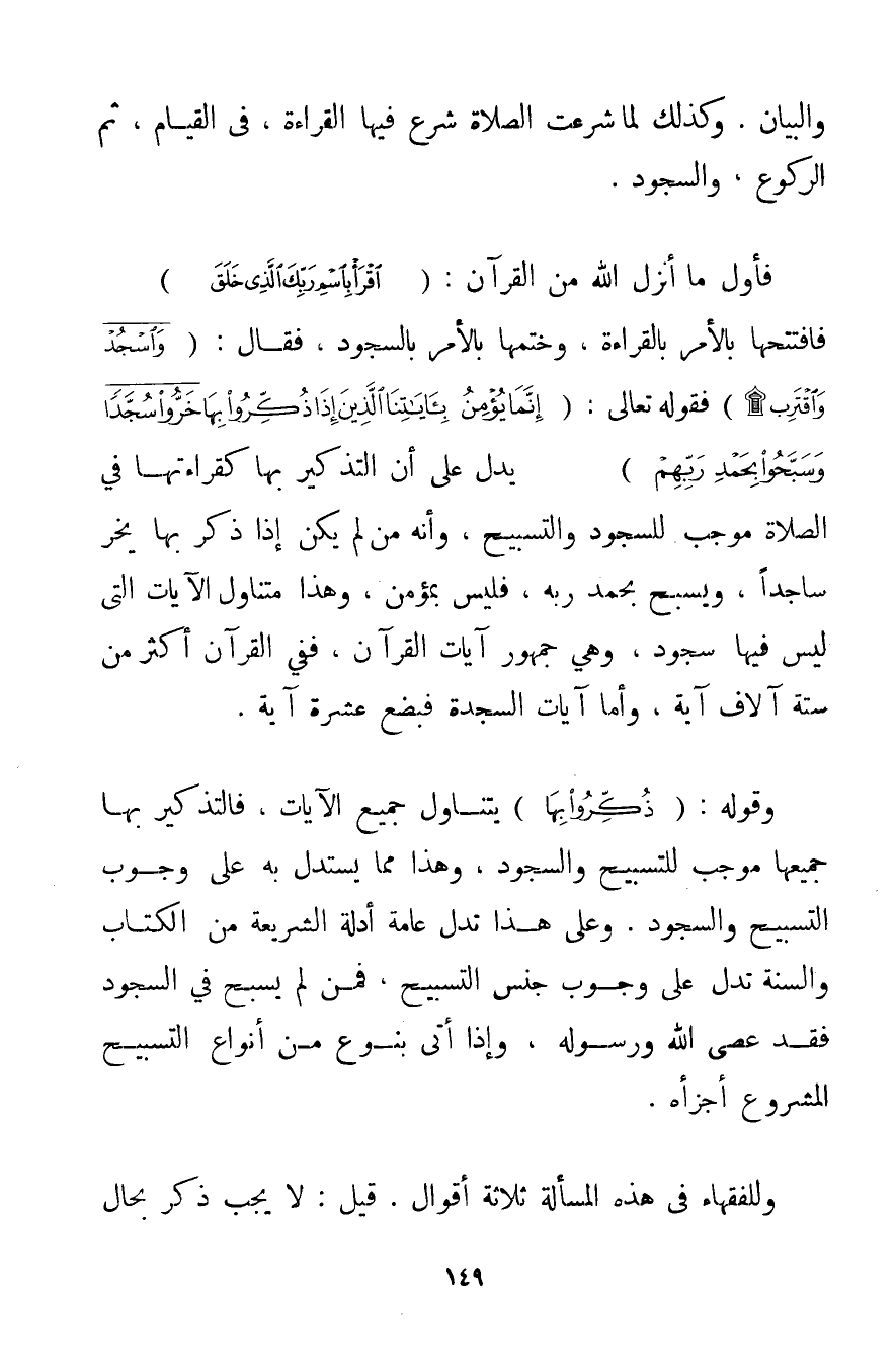 وَالْبَيَانِ. وَكَذَلِكَ لَمَّا شُرِعَتْ الصَّلَاةُ شُرِعَ فِيهَا الْقِرَاءَةُ فِي الْقِيَامِ ثُمَّ الرُّكُوعِ وَالسُّجُودِ. فَأَوَّلُ مَا أَنْزَلَ اللَّهُ مِنْ الْقُرْآنِ: {اقْرَأْ بِاسْمِ رَبِّكَ الَّذِي خَلَقَ} فَافْتَتَحَهَا بِالْأَمْرِ بِالْقِرَاءَةِ وَخَتَمَهَا بِالْأَمْرِ بِالسُّجُودِ فَقَالَ: {وَاسْجُدْ وَاقْتَرِبْ} فَقَوْلُهُ تَعَالَى: {إنَّمَا يُؤْمِنُ بِآيَاتِنَا الَّذِينَ إذَا ذُكِّرُوا بِهَا خَرُّوا سُجَّدًا وَسَبَّحُوا بِحَمْدِ رَبِّهِمْ} يَدُلُّ عَلَى أَنَّ التَّذْكِيرَ بِهَا كَقِرَاءَتِهَا فِي الصَّلَاةِ مُوجِبٌ لِلسُّجُودِ وَالتَّسْبِيحِ وَإِنَّهُ مَنْ لَمْ يَكُنْ إذَا ذُكِّرَ بِهَا يَخِرُّ سَاجِدًا وَيُسَبِّحُ بِحَمْدِ رَبِّهِ فَلَيْسَ بِمُؤْمِنِ وَهَذَا مُتَنَاوِلٌ الْآيَاتِ الَّتِي لَيْسَ فِيهَا سُجُودٌ وَهِيَ جُمْهُورُ آيَاتِ الْقُرْآنِ فَفِي الْقُرْآنِ أَكْثَرُ مِنْ سِتَّةِ آلَافِ آيَةٍ وَأَمَّا آيَاتُ السَّجْدَةِ فَبِضْعَ عَشْرَةَ آيَةً. وَقَوْلُهُ: {ذُكِّرُوا بِهَا} يَتَنَاوَلُ جَمِيعَ الْآيَاتِ فَالتَّذْكِيرُ بِهَا جَمِيعُهَا مُوجِبٌ لِلتَّسْبِيحِ وَالسُّجُودِ وَهَذَا مِمَّا يُسْتَدَلُّ بِهِ عَلَى وُجُوبِ التَّسْبِيحِ وَالسُّجُودِ. وَعَلَى هَذَا تَدُلُّ عَامَّةُ أَدِلَّةِ الشَّرِيعَةِ مِنْ الْكِتَابِ وَالسُّنَّةِ تَدُلُّ عَلَى وُجُوبِ جِنْسِ التَّسْبِيحِ فَمَنْ لَمْ يُسَبِّحْ فِي السُّجُودِ فَقَدْ عَصَى اللَّهَ وَرَسُولَهُ وَإِذَا أَتَى بِنَوْعِ مِنْ أَنْوَاعِ التَّسْبِيحِ الْمَشْرُوعِ أَجْزَأَهُ. وَلِلْفُقَهَاءِ فِي هَذِهِ الْمَسْأَلَةِ ثَلَاثَةُ أَقْوَالٍ. قِيلَ: لَا يَجِبُ ذِكْرٌ بِحَالِ