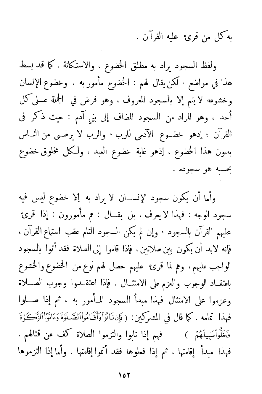 بِهِ كُلُّ مَنْ قُرِئَ عَلَيْهِ الْقُرْآنُ. وَلَفْظُ السُّجُودِ يُرَادُ بِهِ مُطْلَقُ الْخُضُوعِ وَالِاسْتِكَانَةِ. كَمَا قَدْ بُسِطَ هَذَا فِي مَوَاضِعَ لَكِنْ يُقَالُ لَهُمْ: الْخُضُوعُ مَأْمُورٌ بِهِ وَخُضُوعُ الْإِنْسَانِ وَخُشُوعُهُ لَا يَتِمُّ إلَّا بِالسُّجُودِ الْمَعْرُوفِ وَهُوَ فَرْضٌ فِي الْجُمْلَةِ عَلَى كُلِّ أَحَدٍ وَهُوَ الْمُرَادُ مِنْ السُّجُودِ الْمُضَافِ إلَى بَنِي آدَمَ: حَيْثُ ذُكِرَ فِي الْقُرْآنِ؛ إذْ هُوَ خُضُوعُ الْآدَمِيِّ لِلرَّبِّ وَالرَّبُّ لَا يَرْضَى مِنْ النَّاسِ بِدُونِ هَذَا الْخُضُوعِ إذْ هُوَ غَايَةُ خُضُوعِ الْعَبْدِ وَلِكُلِّ مَخْلُوقٍ خُضُوعٌ بِحَسْبِهِ هُوَ سُجُودُهُ. وَإِمَّا أَنْ يَكُونَ سُجُودُ الْإِنْسَانِ لَا يُرَادُ بِهِ إلَّا خُضُوعٌ لَيْسَ فِيهِ سُجُودُ الْوَجْهِ: فَهَذَا لَا يُعْرَفُ بَلْ يُقَالُ: هُمْ مَأْمُورُونَ: إذَا قُرِئَ عَلَيْهِمْ الْقُرْآنُ بِالسُّجُودِ وَإِنْ لَمْ يَكُنْ السُّجُودُ التَّامُّ عَقِبَ اسْتِمَاعِ الْقُرْآنِ فَإِنَّهُ لَا بُدَّ أَنْ يَكُونَ بَيْنَ صَلَاتَيْنِ فَإِذَا قَامُوا إلَى الصَّلَاةِ فَقَدْ أَتَوْا بِالسُّجُودِ الْوَاجِبِ عَلَيْهِمْ وَهُمْ لَمَّا قُرِئَ عَلَيْهِمْ حَصَلَ لَهُمْ نَوْعٌ مِنْ الْخُضُوعِ وَالْخُشُوعِ بِاعْتِقَادِ الْوُجُوبِ وَالْعَزْمِ عَلَى الِامْتِثَالِ. فَإِذَا اعْتَقَدُوا وُجُوبَ الصَّلَاةِ وَعَزَمُوا عَلَى الِامْتِثَالِ فَهَذَا مَبْدَأُ السُّجُودِ الْمَأْمُورِ بِهِ ثُمَّ إذَا صَلَّوْا فَهَذَا تَمَامُهُ. كَمَا قَالَ فِي الْمُشْرِكِينَ: {فَإِنْ تَابُوا وَأَقَامُوا الصَّلَاةَ وَآتَوُا الزَّكَاةَ فَخَلُّوا سَبِيلَهُمْ} فَهُمْ إذَا تَابُوا وَالْتَزَمُوا الصَّلَاةَ كُفَّ عَنْ قِتَالِهِمْ. فَهَذَا مَبْدَأُ إقَامَتِهَا ثُمَّ إذَا فَعَلُوهَا فَقَدْ أَتَمُّوا إقَامَتَهَا. وَأَمَّا إذَا الْتَزَمُوهَا
