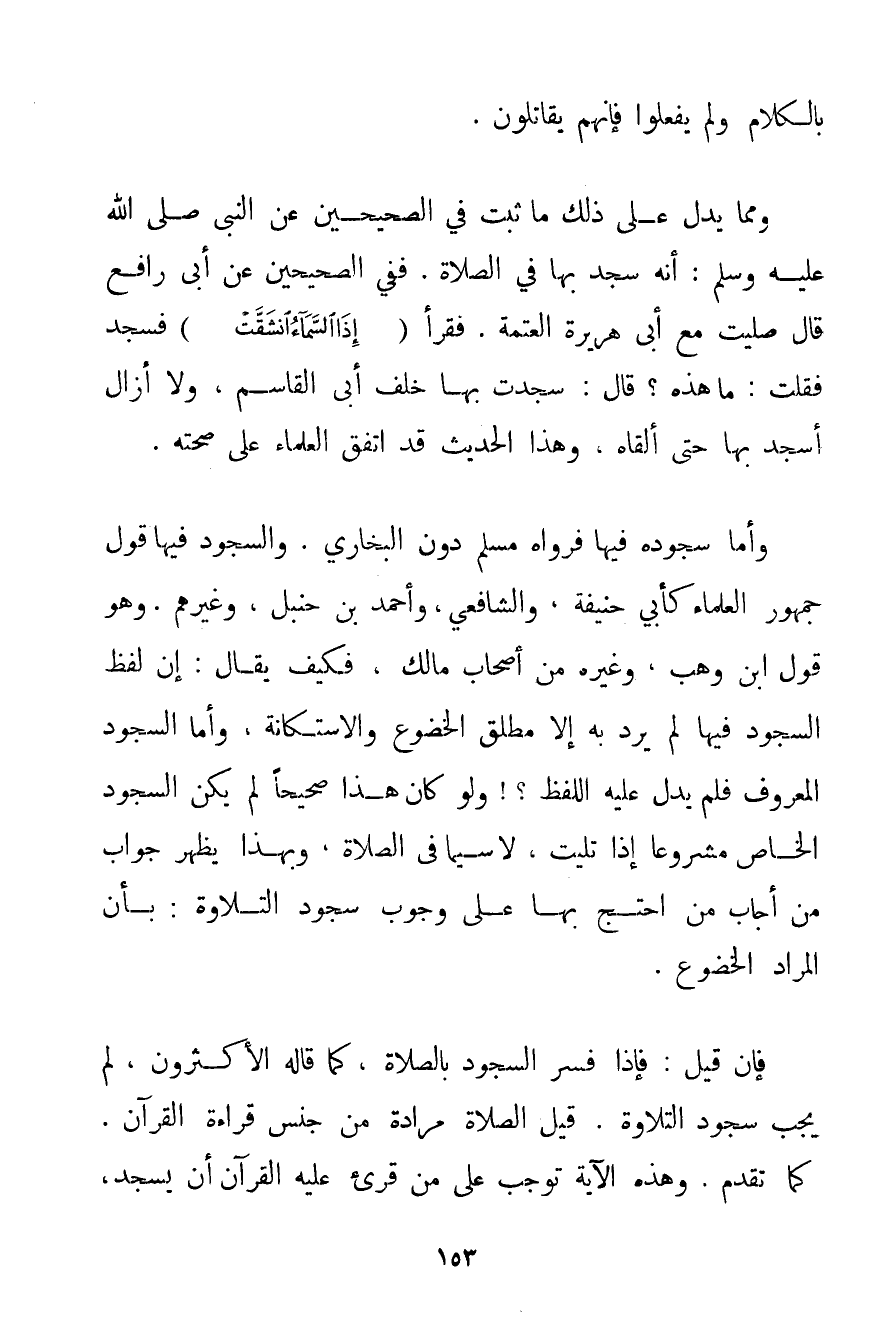 بِالْكَلَامِ وَلَمْ يَفْعَلُوا فَإِنَّهُمْ يُقَاتَلُونَ. وَمِمَّا يَدُلُّ عَلَى ذَلِكَ مَا ثَبَتَ فِي الصَّحِيحَيْنِ عَنْ النَّبِيِّ صَلَّى اللَّهُ عَلَيْهِ وَسَلَّمَ أَنَّهُ سَجَدَ بِهَا فِي الصَّلَاةِ. فَفِي الصَّحِيحَيْنِ {عَنْ أَبِي رَافِعٍ قَالَ صَلَّيْت مَعَ أَبِي هُرَيْرَةَ الْعَتَمَةَ. فَقَرَأَ {إذَا السَّمَاءُ انْشَقَّتْ} فَسَجَدَ فَقُلْت: مَا هَذِهِ؟ قَالَ: سَجَدْت بِهَا خَلْفَ أَبِي الْقَاسِمِ وَلَا أَزَالُ أَسْجُدُ بِهَا حَتَّى أَلْقَاهُ} وَهَذَا الْحَدِيثُ قَدْ اتَّفَقَ الْعُلَمَاءُ عَلَى صِحَّتِهِ. وَأَمَّا سُجُودُهُ فِيهَا فَرَوَاهُ مُسْلِمٌ دُونَ الْبُخَارِيِّ. وَالسُّجُودُ فِيهَا قَوْلُ جُمْهُورِ الْعُلَمَاءِ كَأَبِي حَنِيفَةَ وَالشَّافِعِيِّ وَأَحْمَد بْنِ حَنْبَلٍ وَغَيْرِهِمْ. وَهُوَ قَوْلُ ابْنِ وَهْبٍ وَغَيْرِهِ مِنْ أَصْحَابِ مَالِكٍ فَكَيْفَ يُقَالُ: إنَّ لَفْظَ السُّجُودِ فِيهَا لَمْ يُرِدْ بِهِ إلَّا مُطْلَقَ الْخُضُوعِ وَالِاسْتِكَانَةِ وَأَمَّا السُّجُودُ الْمَعْرُوفُ فَلَمْ يَدُلَّ عَلَيْهِ اللَّفْظُ وَلَوْ كَانَ هَذَا صَحِيحًا لَمْ يَكُنْ السُّجُودُ الْخَاصُّ مَشْرُوعًا إذَا تُلِيَتْ لَا سِيَّمَا فِي الصَّلَاةِ وَبِهَذَا يَظْهَرُ جَوَابُ مَنْ أَجَابَ مَنْ احْتَجَّ بِهَا عَلَى وُجُوبِ سُجُودِ التِّلَاوَةِ: بِأَنَّ الْمُرَادَ الْخُضُوعُ. فَإِنْ قِيلَ: فَإِذَا فُسِّرَ السُّجُودُ بِالصَّلَاةِ كَمَا قَالَهُ الْأَكْثَرُونَ لَمْ يَجِبْ سُجُودُ التِّلَاوَةِ. قِيلَ الصَّلَاةُ مُرَادَةٌ مِنْ جِنْسِ قِرَاءَةِ الْقُرْآنِ. كَمَا تَقَدَّمَ. وَهَذِهِ الْآيَةُ تُوجِبُ عَلَى مَنْ قُرِئَ عَلَيْهِ الْقُرْآنُ أَنْ يَسْجُدَ