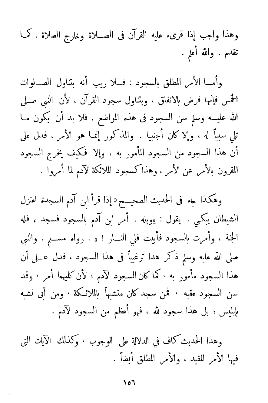 وَهَذَا وَاجِبٌ إذَا قُرِئَ عَلَيْهِ الْقُرْآنُ فِي الصَّلَاةِ وَخَارِجِ الصَّلَاةِ كَمَا تَقَدَّمَ. وَاَللَّهُ أَعْلَمُ. وَأَمَّا الْأَمْرُ الْمُطْلَقُ بِالسُّجُودِ: فَلَا رَيْبَ أَنَّهُ يَتَنَاوَلُ الصَّلَوَاتِ الْخَمْسَ فَإِنَّهَا فَرْضٌ بِالِاتِّفَاقِ وَيَتَنَاوَلُ سُجُودَ الْقُرْآنِ لِأَنَّ النَّبِيَّ صَلَّى اللَّهُ عَلَيْهِ وَسَلَّمَ سَنَّ السُّجُودَ فِي هَذِهِ الْمَوَاضِعِ. فَلَا بُدَّ أَنْ يَكُونَ مَا تُلِيَ سَبَبًا لَهُ وَإِلَّا كَانَ أَجْنَبِيًّا. وَالْمَذْكُورُ إنَّمَا هُوَ الْأَمْرُ فَدَلَّ عَلَى أَنَّ هَذَا السُّجُودَ مِنْ السُّجُودِ الْمَأْمُورِ بِهِ وَإِلَّا فَكَيْفَ يَخْرُجُ السُّجُودُ الْمَقْرُونُ بِالْأَمْرِ عَنْ الْأَمْرِ وَهَذَا كَسُجُودِ الْمَلَائِكَةِ لِآدَمَ لَمَّا أُمِرُوا. وَهَكَذَا جَاءَ فِي الْحَدِيثِ الصَّحِيحِ {إذَا قَرَأَ ابْنُ آدَمَ السَّجْدَةَ اعْتَزَلَ الشَّيْطَانُ يَبْكِي. يَقُولُ: يَا وَيْلَهُ. أُمِرَ ابْنُ آدَمَ بِالسُّجُودِ فَسَجَدَ فَلَهُ الْجَنَّةُ وَأُمِرْت بِالسُّجُودِ فَأَبَيْت فَلِي النَّارُ} . رَوَاهُ مُسْلِمٌ. وَالنَّبِيُّ صَلَّى اللَّهُ عَلَيْهِ وَسَلَّمَ ذَكَرَ هَذَا تَرْغِيبًا فِي هَذَا السُّجُودِ فَدَلَّ عَلَى أَنَّ هَذَا السُّجُودَ مَأْمُورٌ بِهِ كَمَا كَانَ السُّجُودُ لِآدَمَ؛ لِأَنَّ كِلَيْهِمَا أَمْرٌ وَقَدْ سُنَّ السُّجُودُ عَقِبَهُ فَمَنْ سَجَدَ كَانَ مُتَشَبِّهًا بِالْمَلَائِكَةِ وَمَنْ أَبَى تَشَبَّهَ بإبليس؛ بَلْ هَذَا سُجُودٌ لِلَّهِ فَهُوَ أَعْظَمُ مِنْ السُّجُودِ لِآدَمَ. وَهَذَا الْحَدِيثُ كَافٍ فِي الدَّلَالَةِ عَلَى الْوُجُوبِ وَكَذَلِكَ الْآيَاتُ الَّتِي فِيهَا الْأَمْرُ الْمُقَيَّدُ وَالْأَمْرُ الْمُطْلَقُ أَيْضًا.