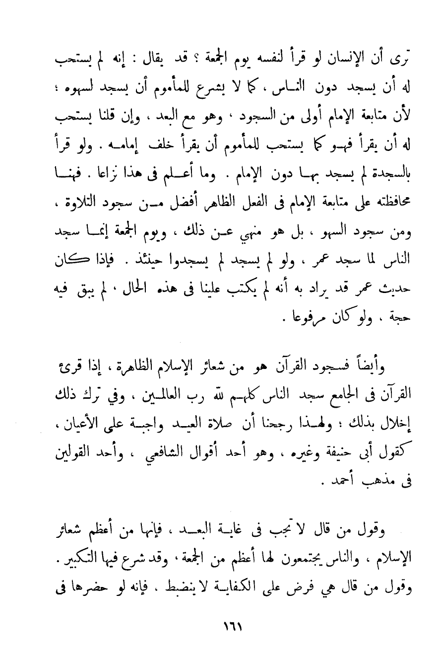 تَرَى أَنَّ الْإِنْسَانَ لَوْ قَرَأَ لِنَفْسِهِ يَوْمَ الْجُمُعَةِ؟ قَدْ يُقَالُ: إنَّهُ لَمْ يُسْتَحَبَّ لَهُ أَنْ يَسْجُدَ دُونَ النَّاسِ كَمَا لَا يَشْرَعُ لِلْمَأْمُومِ أَنْ يَسْجُدَ لِسَهْوِهِ؛ لِأَنَّ مُتَابَعَةَ الْإِمَامِ أَوْلَى مِنْ السُّجُودِ وَهُوَ مَعَ الْبُعْدِ وَإِنْ قُلْنَا يُسْتَحَبُّ لَهُ أَنْ يَقْرَأَ فَهُوَ كَمَا يُسْتَحَبُّ لِلْمَأْمُومِ أَنْ يَقْرَأَ خَلْفَ إمَامِهِ. وَلَوْ قَرَأَ بِالسَّجْدَةِ لَمْ يَسْجُدْ بِهَا دُونَ الْإِمَامِ. وَمَا أَعْلَمُ فِي هَذَا نِزَاعًا. فَهُنَا مُحَافَظَتُهُ عَلَى مُتَابَعَةِ الْإِمَامِ فِي الْفِعْلِ الظَّاهِرِ أَفْضَلُ مِنْ سُجُودِ التِّلَاوَةِ وَمِنْ سُجُودِ السَّهْوِ بَلْ هُوَ مَنْهِيٌّ عَنْ ذَلِكَ وَيَوْمَ الْجُمُعَةِ إنَّمَا سَجَدَ النَّاسُ لَمَّا سَجَدَ عُمَرُ وَلَوْ لَمْ يَسْجُدْ لَمْ يَسْجُدُوا حِينَئِذٍ. فَإِذَا كَانَ حَدِيثُ عُمَرَ قَدْ يُرَادُ بِهِ أَنَّهُ لَمْ يُكْتَبْ عَلَيْنَا فِي هَذِهِ الْحَالِ لَمْ يَبْقَ فِيهِ حُجَّةٌ وَلَوْ كَانَ مَرْفُوعًا. وَأَيْضًا فَسُجُودُ الْقُرْآنِ هُوَ مِنْ شَعَائِرِ الْإِسْلَامِ الظَّاهِرَةِ إذَا قُرِئَ الْقُرْآنُ فِي الْجَامِعِ سَجَدَ النَّاسُ كُلُّهُمْ لِلَّهِ رَبِّ الْعَالَمِينَ وَفِي تَرْكِ ذَلِكَ إخْلَالٌ بِذَلِكَ؛ وَلِهَذَا رَجَّحْنَا أَنَّ صَلَاةَ الْعِيدِ وَاجِبَةٌ عَلَى الْأَعْيَانِ كَقَوْلِ أَبِي حَنِيفَةَ وَغَيْرِهِ وَهُوَ أَحَدُ أَقْوَالِ الشَّافِعِيِّ وَأَحَدُ الْقَوْلَيْنِ فِي مَذْهَبِ أَحْمَد. وَقَوْلُ مَنْ قَالَ لَا تَجِبُ فِي غَايَةِ الْبُعْدِ فَإِنَّهَا مِنْ أَعْظَمِ شَعَائِرِ الْإِسْلَامِ وَالنَّاسُ يَجْتَمِعُونَ لَهَا أَعْظَمَ مِنْ الْجُمُعَةِ وَقَدْ شُرِعَ فِيهَا التَّكْبِيرُ. وَقَوْلُ مَنْ قَالَ هِيَ فَرْضٌ عَلَى الْكِفَايَةِ لَا يَنْضَبِطُ فَإِنَّهُ لَوْ حَضَرَهَا فِي