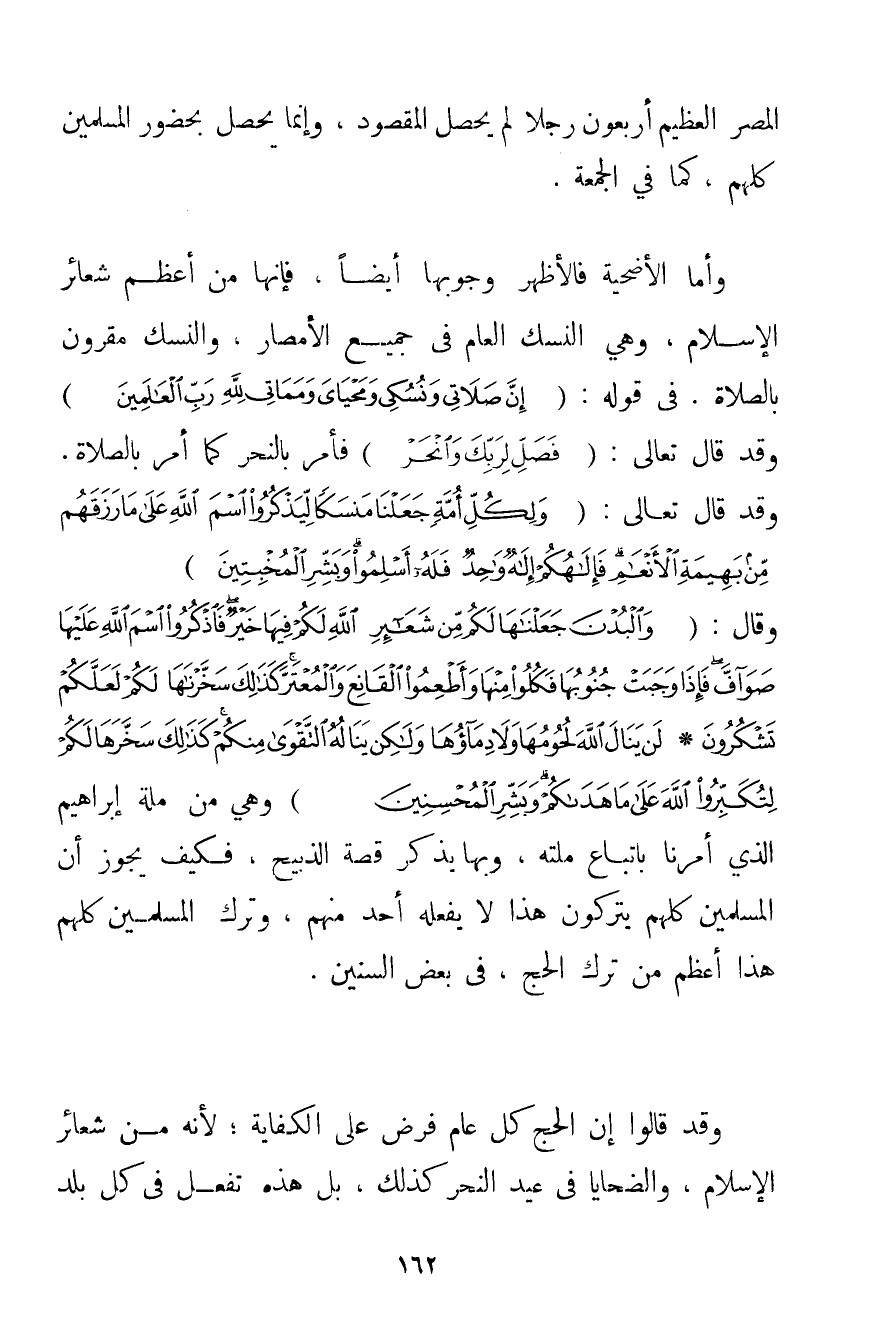 وَأَمَّا الْأُضْحِيَّةُ فَالْأَظْهَرُ وُجُوبُهَا أَيْضًا فَإِنَّهَا مِنْ أَعْظَمِ شَعَائِرِ الْإِسْلَامِ وَهِيَ النُّسُكُ الْعَامُّ فِي جَمِيعِ الْأَمْصَارِ وَالنُّسُكُ مَقْرُونٌ بِالصَّلَاةِ فِي قَوْلِهِ: {إنَّ صَلَاتِي وَنُسُكِي وَمَحْيَايَ وَمَمَاتِي لِلَّهِ رَبِّ الْعَالَمِينَ} وَقَدْ قَالَ تَعَالَى: {فَصَلِّ لِرَبِّكَ وَانْحَرْ} فَأَمَرَ بِالنَّحْرِ كَمَا أَمَرَ بِالصَّلَاةِ. وَقَدْ قَالَ تَعَالَى: {وَلِكُلِّ أُمَّةٍ جَعَلْنَا مَنْسَكًا لِيَذْكُرُوا اسْمَ اللَّهِ عَلَى مَا رَزَقَهُمْ مِنْ بَهِيمَةِ الْأَنْعَامِ فَإِلَهُكُمْ إلَهٌ وَاحِدٌ فَلَهُ أَسْلِمُوا وَبَشِّرِ الْمُخْبِتِينَ} وَقَالَ: {وَالْبُدْنَ جَعَلْنَاهَا لَكُمْ مِنْ شَعَائِرِ اللَّهِ لَكُمْ فِيهَا خَيْرٌ فَاذْكُرُوا اسْمَ اللَّهِ عَلَيْهَا صَوَافَّ فَإِذَا وَجَبَتْ جُنُوبُهَا فَكُلُوا مِنْهَا وَأَطْعِمُوا الْقَانِعَ وَالْمُعْتَرَّ كَذَلِكَ سَخَّرْنَاهَا لَكُمْ لَعَلَّكُمْ تَشْكُرُونَ} {لَنْ يَنَالَ اللَّهَ لُحُومُهَا وَلَا دِمَاؤُهَا وَلَكِنْ يَنَالُهُ التَّقْوَى مِنْكُمْ كَذَلِكَ سَخَّرَهَا لَكُمْ لِتُكَبِّرُوا اللَّهَ عَلَى مَا هَدَاكُمْ وَبَشِّرِ الْمُحْسِنِينَ} وَهِيَ مِنْ مِلَّةِ إبْرَاهِيمَ الَّذِي أُمِرْنَا بِاتِّبَاعِ مِلَّتِهِ وَبِهَا يُذْكَرُ قِصَّةُ الذَّبِيحِ فَكَيْفَ يَجُوزُ أَنَّ الْمُسْلِمِينَ كُلَّهُمْ يَتْرُكُونَ هَذَا لَا يَفْعَلُهُ أَحَدٌ مِنْهُمْ وَتَرْكُ الْمُسْلِمِينَ كُلِّهِمْ هَذَا أَعْظَمُ مِنْ تَرْكِ الْحَجِّ فِي بَعْضِ السِّنِينَ. وَقَدْ قَالُوا إنَّ الْحَجَّ كُلَّ عَامٍ فَرْضٌ عَلَى الْكِفَايَةِ؛ لِأَنَّهُ مِنْ شَعَائِرِ الْإِسْلَامِ وَالضَّحَايَا فِي عِيدِ النَّحْرِ كَذَلِكَ بَلْ هَذِهِ تُفْعَلُ فِي كُلِّ بَلَدٍ