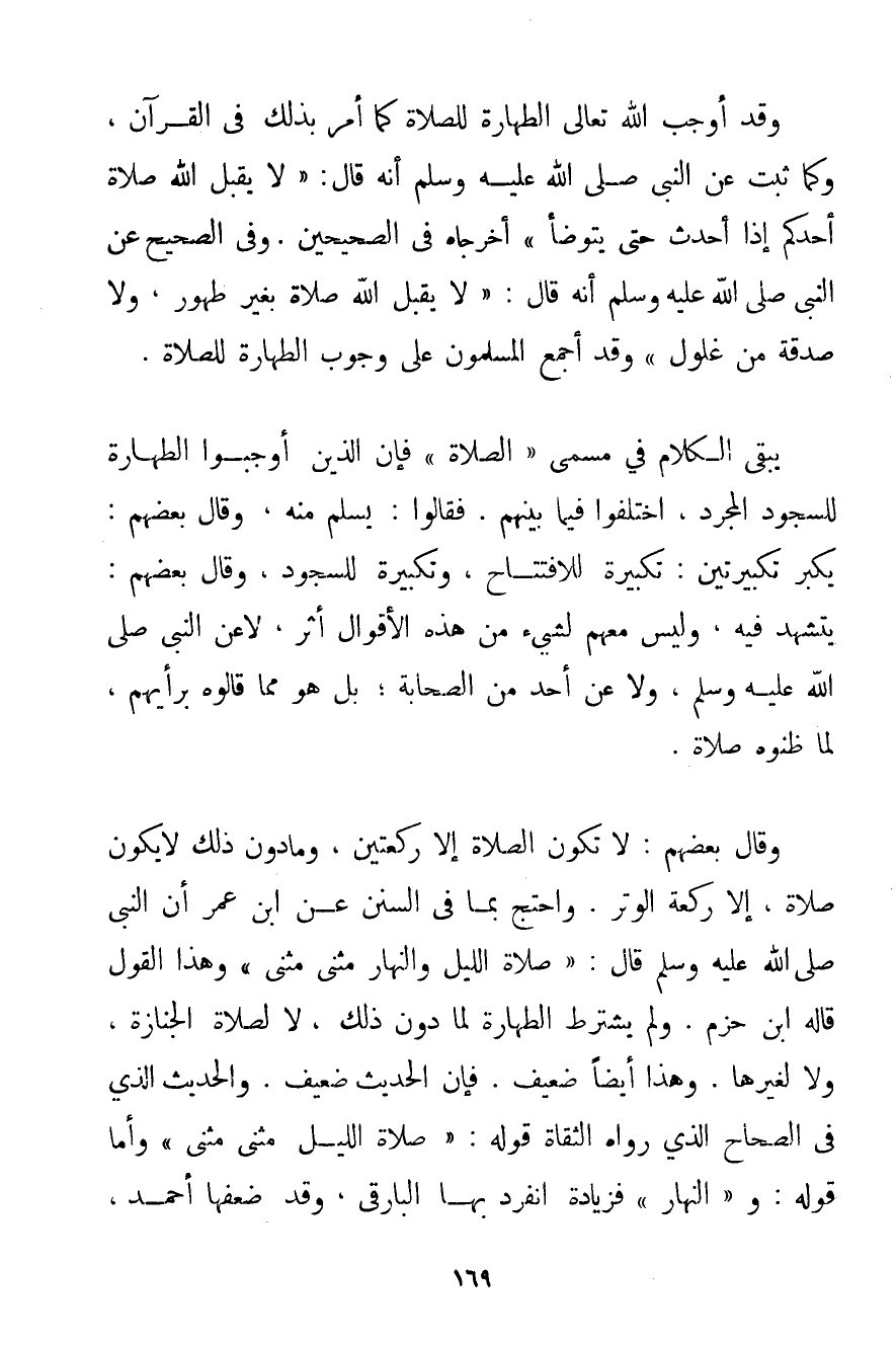 وَقَدْ أَوْجَبَ اللَّهُ تَعَالَى الطَّهَارَةَ لِلصَّلَاةِ كَمَا أَمَرَ بِذَلِكَ فِي الْقُرْآنِ وَكَمَا ثَبَتَ عَنْ النَّبِيِّ صَلَّى اللَّهُ عَلَيْهِ وَسَلَّمَ أَنَّهُ قَالَ: {لَا يَقْبَلُ اللَّهُ صَلَاةَ أَحَدِكُمْ إذَا أَحْدَثَ حَتَّى يَتَوَضَّأَ} أَخْرَجَاهُ فِي الصَّحِيحَيْنِ. وَفِي الصَّحِيحِ عَنْ النَّبِيِّ صَلَّى اللَّهُ عَلَيْهِ وَسَلَّمَ أَنَّهُ قَالَ: {لَا يَقْبَلُ اللَّهُ صَلَاةً بِغَيْرِ طَهُورٍ وَلَا صَدَقَةً مِنْ غُلُولٍ} وَقَدْ أَجْمَعَ الْمُسْلِمُونَ عَلَى وُجُوبِ الطَّهَارَةِ لِلصَّلَاةِ. يَبْقَى الْكَلَامُ فِي مُسَمَّى " الصَّلَاةِ " فَإِنَّ الَّذِينَ أَوْجَبُوا الطَّهَارَةَ لِلسُّجُودِ الْمُجَرَّدِ اخْتَلَفُوا فِيمَا بَيْنَهُمْ. فَقَالُوا: يُسَلِّمُ مِنْهُ وَقَالَ بَعْضُهُمْ: يُكَبِّرُ تَكْبِيرَتَيْنِ: تَكْبِيرَةٌ لِلِافْتِتَاحِ وَتَكْبِيرَةٌ لِلسُّجُودِ وَقَالَ بَعْضُهُمْ: يَتَشَهَّدُ فِيهِ وَلَيْسَ مَعَهُمْ لِشَيْءِ مِنْ هَذِهِ الْأَقْوَالِ أَثَرٌ لَا عَنْ النَّبِيِّ صَلَّى اللَّهُ عَلَيْهِ وَسَلَّمَ وَلَا عَنْ أَحَدٍ مِنْ الصَّحَابَةِ؛ بَلْ هُوَ مِمَّا قَالُوهُ بِرَأْيِهِمْ لَمَّا ظَنُّوهُ صَلَاةً. وَقَالَ بَعْضُهُمْ: لَا تَكُونُ الصَّلَاةُ إلَّا رَكْعَتَيْنِ وَمَا دُونُ ذَلِكَ لَا يَكُونُ صَلَاةً إلَّا رَكْعَةَ الْوِتْرِ. وَاحْتَجَّ بِمَا فِي السُّنَنِ عَنْ ابْنِ عُمَرَ أَنَّ النَّبِيَّ صَلَّى اللَّهُ عَلَيْهِ وَسَلَّمَ قَالَ: {صَلَاةُ اللَّيْلِ وَالنَّهَارِ مَثْنَى مَثْنَى} وَهَذَا الْقَوْلُ قَالَهُ ابْنُ حَزْمٍ. وَلَمْ يَشْتَرِطْ الطَّهَارَةَ لِمَا دُونَ ذَلِكَ لَا لِصَلَاةِ الْجِنَازَةِ وَلَا لِغَيْرِهَا. وَهَذَا أَيْضًا ضَعِيفٌ. فَإِنَّ الْحَدِيثَ ضَعِيفٌ. وَالْحَدِيثُ الَّذِي فِي الصِّحَاحِ الَّذِي رَوَاهُ الثقاة قَوْلُهُ: {صَلَاةُ اللَّيْلِ مَثْنَى مَثْنَى} وَأَمَّا قَوْلُهُ: وَ " النَّهَارِ " فَزِيَادَةٌ انْفَرَدَ بِهَا البارقي وَقَدْ ضَعَّفَهَا أَحْمَد