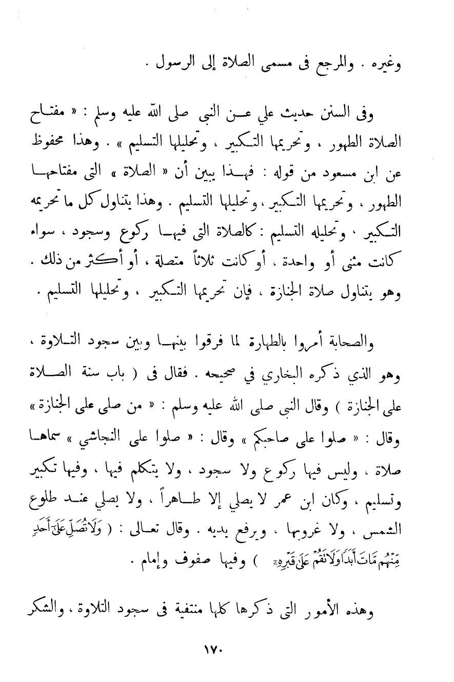وَغَيْرُهُ وَالْمَرْجِعُ فِي مُسَمَّى الصَّلَاةِ إلَى الرَّسُولِ. وَفِي السُّنَنِ حَدِيثُ عَلِيٍّ عَنْ النَّبِيِّ صَلَّى اللَّهُ عَلَيْهِ وَسَلَّمَ {مِفْتَاحُ الصَّلَاةِ الطَّهُورُ وَتَحْرِيمُهَا التَّكْبِيرُ وَتَحْلِيلُهَا التَّسْلِيمُ} . وَهَذَا مَحْفُوظٌ عَنْ ابْنِ مَسْعُودٍ مِنْ قَوْلِهِ: فَهَذَا يُبَيِّنُ أَنَّ " الصَّلَاةَ " الَّتِي مِفْتَاحُهَا الطَّهُورُ وَتَحْرِيمُهَا التَّكْبِيرُ وَتَحْلِيلُهَا التَّسْلِيمُ. وَهَذَا يَتَنَاوَلُ كُلَّ مَا تَحْرِيمُهُ التَّكْبِيرُ وَتَحْلِيلُهُ التَّسْلِيمُ: كَالصَّلَاةِ الَّتِي فِيهَا رُكُوعٌ وَسُجُودٌ سَوَاءٌ كانت مَثْنَى أَوْ وَاحِدَةً أَوْ كَانَتْ ثَلَاثًا مُتَّصِلَةً أَوْ أَكْثَرَ مِنْ ذَلِكَ. وَهُوَ يَتَنَاوَلُ صَلَاةَ الْجِنَازَةِ فَإِنَّ تَحْرِيمَهَا التَّكْبِيرُ وَتَحْلِيلَهَا التَّسْلِيمُ. وَالصَّحَابَةُ أُمِرُوا بِالطِّهَارَةِ لِمَا فَرَّقُوا بَيْنَهَا وَبَيْنَ سُجُودِ التِّلَاوَةِ وَهُوَ الَّذِي ذَكَرَهُ الْبُخَارِيُّ فِي صَحِيحِهِ. فَقَالَ فِي (بَابِ سُنَّةِ الصَّلَاةِ عَلَى الْجِنَازَةِ وَقَالَ النَّبِيُّ صَلَّى اللَّهُ عَلَيْهِ وَسَلَّمَ {مَنْ صَلَّى عَلَى الْجِنَازَةِ} وَقَالَ: {صَلُّوا عَلَى صَاحِبِكُمْ} وَقَالَ: {صَلُّوا عَلَى النَّجَاشِيِّ} سَمَّاهَا صَلَاةً وَلَيْسَ فِيهَا رُكُوعٌ وَلَا سُجُودٌ وَلَا يَتَكَلَّمُ فِيهَا وَفِيهَا تَكْبِيرٌ وَتَسْلِيمٌ وَكَانَ ابْنُ عُمَرَ لَا يُصَلِّي إلَّا طَاهِرًا وَلَا يُصَلِّي عِنْدَ طُلُوعِ الشَّمْسِ وَلَا غُرُوبِهَا وَيَرْفَعُ يَدَيْهِ. وَقَالَ تَعَالَى: {وَلَا تُصَلِّ عَلَى أَحَدٍ مِنْهُمْ مَاتَ أَبَدًا وَلَا تَقُمْ عَلَى قَبْرِهِ} وَفِيهَا صُفُوفٌ وَإِمَامٌ. وَهَذِهِ الْأُمُورُ الَّتِي ذَكَرَهَا كُلَّهَا مُنْتَفِيَةٌ فِي سُجُودِ التِّلَاوَةِ وَالشُّكْرِ