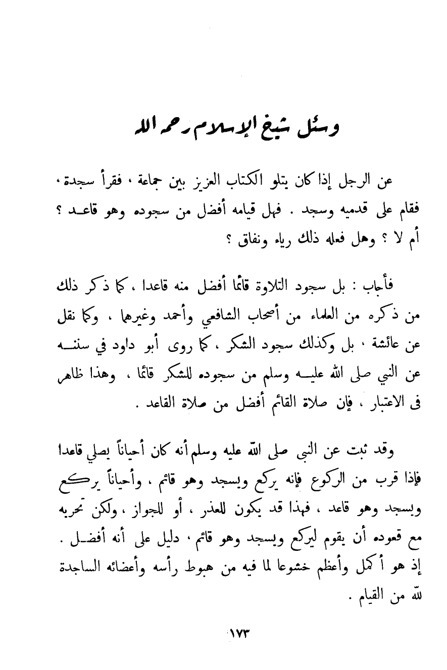 بَلْ سُجُودُ التِّلَاوَةِ قَائِمًا أَفْضَلُ مِنْهُ قَاعِدًا كَمَا ذَكَرَ ذَلِكَ مَنْ ذَكَرَهُ مِنْ الْعُلَمَاءِ مِنْ أَصْحَابِ الشَّافِعِيِّ وَأَحْمَد وَغَيْرِهِمَا وَكَمَا نُقِلَ عَنْ عَائِشَةَ بَلْ وَكَذَلِكَ سُجُودُ الشُّكْرِ كَمَا رَوَى أَبُو دَاوُد فِي سُنَنِهِ عَنْ النَّبِيِّ صَلَّى اللَّهُ عَلَيْهِ وَسَلَّمَ مِنْ سُجُودِهِ لِلشُّكْرِ قَائِمًا وَهَذَا ظَاهِرٌ فِي الِاعْتِبَارِ فَإِنَّ صَلَاةَ الْقَائِمِ أَفْضَلُ مِنْ صَلَاةِ الْقَاعِدِ. وَقَدْ ثَبَتَ {عَنْ النَّبِيِّ صَلَّى اللَّهُ عَلَيْهِ وَسَلَّمَ أَنَّهُ كَانَ أَحْيَانًا يُصَلِّي قَاعِدًا فَإِذَا قَرُبَ مِنْ الرُّكُوعِ فَإِنَّهُ يَرْكَعُ وَيَسْجُدُ وَهُوَ قَائِمٌ وَأَحْيَانًا يَرْكَعُ وَيَسْجُدُ وَهُوَ قَاعِدٌ} فَهَذَا قَدْ يَكُونُ لِلْعُذْرِ أَوْ لِلْجَوَازِ وَلَكِنْ تَحَرِّيهِ مَعَ قُعُودِهِ أَنْ يَقُومَ لِيَرْكَعَ وَيَسْجُدَ وَهُوَ قَائِمٌ دَلِيلٌ عَلَى أَنَّهُ أَفْضَلُ. إذْ هُوَ أَكْمَلُ وَأَعْظَمُ خُشُوعًا لِمَا فِيهِ مِنْ هُبُوطِ رَأْسِهِ وَأَعْضَائِهِ السَّاجِدَةِ لِلَّهِ مِنْ الْقِيَامِ.