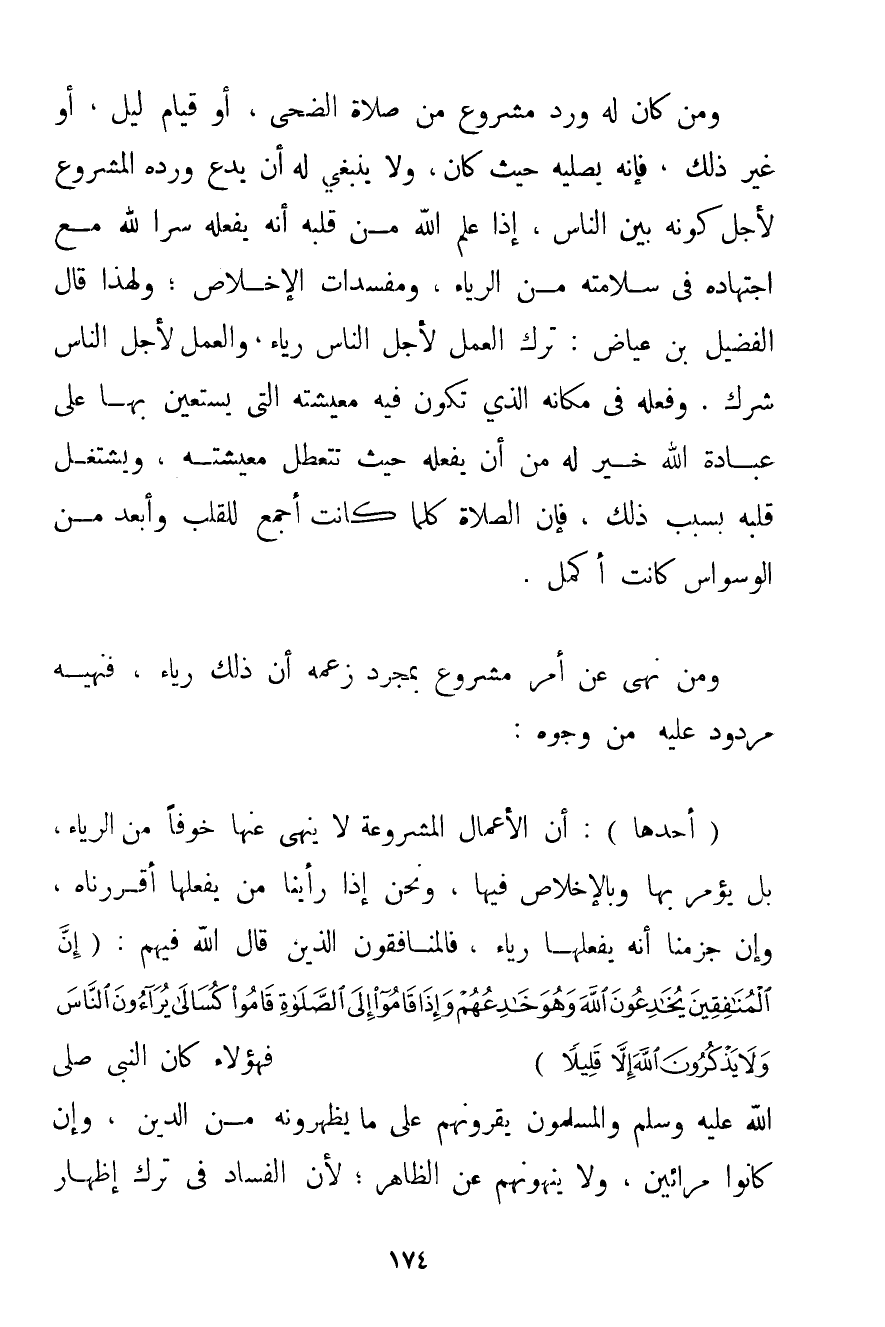 وَمَنْ كَانَ لَهُ وِرْدٌ مَشْرُوعٌ مِنْ صَلَاةِ الضُّحَى أَوْ قِيَامِ لَيْلٍ أَوْ غَيْرِ ذَلِكَ فَإِنَّهُ يُصَلِّيهِ حَيْثُ كَانَ وَلَا يَنْبَغِي لَهُ أَنْ يَدَعَ وِرْدَهُ الْمَشْرُوعَ لِأَجْلِ كَوْنِهِ بَيْنَ النَّاسِ إذَا عَلِمَ اللَّهُ مِنْ قَلْبِهِ أَنَّهُ يَفْعَلُهُ سِرًّا لِلَّهِ مَعَ اجْتِهَادِهِ فِي سَلَامَتِهِ مِنْ الرِّيَاءِ وَمُفْسِدَاتِ الْإِخْلَاصِ؛ وَلِهَذَا قَالَ الْفُضَيْل بْنُ عِيَاضٍ: تَرْكُ الْعَمَلِ لِأَجْلِ النَّاسِ رِيَاءٌ وَالْعَمَلُ لِأَجْلِ النَّاسِ شِرْكٌ. وَفِعْلُهُ فِي مَكَانِهِ الَّذِي تَكُونُ فِيهِ مَعِيشَتُهُ الَّتِي يَسْتَعِينُ بِهَا عَلَى عِبَادَةِ اللَّهِ خَيْرٌ لَهُ مِنْ أَنْ يَفْعَلَهُ حَيْثُ تَتَعَطَّلُ مَعِيشَتُهُ وَيَشْتَغِلُ قَلْبُهُ بِسَبَبِ ذَلِكَ فَإِنَّ الصَّلَاةَ كُلَّمَا كَانَتْ أَجْمَعَ لِلْقَلْبِ وَأَبْعَدَ مِنْ الْوَسْوَاسِ كَانَتْ أَكْمَلَ. وَمَنْ نَهَى عَنْ أَمْرٍ مَشْرُوعٍ بِمُجَرَّدِ زَعْمِهِ أَنَّ ذَلِكَ رِيَاءٌ فَنَهْيُهُ مَرْدُودٌ عَلَيْهِ مِنْ وُجُوهٍ: