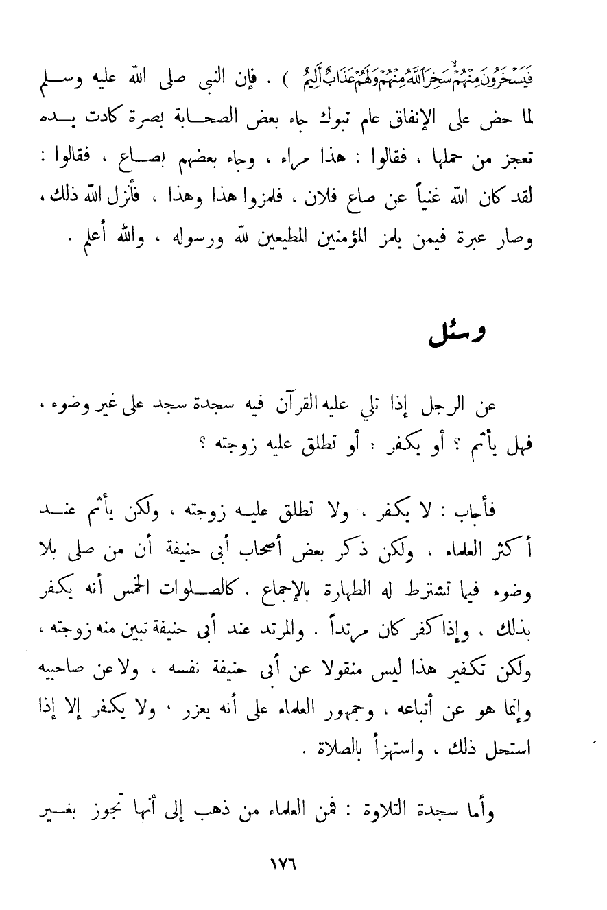 عَنْ الرَّجُلِ إذَا تُلِيَ عَلَيْهِ الْقُرْآنُ فِيهِ سَجْدَةٌ سَجَدَ عَلَى غَيْرِ وُضُوءٍ فَهَلْ يَأْثَمُ؟ أَوْ يَكْفُرُ؛ أَوْ تُطْلَقُ عَلَيْهِ زَوْجَتُهُ؟.