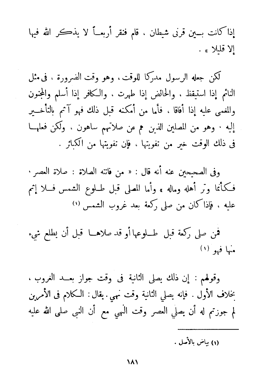 إذَا كَانَتْ بَيْنَ قَرْنَيْ شَيْطَانٍ قَامَ فَنَقَرَ أَرْبَعًا لَا يَذْكُرُ اللَّهَ فِيهَا إلَّا قَلِيلًا} . لَكِنْ جَعَلَهُ الرَّسُولُ مُدْرِكًا لِلْوَقْتِ وَهُوَ وَقْتُ الضَّرُورَةِ فِي مِثْلِ النَّائِمِ إذَا اسْتَيْقَظَ وَالْحَائِضِ إذَا طَهُرَتْ وَالْكَافِرِ إذَا أَسْلَمَ وَالْمَجْنُونِ وَالْمُغْمَى عَلَيْهِ إذَا أَفَاقَا فَأَمَّا مَنْ أَمْكَنَهُ قَبْلَ ذَلِكَ فَهُوَ آثِمٌ بِالتَّأْخِيرِ إلَيْهِ وَهُوَ مِنْ الْمُصَلِّينَ الَّذِينَ هُمْ عَنْ صَلَاتِهِمْ سَاهُونَ وَلَكِنْ فِعْلُهَا فِي ذَلِكَ الْوَقْتِ خَيْرٌ مِنْ تَفْوِيتِهَا؛ فَإِنَّ تَفْوِيتَهَا مِنْ الْكَبَائِرِ. وَفِي الصَّحِيحَيْنِ عَنْهُ أَنَّهُ قَالَ: {مَنْ فَاتَتْهُ الصَّلَاةُ: صَلَاةُ الْعَصْرِ فَكَأَنَّمَا وُتِرَ أَهْلَهُ وَمَالَهُ} وَأَمَّا الْمُصَلِّي قَبْلَ طُلُوعِ الشَّمْسِ فَلَا إثْمَ عَلَيْهِ فَإِذَا كَانَ مَنْ صَلَّى رَكْعَةً بَعْدَ غُرُوبِ الشَّمْسِ فَمَنْ صَلَّى رَكْعَةً قَبْلَ طُلُوعِهَا أَوْ قَدْ صَلَّاهَا قَبْلَ أَنْ يَطْلُعَ شَيْءٌ مِنْهَا فَهُوَ وَقَوْلُهُمْ: إنَّ ذَلِكَ يُصَلِّي الثَّانِيَةَ فِي وَقْتِ جَوَازٍ بَعْدَ الْغُرُوبِ بِخِلَافِ الْأَوَّلِ. فَإِنَّهُ يُصَلِّي الثَّانِيَةَ وَقْتَ نَهْيٍ. يُقَالُ: الْكَلَامُ فِي الْأَمْرَيْنِ لِمَ جَوَّزْتُمْ لَهُ أَنْ يُصَلِّيَ الْعَصْرَ وَقْتَ النَّهْيِ مَعَ أَنَّ النَّبِيَّ صَلَّى اللَّهُ عَلَيْهِ وَسَلَّمَ