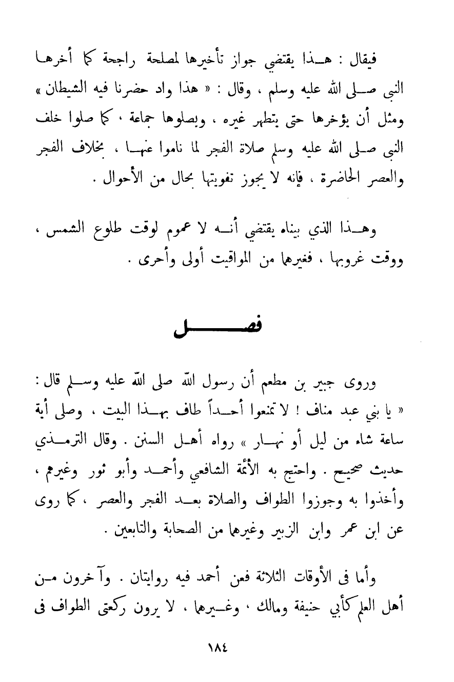 وَرَوَى جُبَيْرُ بْنُ مُطْعِمٍ أَنَّ رَسُولَ اللَّهِ صَلَّى اللَّهُ عَلَيْهِ وَسَلَّمَ قَالَ: {يَا بَنِي عَبْدِ مَنَافٍ لَا تَمْنَعُوا أَحَدًا طَافَ بِهَذَا الْبَيْتِ وَصَلَّى أَيَّةَ سَاعَةٍ شَاءَ مِنْ لَيْلٍ أَوْ نَهَارٍ} رَوَاهُ أَهْلُ السُّنَنِ. وَقَالَ التِّرْمِذِيُّ حَدِيثٌ صَحِيحٌ. وَاحْتَجَّ بِهِ الْأَئِمَّةُ الشَّافِعِيُّ وَأَحْمَد وَأَبُو ثَوْرٍ وَغَيْرُهُمْ وَأَخَذُوا بِهِ وَجَوَّزُوا الطَّوَافَ وَالصَّلَاةَ بَعْدَ الْفَجْرِ وَالْعَصْرِ كَمَا رُوِيَ عَنْ ابْنِ عُمَرَ وَابْنِ الزُّبَيْرِ وَغَيْرِهِمَا مِنْ الصَّحَابَةِ وَالتَّابِعِينَ. وَأَمَّا فِي الْأَوْقَاتِ الثَّلَاثَةِ فَعَنْ أَحْمَد فِيهِ رِوَايَتَانِ. وَآخَرُونَ مِنْ أَهْلِ الْعِلْمِ كَأَبِي حَنِيفَةَ وَمَالِكٍ وَغَيْرِهِمَا لَا يَرَوْنَ رَكْعَتَيْ الطَّوَافِ فِي