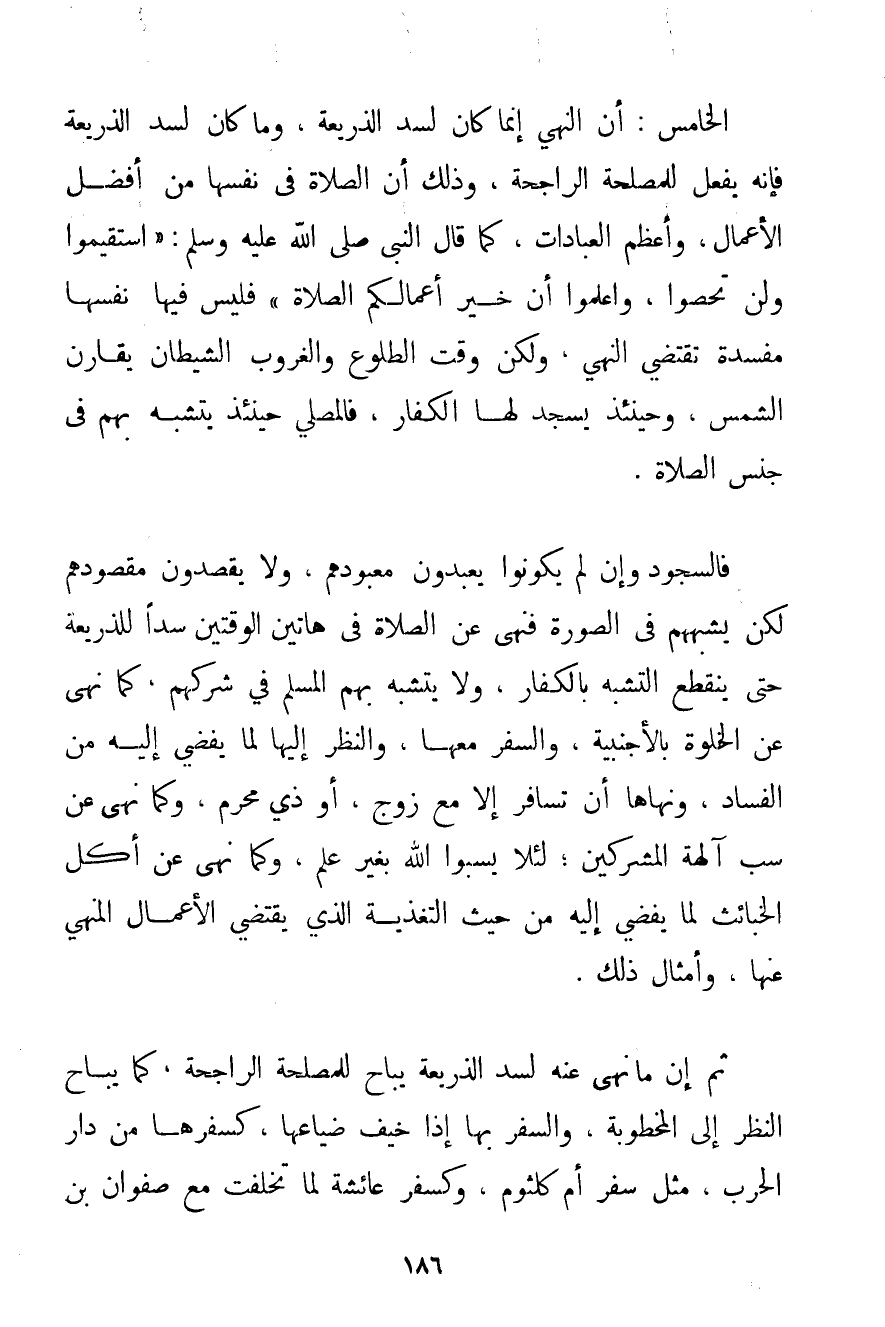 الْخَامِسُ: أَنَّ النَّهْيَ إنَّمَا كَانَ لِسَدِّ الذَّرِيعَةِ وَمَا كَانَ لِسَدِّ الذَّرِيعَةِ فَإِنَّهُ يُفْعَلُ لِلْمَصْلَحَةِ الرَّاجِحَةِ وَذَلِكَ أَنَّ الصَّلَاةَ فِي نَفْسِهَا مِنْ أَفْضَلِ الْأَعْمَالِ وَأَعْظَمِ الْعِبَادَاتِ كَمَا قَالَ النَّبِيُّ صَلَّى اللَّهُ عَلَيْهِ وَسَلَّمَ {اسْتَقِيمُوا وَلَنْ تُحْصُوا وَاعْلَمُوا أَنَّ خَيْرَ أَعْمَالِكُمْ الصَّلَاةُ} فَلَيْسَ فِيهَا نَفْسِهَا مَفْسَدَةٌ تَقْتَضِي النَّهْيَ وَلَكِنْ وَقْتُ الطُّلُوعَ وَالْغُرُوبِ الشَّيْطَانُ يُقَارِنُ الشَّمْسَ وَحِينَئِذٍ يَسْجُدُ لَهَا الْكُفَّارُ فَالْمُصَلِّي حِينَئِذٍ يَتَشَبَّهُ بِهِمْ فِي جِنْسِ الصَّلَاةِ. فَالسُّجُودُ وَإِنْ لَمْ يَكُونُوا يَعْبُدُونَ مَعْبُودَهُمْ وَلَا يَقْصِدُونَ مَقْصُودَهُمْ لَكِنْ يُشَبِّهُهُمْ فِي الصُّورَةِ فَنَهَى عَنْ الصَّلَاةِ فِي هَاتَيْنِ الْوَقْتَيْنِ سَدًّا لِلذَّرِيعَةِ حَتَّى يَنْقَطِعَ التَّشَبُّهُ بِالْكُفَّارِ وَلَا يَتَشَبَّهَ بِهِمْ الْمُسْلِمُ فِي شِرْكِهِمْ كَمَا نَهَى عَنْ الْخَلْوَةِ بِالْأَجْنَبِيَّةِ وَالسَّفَرِ مَعَهَا وَالنَّظَرِ إلَيْهَا لِمَا يُفْضِي إلَيْهِ مِنْ الْفَسَادِ وَنَهَاهَا أَنْ تُسَافِرَ إلَّا مَعَ زَوْجٍ أَوْ ذِي مَحْرَمٍ وَكَمَا نَهَى عَنْ سَبِّ آلِهَةِ الْمُشْرِكِينَ؛ لِئَلَّا يَسُبُّوا اللَّهَ بِغَيْرِ عِلْمٍ وَكَمَا نَهَى عَنْ أَكْلِ الْخَبَائِثِ لِمَا يُفْضِي إلَيْهِ مِنْ حَيْثُ التَّغْذِيَةُ الَّذِي يَقْتَضِي الْأَعْمَالَ الْمَنْهِيَّ عَنْهَا وَأَمْثَالِ ذَلِكَ.