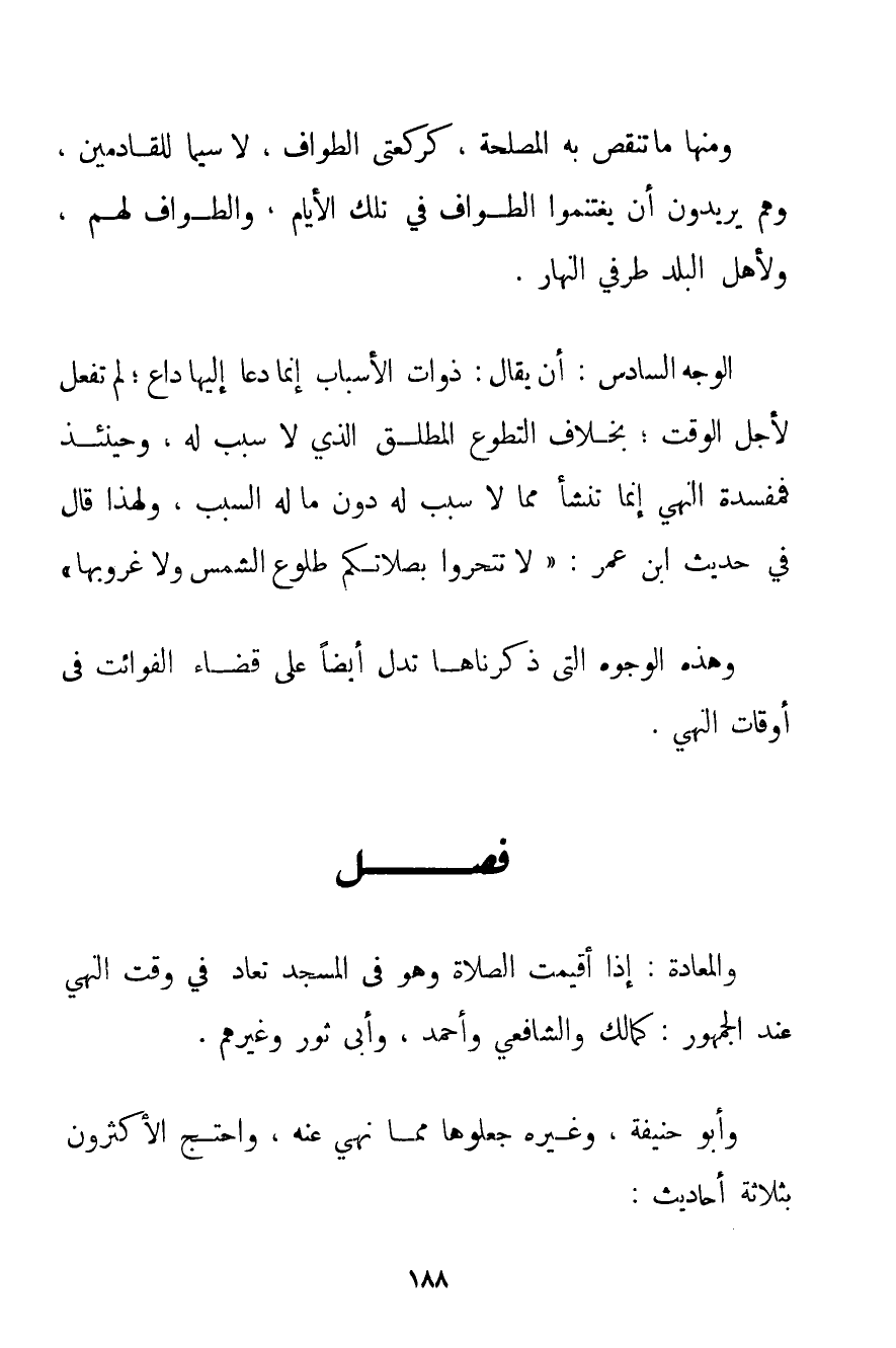 وَمِنْهَا مَا تَنْقُصُ بِهِ الْمَصْلَحَةُ كَرَكْعَتَيْ الطَّوَافِ لَا سِيَّمَا لِلْقَادِمِينَ وَهُمْ يُرِيدُونَ أَنْ يَغْتَنِمُوا الطَّوَافَ فِي تِلْكَ الْأَيَّامِ وَالطَّوَافُ لَهُمْ وَلِأَهْلِ الْبَلَدِ طَرَفَيْ النَّهَارِ. الْوَجْهُ السَّادِسُ: أَنْ يُقَالَ: ذَوَاتُ الْأَسْبَابِ إنَّمَا دَعَا إلَيْهَا دَاعٍ؛ لَمْ تُفْعَلْ لِأَجْلِ الْوَقْتِ؛ بِخِلَافِ التَّطَوُّعِ الْمُطْلَقِ الَّذِي لَا سَبَبَ لَهُ وَحِينَئِذٍ فَمَفْسَدَةُ النَّهْيِ إنَّمَا تَنْشَأُ مِمَّا لَا سَبَبَ لَهُ دُونَ مَا لَهُ السَّبَبُ وَلِهَذَا قَالَ فِي حَدِيثِ ابْنِ عُمَرَ: {لَا تَتَحَرَّوْا بِصَلَاتِكُمْ طُلُوعَ الشَّمْسِ وَلَا غُرُوبَهَا} وَهَذِهِ الْوُجُوهُ الَّتِي ذَكَرْنَاهَا تَدُلُّ أَيْضًا عَلَى قَضَاءِ الْفَوَائِتِ فِي أَوْقَاتِ النَّهْيِ.