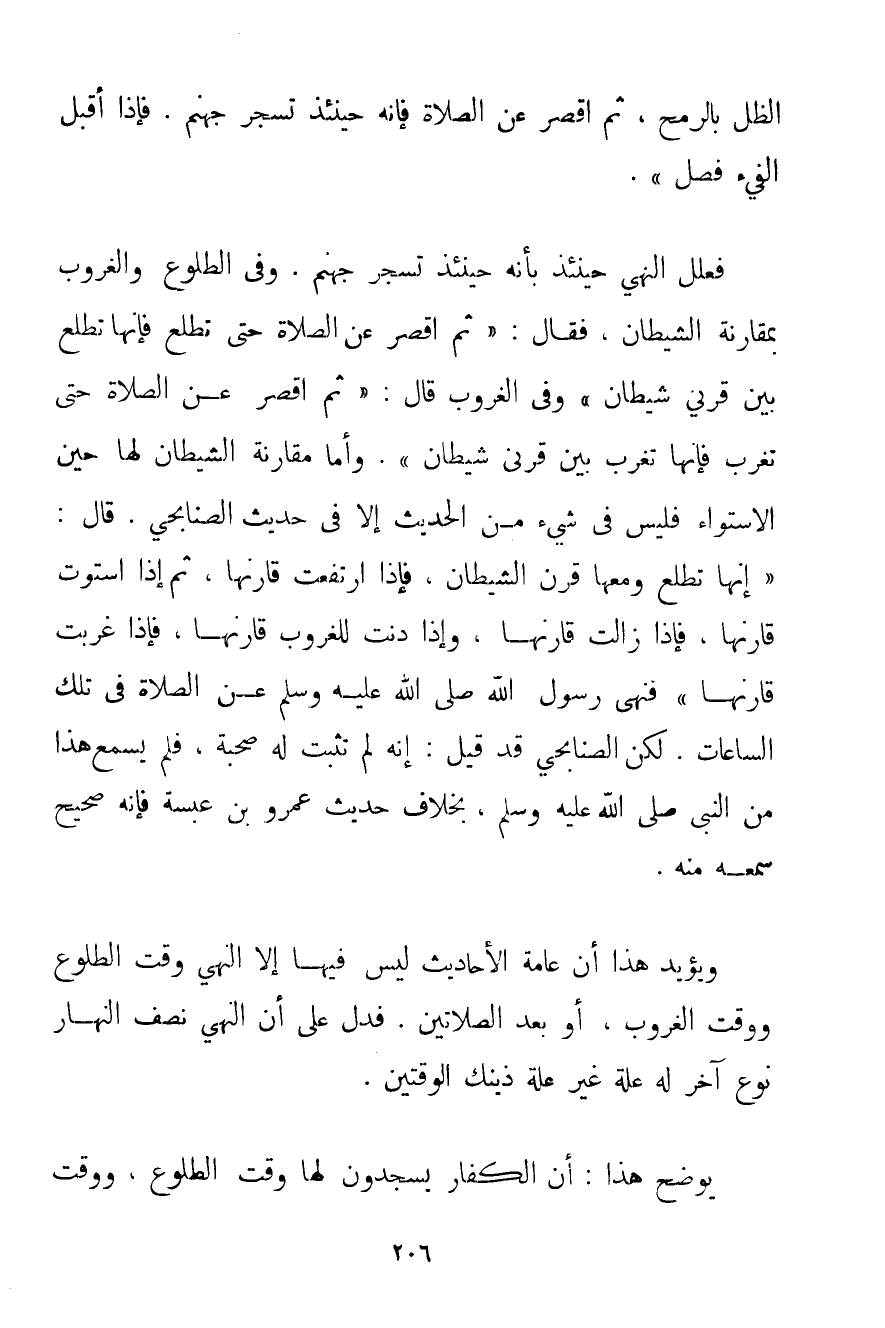 الظِّلُّ بِالرُّمْحِ ثُمَّ اُقْصُرْ عَنْ الصَّلَاةِ فَإِنَّهُ حِينَئِذٍ تُسْجَرُ جَهَنَّمُ فَإِذَا أَقْبَلَ الْفَيْءُ فَصَلِّ} . فَعَلَّلَ النَّهْيَ حِينَئِذٍ بِأَنَّهُ حِينَئِذٍ تُسْجَرُ جَهَنَّمُ. وَفِي الطُّلُوعِ وَالْغُرُوبِ بِمُقَارَنَةِ الشَّيْطَانِ فَقَالَ: " {ثُمَّ اُقْصُرْ عَنْ الصَّلَاةِ حَتَّى تَطْلُعَ فَإِنَّهَا تَطْلُعُ بَيْنَ قَرْنَيْ شَيْطَانٍ} وَفِي الْغُرُوبِ قَالَ: " {ثُمَّ اُقْصُرْ عَنْ الصَّلَاةِ حَتَّى تَغْرُبَ فَإِنَّهَا تَغْرُبُ بَيْنَ قَرْنَيْ شَيْطَانٍ} . وَأَمَّا مُقَارَنَةُ الشَّيْطَانِ لَهَا حِينَ الِاسْتِوَاءِ فَلَيْسَ فِي شَيْءٍ مِنْ الْحَدِيثِ إلَّا فِي حَدِيثِ الصنابحي. قَالَ: " {إنَّهَا تَطْلُعُ وَمَعَهَا قَرْنُ الشَّيْطَانِ فَإِذَا ارْتَفَعَتْ قَارَنَهَا ثُمَّ إذَا اسْتَوَتْ قَارَنَهَا فَإِذَا زَالَتْ قَارَنَهَا وَإِذَا دَنَتْ لِلْغُرُوبِ قَارَنَهَا فَإِذَا غَرَبَتْ قَارَنَهَا} فَنَهَى رَسُولُ اللَّهِ صَلَّى اللَّهُ عَلَيْهِ وَسَلَّمَ عَنْ الصَّلَاةِ فِي تِلْكَ السَّاعَاتِ. لَكِنْ الصنابحي قَدْ قِيلَ: إنَّهُ لَمْ تَثْبُتْ لَهُ صُحْبَةٌ فَلَمْ يَسْمَعْ هَذَا مِنْ النَّبِيِّ صَلَّى اللَّهُ عَلَيْهِ وَسَلَّمَ بِخِلَافِ حَدِيثِ عَمْرِو بْنِ عبسة فَإِنَّهُ صَحِيحٌ سَمِعَهُ مِنْهُ. وَيُؤَيِّدُ هَذَا أَنَّ عَامَّةَ الْأَحَادِيثِ لَيْسَ فِيهَا إلَّا النَّهْيُ وَقْتَ الطُّلُوعِ وَوَقْتَ الْغُرُوبِ أَوْ بَعْدَ الصَّلَاتَيْنِ. فَدَلَّ عَلَى أَنَّ النَّهْيَ نِصْفَ النَّهَارِ نَوْعٌ آخَرُ لَهُ عِلَّةٌ غَيْرُ عِلَّةِ ذَيْنك الْوَقْتَيْنِ. يُوَضِّحُ هَذَا: أَنَّ الْكُفَّارَ يَسْجُدُونَ لَهَا وَقْتَ الطُّلُوعِ وَوَقْتَ
