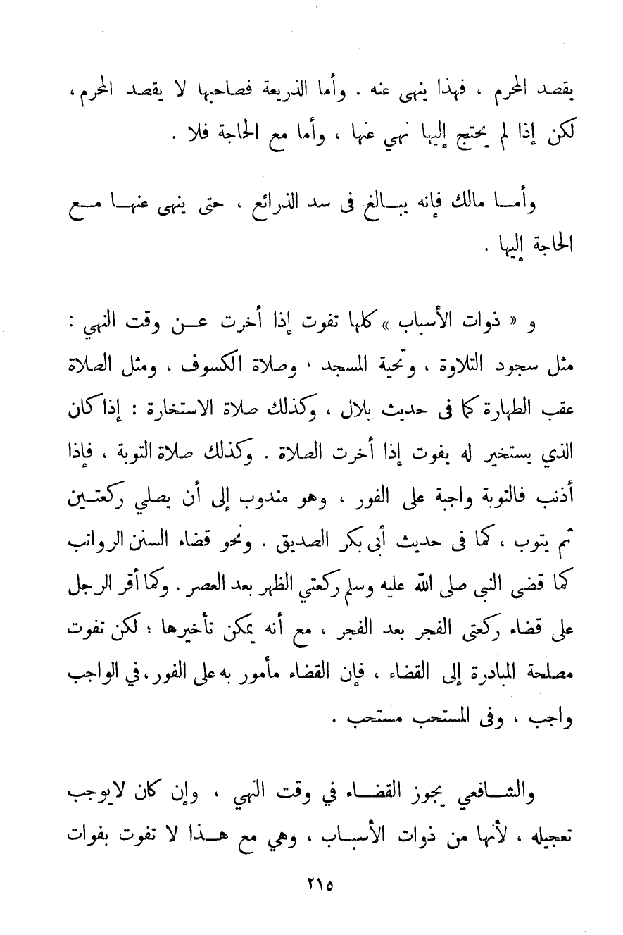 يَقْصِدُ الْمُحْرِمَ فَهَذَا يُنْهَى عَنْهُ. وَأَمَّا الذَّرِيعَةُ فَصَاحِبُهَا لَا يَقْصِدُ الْمُحْرِمَ لَكِنْ إذَا لَمْ يَحْتَجْ إلَيْهَا نُهِيَ عَنْهَا وَأَمَّا مَعَ الْحَاجَةِ فَلَا. وَأَمَّا مَالِكٌ فَإِنَّهُ يُبَالِغُ فِي سَدِّ الذَّرَائِعِ حَتَّى يَنْهَى عَنْهَا مَعَ الْحَاجَةِ إلَيْهَا. وَ " ذَوَاتُ الْأَسْبَابِ " كُلِّهَا تَفُوتُ إذَا أُخِّرَتْ عَنْ وَقْتِ النَّهْيِ: مِثْلَ سُجُودِ التِّلَاوَةِ وَتَحِيَّةِ الْمَسْجِدِ وَصَلَاةِ الْكُسُوفِ وَمِثْلَ الصَّلَاةِ عَقِبَ الطَّهَارَةِ كَمَا فِي حَدِيثِ بِلَالٍ وَكَذَلِكَ صَلَاةُ الِاسْتِخَارَةِ: إذَا كَانَ الَّذِي يَسْتَخِيرُ لَهُ يَفُوتُ إذَا أُخِّرَتْ الصَّلَاةُ. وَكَذَلِكَ صَلَاةُ التَّوْبَةِ فَإِذَا أَذْنَبَ فَالتَّوْبَةُ وَاجِبَةٌ عَلَى الْفَوْرِ وَهُوَ مَنْدُوبٌ إلَى أَنْ يُصَلِّيَ رَكْعَتَيْنِ ثُمَّ يَتُوبَ كَمَا فِي حَدِيثِ أَبِي بَكْرٍ الصِّدِّيقِ. وَنَحْوَ قَضَاءِ السُّنَنِ الرَّوَاتِبِ كَمَا قَضَى النَّبِيُّ صَلَّى اللَّهُ عَلَيْهِ وَسَلَّمَ رَكْعَتَيْ الظُّهْرِ بَعْدَ الْعَصْرِ. وَكَمَا أَقَرَّ الرَّجُلُ عَلَى قَضَاءِ رَكْعَتَيْ الْفَجْرِ بَعْدَ الْفَجْرِ مَعَ أَنَّهُ يُمْكِنُ تَأْخِيرُهَا؛ لَكِنْ تَفُوتُ مَصْلَحَةُ الْمُبَادَرَةِ إلَى الْقَضَاءِ فَإِنَّ الْقَضَاءَ مَأْمُورٌ بِهِ عَلَى الْفَوْرِ فِي الْوَاجِبِ وَاجِبٌ وَفِي الْمُسْتَحَبِّ مُسْتَحَبٌّ. وَالشَّافِعِيُّ يُجَوِّزُ الْقَضَاءَ فِي وَقْتِ النَّهْيِ وَإِنْ كَانَ لَا يُوجِبُ تَعْجِيلَهُ لِأَنَّهَا مِنْ ذَوَاتِ الْأَسْبَابِ وَهِيَ مَعَ هَذَا لَا تَفُوتُ بِفَوَاتِ