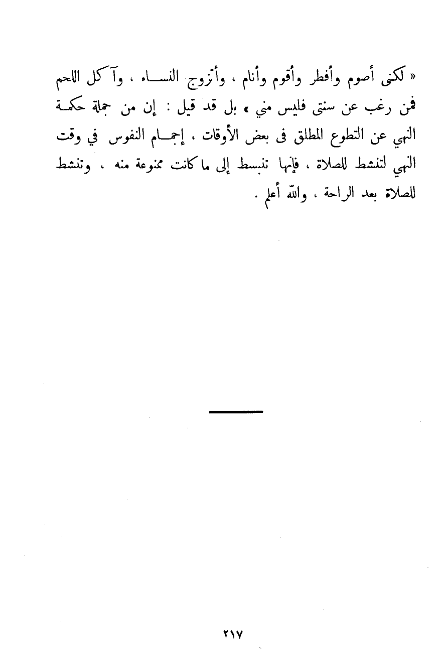 لَكِنْ أَصُومُ وَأُفْطِرُ وَأَقُومُ وَأَنَامُ وَأَتَزَوَّجُ النِّسَاءَ وَآكُلُ اللَّحْمَ فَمَنْ رَغِبَ عَنْ سُنَّتِي فَلَيْسَ مِنِّي} بَلْ قَدْ قِيلَ: إنَّ مِنْ جُمْلَةِ حِكْمَةِ النَّهْيِ عَنْ التَّطَوُّعِ الْمُطْلَقِ فِي بَعْضِ الْأَوْقَاتِ إجْمَامَ النُّفُوسِ فِي وَقْتِ النَّهْيِ لِتَنْشَطَ لِلصَّلَاةِ فَإِنَّهَا تَنْبَسِطُ إلَى مَا كَانَتْ مَمْنُوعَةً مِنْهُ وَتَنْشَطُ لِلصَّلَاةِ بَعْدَ الرَّاحَةِ وَاَللَّهُ أَعْلَمُ.