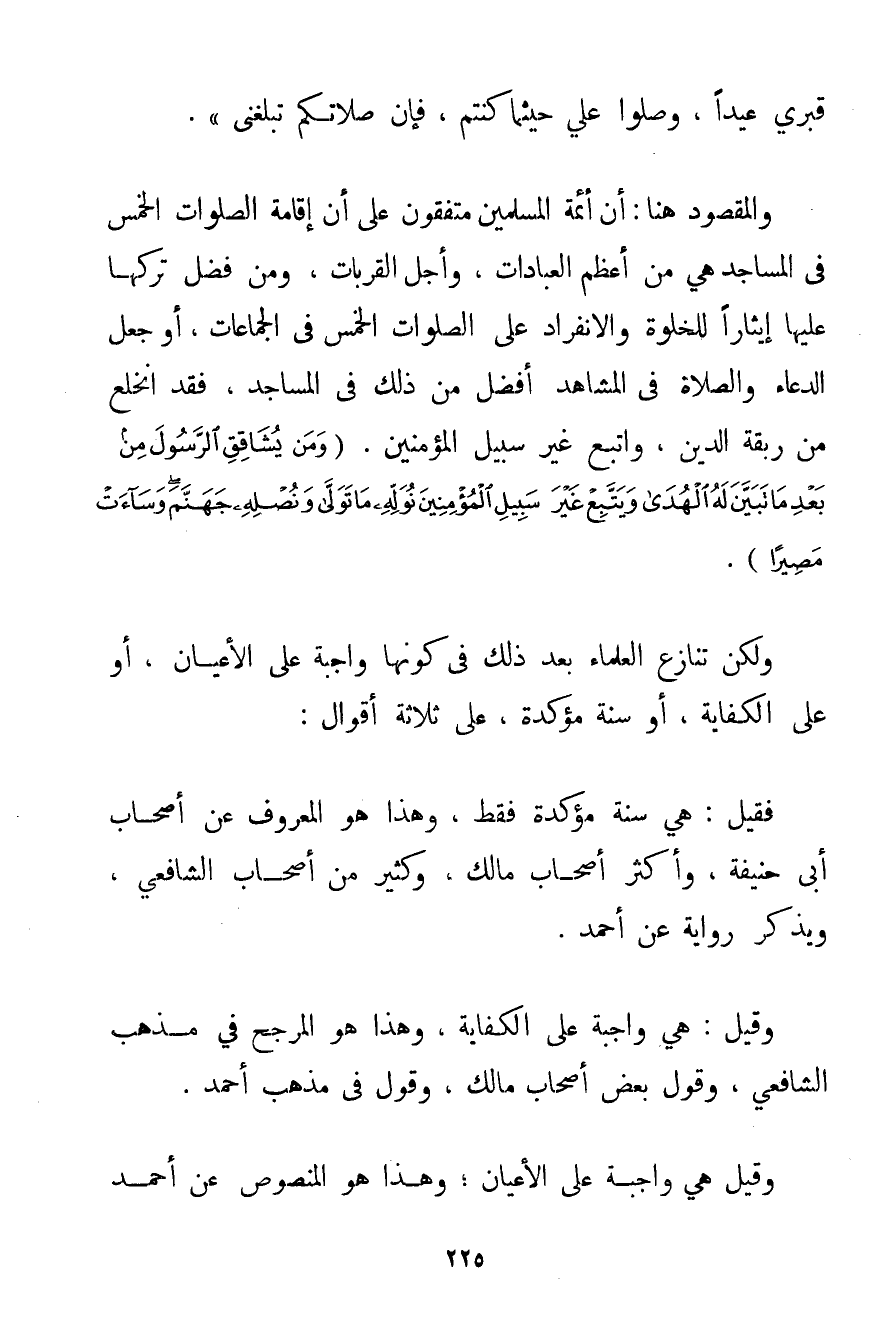 وَالْمَقْصُودُ هُنَا: أَنَّ أَئِمَّةَ الْمُسْلِمِينَ مُتَّفِقُونَ عَلَى أَنَّ إقَامَةَ الصَّلَوَاتِ الْخَمْسِ فِي الْمَسَاجِدِ هِيَ مِنْ أَعْظَمِ الْعِبَادَاتِ وَأَجَلِّ الْقُرُبَاتِ وَمَنْ فَضَّلَ تَرْكَهَا عَلَيْهَا إيثَارًا لِلْخَلْوَةِ وَالِانْفِرَادِ عَلَى الصَّلَوَاتِ الْخَمْسِ فِي الْجَمَاعَاتِ أَوْ جَعَلَ الدُّعَاءَ وَالصَّلَاةَ فِي الْمَشَاهِدِ أَفْضَلَ مِنْ ذَلِكَ فِي الْمَسَاجِدِ فَقَدْ انْخَلَعَ مِنْ رِبْقَةِ الدِّينِ وَاتَّبَعَ غَيْرَ سَبِيلِ الْمُؤْمِنِينَ. {وَمَنْ يُشَاقِقِ الرَّسُولَ مِنْ بَعْدِ مَا تَبَيَّنَ لَهُ الْهُدَى وَيَتَّبِعْ غَيْرَ سَبِيلِ الْمُؤْمِنِينَ نُوَلِّهِ مَا تَوَلَّى وَنُصْلِهِ جَهَنَّمَ وَسَاءَتْ مَصِيرًا} . وَلَكِنْ تَنَازَعَ الْعُلَمَاءُ بَعْدَ ذَلِكَ فِي كَوْنِهَا وَاجِبَةً عَلَى الْأَعْيَانِ أَوْ عَلَى الْكِفَايَةِ أَوْ سُنَّةً مُؤَكَّدَةً عَلَى ثَلَاثَةِ أَقْوَالٍ: فَقِيلَ: هِيَ سُنَّةٌ مُؤَكَّدَةٌ فَقَطْ وَهَذَا هُوَ الْمَعْرُوفُ عَنْ أَصْحَابِ أَبِي حَنِيفَةَ وَأَكْثَرِ أَصْحَابِ مَالِكٍ وَكَثِيرٍ مِنْ أَصْحَابِ الشَّافِعِيِّ وَيُذْكَرُ رِوَايَةً عَنْ أَحْمَد. وَقِيلَ: هِيَ وَاجِبَةٌ عَلَى الْكِفَايَةِ وَهَذَا هُوَ الْمُرَجَّحُ فِي مَذْهَبِ الشَّافِعِيِّ وَقَوْلِ بَعْضِ أَصْحَابِ مَالِكٍ وَقَوْلٌ فِي مَذْهَبِ أَحْمَد. وَقِيلَ هِيَ وَاجِبَةٌ عَلَى الْأَعْيَانِ؛ وَهَذَا هُوَ الْمَنْصُوصُ عَنْ أَحْمَد
