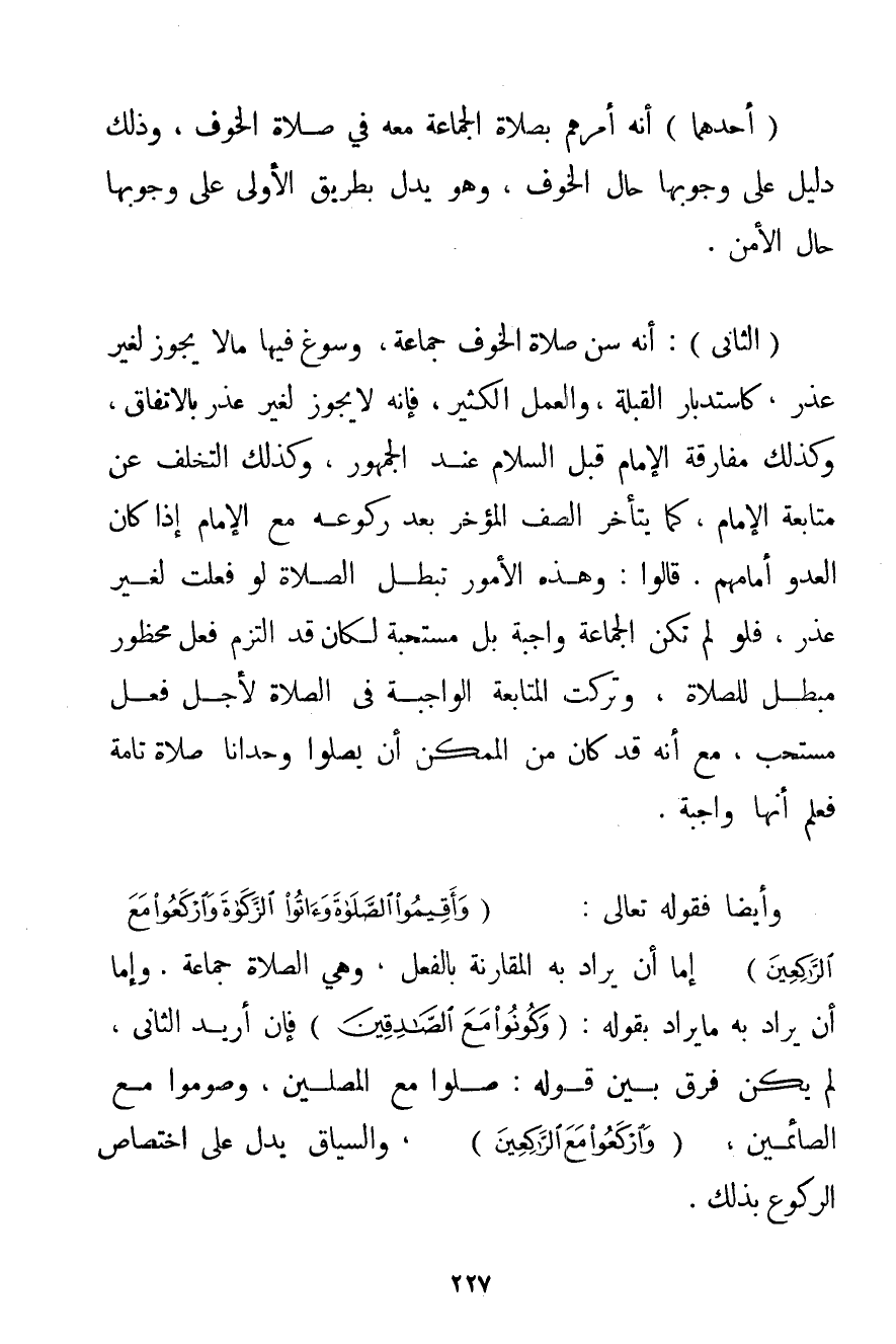 الثَّانِي: أَنَّهُ سَنَّ صَلَاةَ الْخَوْفِ جَمَاعَةً وَسَوَّغَ فِيهَا مَا لَا يَجُوزُ لِغَيْرِ عُذْرٍ. كَاسْتِدْبَارِ الْقِبْلَةِ وَالْعَمَلِ الْكَثِيرِ فَإِنَّهُ لَا يَجُوزُ لِغَيْرِ عُذْرٍ بِالِاتِّفَاقِ وَكَذَلِكَ مُفَارَقَةُ الْإِمَامِ قَبْلَ السَّلَامِ عِنْدَ الْجُمْهُورِ وَكَذَلِكَ التَّخَلُّفُ عَنْ مُتَابَعَةِ الْإِمَامِ كَمَا يَتَأَخَّرُ الصَّفُّ الْمُؤَخَّرُ بَعْدَ رُكُوعِهِ مَعَ الْإِمَامِ إذَا كَانَ الْعَدُوُّ أَمَامَهُمْ. قَالُوا: وَهَذِهِ الْأُمُورُ تُبْطِلُ الصَّلَاةَ لَوْ فُعِلَتْ لِغَيْرِ عُذْرٍ فَلَوْ لَمْ تَكُنْ الْجَمَاعَةُ وَاجِبَةً بَلْ مُسْتَحَبَّةً لَكَانَ قَدْ الْتَزَمَ فِعْلَ مَحْظُورٍ مُبْطِلٍ لِلصَّلَاةِ وَتُرِكَتْ الْمُتَابَعَةُ الْوَاجِبَةُ فِي الصَّلَاةِ لِأَجْلِ فِعْلٍ مُسْتَحَبٍّ مَعَ أَنَّهُ قَدْ كَانَ مِنْ الْمُمْكِنِ أَنْ يُصَلُّوا وُحْدَانًا صَلَاةً تَامَّةً فَعُلِمَ أَنَّهَا وَاجِبَةٌ. وَأَيْضًا فَقَوْلُهُ تَعَالَى: {وَأَقِيمُوا الصَّلَاةَ وَآتُوا الزَّكَاةَ وَارْكَعُوا مَعَ الرَّاكِعِينَ} إمَّا أَنْ يُرَادَ بِهِ الْمُقَارَنَةُ بِالْفِعْلِ وَهِيَ الصَّلَاةُ جَمَاعَةً. وَإِمَّا أَنْ يُرَادَ بِهِ مَا يُرَادُ بِقَوْلِهِ: {وَكُونُوا مَعَ الصَّادِقِينَ} فَإِنْ أُرِيدَ الثَّانِي لَمْ يَكُنْ فَرْقٌ بَيْنَ قَوْلِهِ: صَلُّوا مَعَ الْمُصَلِّينَ وَصُومُوا مَعَ الصَّائِمِينَ {وَارْكَعُوا مَعَ الرَّاكِعِينَ} وَالسِّيَاقُ يَدُلُّ عَلَى اخْتِصَاصِ الرُّكُوعِ بِذَلِكَ.