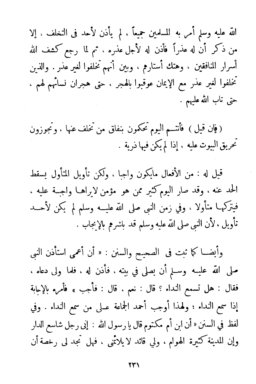 صَلَّى اللَّهُ عَلَيْهِ وَسَلَّمَ أَمَرَ بِهِ الْمُسْلِمِينَ جَمِيعًا لَمْ يَأْذَنْ لِأَحَدِ فِي التَّخَلُّفِ إلَّا مَنْ ذَكَرَ أَنَّ لَهُ عُذْرًا فَأَذِنَ لَهُ لِأَجْلِ عُذْرِهِ. ثُمَّ لَمَّا رَجَعَ كَشَفَ اللَّهُ أَسْرَارَ الْمُنَافِقِينَ وَهَتَكَ أَسْتَارَهُمْ وَبَيَّنَ أَنَّهُمْ تَخَلَّفُوا لِغَيْرِ عُذْرٍ. وَاَلَّذِينَ تَخَلَّفُوا لِغَيْرِ عُذْرٍ مَعَ الْإِيمَانِ عُوقِبُوا بِالْهَجْرِ حَتَّى هِجْرَانِ نِسَائِهِمْ لَهُمْ حَتَّى تَابَ اللَّهُ عَلَيْهِمْ. (فَإِنْ قِيلَ فَأَنْتُمْ الْيَوْمَ تَحْكُمُونَ بِنِفَاقِ مَنْ تَخَلَّفَ عَنْهَا وَتُجَوِّزُونَ تَحْرِيقَ الْبُيُوتِ عَلَيْهِ إذَا لَمْ يَكُنْ فِيهَا ذُرِّيَّةٌ. قِيلَ لَهُ: مِنْ الْأَفْعَالِ مَا يَكُونُ وَاجِبًا وَلَكِنْ تَأْوِيلُ الْمُتَأَوِّلِ يُسْقِطُ الْحَدَّ عَنْهُ وَقَدْ صَارَ الْيَوْمَ كَثِيرٌ مِمَّنْ هُوَ مُؤْمِنٌ لَا يَرَاهَا وَاجِبَةً عَلَيْهِ فَيَتْرُكُهَا مُتَأَوِّلًا وَفِي زَمَنِ النَّبِيِّ صَلَّى اللَّهُ عَلَيْهِ وَسَلَّمَ لَمْ يَكُنْ لِأَحَدِ تَأْوِيلٌ لِأَنَّ النَّبِيَّ صَلَّى اللَّهُ عَلَيْهِ وَسَلَّمَ قَدْ بَاشَرَهُمْ بِالْإِيجَابِ. وَأَيْضًا كَمَا ثَبَتَ فِي الصَّحِيحِ وَالسُّنَنِ: " {أَنَّ أَعْمَى اسْتَأْذَنَ النَّبِيَّ صَلَّى اللَّهُ عَلَيْهِ وَسَلَّمَ أَنْ يُصَلِّيَ فِي بَيْتِهِ فَأَذِنَ لَهُ فَلَمَّا وَلَّى دَعَاهُ فَقَالَ: هَلْ تَسْمَعُ النِّدَاءَ؟ قَالَ: نَعَمْ قَالَ: فَأَجِبْ} فَأَمَرَهُ بِالْإِجَابَةِ إذَا سَمِعَ النِّدَاءَ؛ وَلِهَذَا أَوْجَبَ أَحْمَد الْجَمَاعَةَ عَلَى مَنْ سَمِعَ النِّدَاءَ. وَفِي لَفْظٍ فِي السُّنَنِ " {أَنَّ ابْنَ أُمِّ مَكْتُومٍ قَالَ يَا رَسُولَ اللَّهِ: إنِّي رَجُلٌ شَاسِعُ الدَّارِ وَإِنَّ الْمَدِينَةَ كَثِيرَةُ الْهَوَامِّ وَلِي قَائِدٌ لَا يُلَائِمُنِي فَهَلْ تَجِدُ لِي رُخْصَةً أَنْ