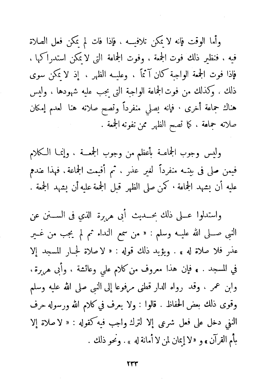 وَأَمَّا الْوَقْتُ فَإِنَّهُ لَا يُمْكِنُ تَلَافِيهِ فَإِذَا فَاتَ لَمْ يُمْكِنْ فِعْلُ الصَّلَاةِ فِيهِ فَنَظِيرُ ذَلِكَ فَوْتُ الْجُمُعَةِ وَفَوْتُ الْجَمَاعَةِ الَّتِي لَا يُمْكِنُ اسْتِدْرَاكُهَا فَإِذَا فَوَّتَ الْجُمُعَةَ الْوَاجِبَةَ كَانَ آثِمًا وَعَلَيْهِ الظُّهْرُ إذْ لَا يُمْكِنُ سِوَى ذَلِكَ. وَكَذَلِكَ مَنْ فَوَّتَ الْجَمَاعَةَ الْوَاجِبَةَ الَّتِي يَجِبُ عَلَيْهِ شُهُودُهَا وَلَيْسَ هُنَاكَ جَمَاعَةٌ أُخْرَى فَإِنَّهُ يُصَلِّي مُنْفَرِدًا وَتَصِحُّ صَلَاتُهُ هُنَا لِعَدَمِ إمْكَانِ صَلَاتِهِ جَمَاعَةً كَمَا تَصِحُّ الظُّهْرُ مِمَّنْ تَفُوتُهُ الْجُمُعَةُ. وَلَيْسَ وُجُوبُ الْجَمَاعَةِ بِأَعْظَمَ مِنْ وُجُوبِ الْجُمُعَةِ وَإِنَّمَا الْكَلَامُ فِيمَنْ صَلَّى فِي بَيْتِهِ مُنْفَرِدًا لِغَيْرِ عُذْرٍ ثُمَّ أُقِيمَتْ الْجَمَاعَةُ فَهَذَا عِنْدَهُمْ عَلَيْهِ أَنْ يَشْهَدَ الْجَمَاعَةَ كَمَنْ صَلَّى الظُّهْرَ قَبْلَ الْجُمُعَةِ عَلَيْهِ أَنْ يَشْهَدَ الْجُمُعَةَ. وَاسْتَدَلُّوا عَلَى ذَلِكَ بِحَدِيثِ أَبِي هُرَيْرَةَ الَّذِي فِي السُّنَنِ عَنْ النَّبِيِّ صَلَّى اللَّهُ عَلَيْهِ وَسَلَّمَ " {مَنْ سَمِعَ النِّدَاءَ. ثُمَّ لَمْ يُجِبْ مِنْ غَيْرِ عُذْرٍ فَلَا صَلَاةَ لَهُ} . وَيُؤَيِّدُ ذَلِكَ قَوْلُهُ: " {لَا صَلَاةَ لِجَارِ الْمَسْجِدِ إلَّا فِي الْمَسْجِدِ.} فَإِنَّ هَذَا مَعْرُوفٌ مِنْ كَلَامِ عَلِيٍّ وَعَائِشَةَ وَأَبِي هُرَيْرَةَ وَابْنِ عُمَرَ وَقَدْ رَوَاهُ الدارقطني مَرْفُوعًا إلَى النَّبِيِّ صَلَّى اللَّهُ عَلَيْهِ وَسَلَّمَ وَقَوَّى ذَلِكَ بَعْضُ الْحُفَّاظِ. قَالُوا: وَلَا يُعْرَفُ فِي كَلَامِ اللَّهِ وَرَسُولِهِ حَرْفُ النَّفْيِ دَخَلَ عَلَى فِعْلٍ شَرْعِيٍّ إلَّا لِتَرْكِ وَاجِبٍ فِيهِ كَقَوْلِهِ: " {لَا صَلَاةَ إلَّا بِأُمِّ الْقُرْآنِ} وَ " {لَا إيمَانَ لِمَنْ لَا أَمَانَةَ لَهُ} . وَنَحْوِ ذَلِكَ.