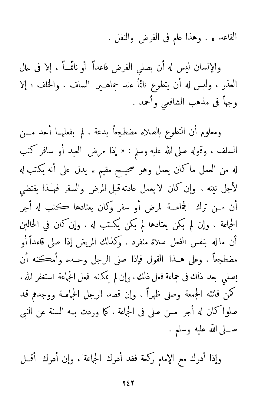 الْقَاعِدِ} . وَهَذَا عَامٌّ فِي الْفَرْضِ وَالنَّفْلِ. وَالْإِنْسَانُ لَيْسَ لَهُ أَنْ يُصَلِّيَ الْفَرْضَ قَاعِدًا أَوْ نَائِمًا إلَّا فِي حَالِ الْعُذْرِ وَلَيْسَ لَهُ أَنْ يَتَطَوَّعَ نَائِمًا عِنْدَ جَمَاهِيرَ السَّلَفِ وَالْخَلَفِ؛ إلَّا وَجْهًا فِي مَذْهَبِ الشَّافِعِيِّ وَأَحْمَد. وَمَعْلُومٌ أَنَّ التَّطَوُّعَ بِالصَّلَاةِ مُضْطَجِعًا بِدْعَةٌ لَمْ يَفْعَلْهَا أَحَدٌ مِنْ السَّلَفِ وَقَوْلُهُ صَلَّى اللَّهُ عَلَيْهِ وَسَلَّمَ " {إذَا مَرِضَ الْعَبْدُ أَوْ سَافَرَ كُتِبَ لَهُ مِنْ الْعَمَلِ مَا كَانَ يَعْمَلُ وَهُوَ صَحِيحٌ مُقِيمٌ} يَدُلُّ عَلَى أَنَّهُ يُكْتَبُ لَهُ لِأَجْلِ نِيَّتِهِ وَإِنْ كَانَ لَا يَعْمَلُ عَادَتُهُ قَبْلَ الْمَرَضِ وَالسَّفَرِ فَهَذَا يَقْتَضِي أَنَّ مَنْ تَرَكَ الْجَمَاعَةَ لِمَرَضِ أَوْ سَفَرٍ وَكَانَ يَعْتَادُهَا كُتِبَ لَهُ أَجْرُ الْجَمَاعَةِ وَإِنْ لَمْ يَكُنْ يَعْتَادُهَا لَمْ يَكُنْ يُكْتَبْ لَهُ وَإِنْ كَانَ فِي الْحَالَيْنِ أَنَّ مَا لَهُ بِنَفْسِ الْفِعْلِ صَلَاةُ مُنْفَرِدٍ. وَكَذَلِكَ الْمَرِيضُ إذَا صَلَّى قَاعِدًا أَوْ مُضْطَجِعًا. وَعَلَى هَذَا الْقَوْلِ فَإِذَا صَلَّى الرَّجُلُ وَحْدَهُ. وَأَمْكَنَهُ أَنْ يُصَلِّيَ بَعْدَ ذَلِكَ فِي جَمَاعَةٍ فَعَلَ ذَلِكَ وَإِنْ لَمْ يُمْكِنْهُ فِعْلُ الْجَمَاعَةِ اسْتَغْفَرَ اللَّهَ كَمَنْ فَاتَتْهُ الْجُمُعَةُ وَصَلَّى ظُهْرًا وَإِنْ قَصَدَ الرَّجُلُ الْجَمَاعَةَ وَوَجَدَهُمْ قَدْ صَلَّوْا كَانَ لَهُ أَجْرُ مَنْ صَلَّى فِي الْجَمَاعَةِ كَمَا وَرَدَتْ بِهِ السُّنَّةُ عَنْ النَّبِيِّ صَلَّى اللَّهُ عَلَيْهِ وَسَلَّمَ. وَإِذَا أَدْرَكَ مَعَ الْإِمَامِ رَكْعَةً فَقَدْ أَدْرَكَ الْجَمَاعَةَ وَإِنْ أَدْرَكَ أَقَلَّ
