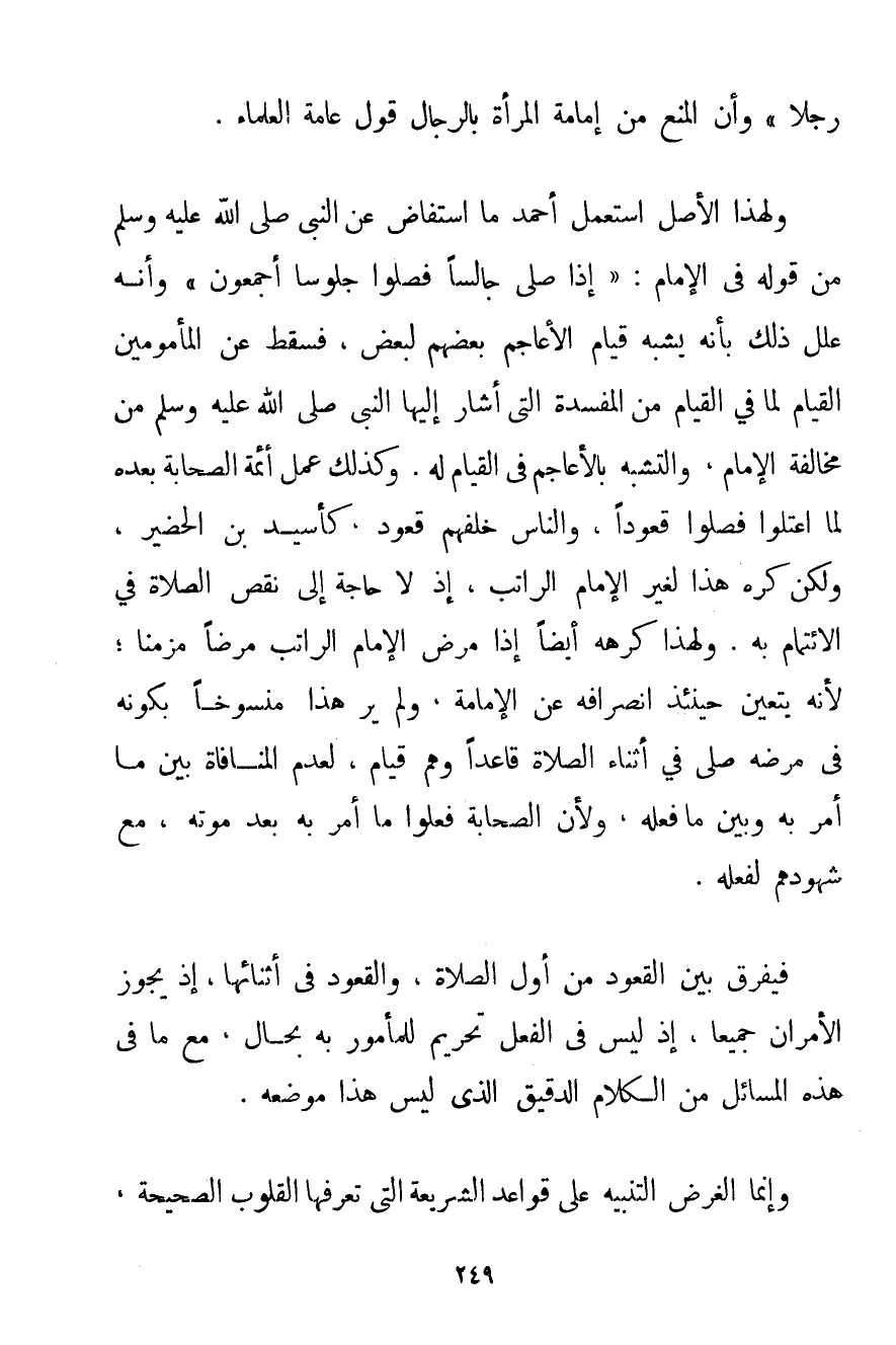 رَجُلًا} وَإِنَّ الْمَنْعَ مِنْ إمَامَةِ الْمَرْأَةِ بِالرِّجَالِ قَوْلُ عَامَّةِ الْعُلَمَاءِ. وَلِهَذَا الْأَصْلِ اسْتَعْمَلَ أَحْمَد مَا اسْتَفَاضَ عَنْ النَّبِيِّ صَلَّى اللَّهُ عَلَيْهِ وَسَلَّمَ مِنْ قَوْلِهِ فِي الْإِمَامِ: " {إذَا صَلَّى جَالِسًا فَصَلُّوا جُلُوسًا أَجْمَعُونَ} وَأَنَّهُ عَلَّلَ ذَلِكَ بِأَنَّهُ يُشْبِهُ قِيَامَ الْأَعَاجِمِ بَعْضُهُمْ لِبَعْضِ فَسَقَطَ عَنْ الْمَأْمُومِينَ الْقِيَامُ لِمَا فِي الْقِيَامِ مِنْ الْمَفْسَدَةِ الَّتِي أَشَارَ إلَيْهَا النَّبِيُّ صَلَّى اللَّهُ عَلَيْهِ وَسَلَّمَ مِنْ مُخَالَفَةِ الْإِمَامِ وَالتَّشَبُّهِ بِالْأَعَاجِمِ فِي الْقِيَامِ لَهُ. وَكَذَلِكَ عَمَلُ أَئِمَّةِ الصَّحَابَةِ بَعْدَهُ لَمَّا اعْتَلُّوا فَصَلَّوْا قُعُودًا وَالنَّاسُ خَلْفَهُمْ قُعُودٌ كأسيد بْنِ الحضير وَلَكِنْ كَرِهَ هَذَا لِغَيْرِ الْإِمَامِ الرَّاتِبِ إذْ لَا حَاجَةَ إلَى نَقْصِ الصَّلَاةِ فِي الِائْتِمَامِ بِهِ، وَلِهَذَا كَرِهَهُ أَيْضًا إذَا مَرِضَ الْإِمَامُ الرَّاتِبُ مَرَضًا مُزْمِنًا؛ لِأَنَّهُ يَتَعَيَّنُ حِينَئِذٍ انْصِرَافُهُ عَنْ الْإِمَامَةِ وَلَمْ يَرَ هَذَا مَنْسُوخًا بِكَوْنِهِ فِي مَرَضِهِ صَلَّى فِي أَثْنَاءِ الصَّلَاةِ قَاعِدًا وَهُمْ قِيَامٌ لِعَدَمِ الْمُنَافَاةِ بَيْنَ مَا أَمَرَ بِهِ وَبَيْنَ مَا فَعَلَهُ وَلِأَنَّ الصَّحَابَةَ فَعَلُوا مَا أَمَرَ بِهِ بَعْدَ مَوْتِهِ مَعَ شُهُودِهِمْ لِفِعْلِهِ. فَيُفَرِّقُ بَيْنَ الْقُعُودِ مِنْ أَوَّلِ الصَّلَاةِ وَالْقُعُودِ فِي أَثْنَائِهَا إذْ يَجُوزُ الْأَمْرَانِ جَمِيعًا إذْ لَيْسَ فِي الْفِعْلِ تَحْرِيمٌ لِلْمَأْمُورِ بِهِ بِحَالِ مَعَ مَا فِي هَذِهِ الْمَسَائِلِ مِنْ الْكَلَامِ الدَّقِيقِ الَّذِي لَيْسَ هَذَا مَوْضِعَهُ. وَإِنَّمَا الْغَرَضُ التَّنْبِيهُ عَلَى قَوَاعِدِ الشَّرِيعَةِ الَّتِي تَعْرِفُهَا الْقُلُوبُ الصَّحِيحَةُ