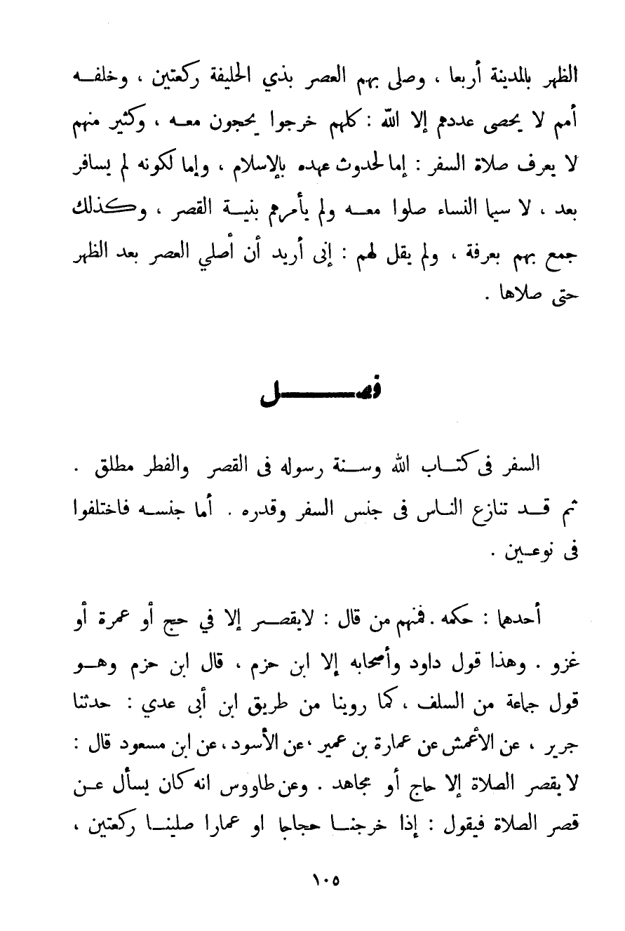 السَّفَرُ فِي كِتَابِ اللَّهِ وَسُنَّةِ رَسُولِهِ فِي الْقَصْرِ وَالْفِطْرِ مُطْلَقٌ. ثُمَّ قَدْ تَنَازَعَ النَّاسُ فِي جِنْسِ السَّفَرِ وَقَدْرِهِ. أَمَّا جِنْسُهُ فَاخْتَلَفُوا فِي نَوْعَيْنِ. أَحَدُهُمَا: حُكْمُهُ. فَمِنْهُمْ مَنْ قَالَ: لَا يُقْصَرُ إلَّا فِي حَجٍّ أَوْ عُمْرَةٍ أَوْ غَزْوٍ. وَهَذَا قَوْلُ دَاوُد وَأَصْحَابِهِ إلَّا ابْنَ حَزْمٍ قَالَ ابْنُ حَزْمٍ وَهُوَ قَوْلُ جَمَاعَةٍ مِنْ السَّلَفِ كَمَا روينا مِنْ طَرِيقِ ابْنِ أَبِي عَدِيٍّ: حَدَّثَنَا جَرِيرٌ عَنْ الْأَعْمَشِ عَنْ عِمَارَةَ بْنِ عُمَيْرٍ عَنْ الْأَسْوَدِ عَنْ ابْنِ مَسْعُودٍ قَالَ: لَا يَقْصُرُ الصَّلَاةَ إلَّا حَاجٌّ أَوْ مُجَاهِدٌ. وَعَنْ طَاوُوسٍ أَنَّهُ كَانَ يُسْأَلُ عَنْ قَصْرِ الصَّلَاةِ فَيَقُولُ: إذَا خَرَجْنَا حُجَّاجًا أَوْ عُمَّارًا صَلَّيْنَا رَكْعَتَيْنِ