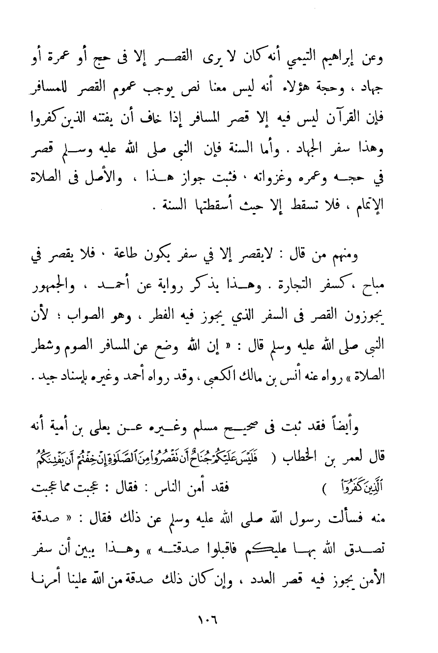 وَعَنْ إبْرَاهِيمَ التيمي أَنَّهُ كَانَ لَا يَرَى الْقَصْرَ إلَّا فِي حَجٍّ أَوْ عُمْرَةٍ أَوْ جَهَادٍ وَحُجَّةُ هَؤُلَاءِ أَنَّهُ لَيْسَ مَعَنَا نَصٌّ يُوجِبُ عُمُومَ الْقَصْرِ لِلْمُسَافِرِ فَإِنَّ الْقُرْآنَ لَيْسَ فِيهِ إلَّا قَصْرُ الْمُسَافِرِ إذَا خَافَ أَنْ يَفْتِنَهُ الَّذِينَ كَفَرُوا وَهَذَا سَفَرُ الْجِهَادِ. وَأَمَّا السُّنَّةُ فَإِنَّ النَّبِيَّ صَلَّى اللَّهُ عَلَيْهِ وَسَلَّمَ قَصَرَ فِي حَجِّهِ وَعُمَرِهِ وَغَزَوَاتِهِ فَثَبَتَ جَوَازُ هَذَا وَالْأَصْلُ فِي الصَّلَاةِ الْإِتْمَامُ فَلَا تَسْقُطُ إلَّا حَيْثُ أَسْقَطَتْهَا السُّنَّةُ. وَمِنْهُمْ مَنْ قَالَ: لَا يَقْصُرُ إلَّا فِي سَفَرٍ يَكُونُ طَاعَةً فَلَا يَقْصُرُ فِي مُبَاحٍ كَسَفَرِ التِّجَارَةِ. وَهَذَا يَذْكُرُ رِوَايَةً عَنْ أَحْمَد وَالْجُمْهُورُ يُجَوِّزُونَ الْقَصْرَ فِي السَّفَرِ الَّذِي يَجُوزُ فِيهِ الْفِطْرُ وَهُوَ الصَّوَابُ؛ لِأَنَّ النَّبِيَّ صَلَّى اللَّهُ عَلَيْهِ وَسَلَّمَ قَالَ: {إنَّ اللَّهَ وَضَعَ عَنْ الْمُسَافِرِ الصَّوْمَ وَشَطْرَ الصَّلَاةِ} رَوَاهُ عَنْهُ أَنَسُ بْنُ مَالِكٍ الْكَعْبِيُّ وَقَدْ رَوَاهُ أَحْمَد وَغَيْرُهُ بِإِسْنَادٍ جَيِّدٍ. وَأَيْضًا فَقَدْ ثَبَتَ فِي صَحِيحِ مُسْلِمٍ وَغَيْرِهِ عَنْ {يَعْلَى بْنِ أُمَيَّةَ أَنَّهُ قَالَ لِعُمَرِ بْنِ الْخَطَّابِ {فَلَيْسَ عَلَيْكُمْ جُنَاحٌ أَنْ تَقْصُرُوا مِنَ الصَّلَاةِ إنْ خِفْتُمْ أَنْ يَفْتِنَكُمُ الَّذِينَ كَفَرُوا} فَقَدْ أَمِنَ النَّاسُ: فَقَالَ: عَجِبْت مِمَّا عَجِبْت مِنْهُ فَسَأَلْت رَسُولَ اللَّهِ صَلَّى اللَّهُ عَلَيْهِ وَسَلَّمَ عَنْ ذَلِكَ فَقَالَ: صَدَقَةٌ تَصَدَّقَ اللَّهُ بِهَا عَلَيْكُمْ فَاقْبَلُوا صَدَقَتَهُ} وَهَذَا يُبَيِّنُ أَنَّ سَفَرَ الْأَمْنِ يَجُوزُ فِيهِ قَصْرُ الْعَدَدِ وَإِنْ كَانَ ذَلِكَ صَدَقَةً مِنْ اللَّهِ عَلَيْنَا أُمِرْنَا