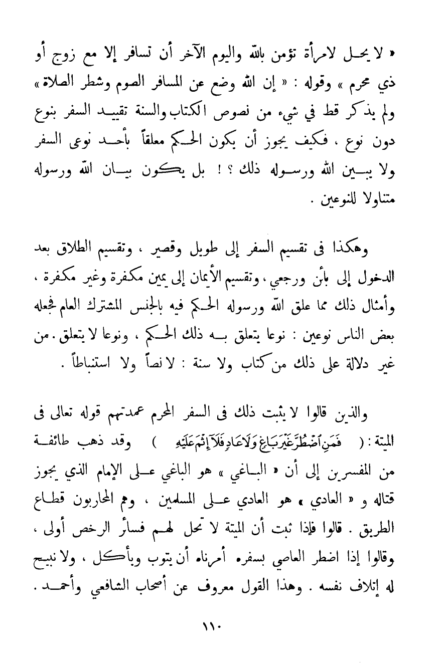 {لَا يَحِلُّ لِامْرَأَةٍ تُؤْمِنُ بِاَللَّهِ وَالْيَوْمِ الْآخِرِ أَنْ تُسَافِرَ إلَّا مَعَ زَوْجٍ أَوْ ذِي مَحْرَمٍ} وَقَوْلُهُ: {إنَّ اللَّهَ وَضَعَ عَنْ الْمُسَافِرِ الصَّوْمَ وَشَطْرَ الصَّلَاةِ} وَلَمْ يَذْكُرْ قَطُّ فِي شَيْءٍ مِنْ نُصُوصِ الْكِتَابِ وَالسُّنَّةِ تَقْيِيدَ السَّفَرِ بِنَوْعٍ دُونَ نَوْعٍ فَكَيْفَ يَجُوزُ أَنْ يَكُونَ الْحُكْمُ مُعَلَّقًا بِأَحَدِ نَوْعَيْ السَّفَرِ وَلَا يُبَيِّنُ اللَّهُ وَرَسُولُهُ ذَلِكَ بَلْ يَكُونُ بَيَانُ اللَّهِ وَرَسُولِهِ مُتَنَاوِلًا لِلنَّوْعَيْنِ. وَهَكَذَا فِي تَقْسِيمِ السَّفَرِ إلَى طَوِيلٍ وَقَصِيرٍ وَتَقْسِيمِ الطَّلَاقِ بَعْدَ الدُّخُولِ إلَى بَائِنٍ وَرَجْعِيٍّ وَتَقْسِيمِ الْأَيْمَانِ إلَى يَمِينٍ مُكَفِّرَةٍ وَغَيْرِ مُكَفِّرَةٍ وَأَمْثَالِ ذَلِكَ مِمَّا عَلَّقَ اللَّهُ وَرَسُولُهُ الْحُكْمَ فِيهِ بِالْجِنْسِ الْمُشْتَرِكِ الْعَامِّ فَجَعَلَهُ بَعْضُ النَّاسِ نَوْعَيْنِ: نَوْعًا يَتَعَلَّقُ بِهِ ذَلِكَ الْحُكْمُ وَنَوْعًا لَا يَتَعَلَّقُ مِنْ غَيْرِ دَلَالَةٍ عَلَى ذَلِكَ مِنْ كِتَابٍ وَلَا سُنَّةٍ: لَا نَصًّا وَلَا اسْتِنْبَاطًا. وَاَلَّذِينَ قَالُوا لَا يَثْبُتُ ذَلِكَ فِي السَّفَرِ الْمُحَرَّمِ عُمْدَتُهُمْ قَوْله تَعَالَى فِي الْمَيْتَةِ: {فَمَنِ اضْطُرَّ غَيْرَ بَاغٍ وَلَا عَادٍ فَلَا إثْمَ عَلَيْهِ} وَقَدْ ذَهَبَ طَائِفَةٌ مِنْ الْمُفَسِّرِينَ إلَى أَنَّ " الْبَاغِيَ " هُوَ الْبَاغِي عَلَى الْإِمَامِ الَّذِي يَجُوزُ قِتَالُهُ وَ " الْعَادِيَ " هُوَ الْعَادِي عَلَى الْمُسْلِمِينَ وَهُمْ الْمُحَارَبُونَ قُطَّاعُ الطَّرِيقِ. قَالُوا فَإِذَا ثَبَتَ أَنَّ الْمَيْتَةَ لَا تَحِلُّ لَهُمْ فَسَائِرُ الرُّخَصِ أَوْلَى وَقَالُوا إذَا اُضْطُرَّ الْعَاصِي بِسَفَرِهِ أَمَرْنَاهُ أَنْ يَتُوبَ وَيَأْكُلَ وَلَا نُبِيحُ لَهُ إتْلَافَ نَفْسِهِ. وَهَذَا الْقَوْلُ مَعْرُوفٌ عَنْ أَصْحَابِ الشَّافِعِيِّ وَأَحْمَد.