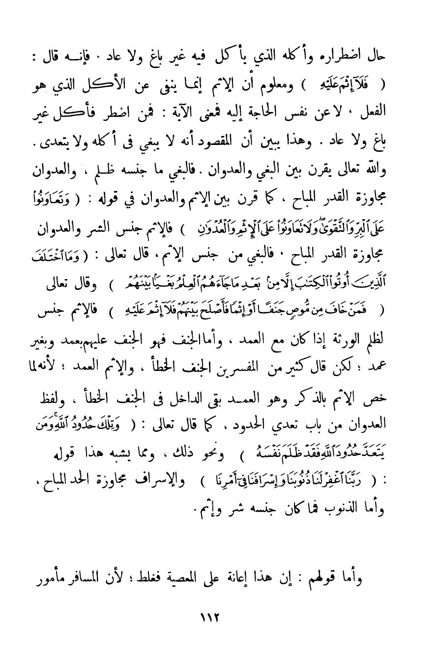 اضْطِرَارِهِ وَأَكْلِهِ الَّذِي يَأْكُلُ فِيهِ غَيْرَ بَاغٍ وَلَا عَادٍ فَإِنَّهُ قَالَ: {فَلَا إثْمَ عَلَيْهِ} وَمَعْلُومٌ أَنَّ الْإِثْمَ إنَّمَا يُنْفَى عَنْ الْأَكْلِ الَّذِي هُوَ الْفِعْلُ لَا عَنْ نَفْسِ الْحَاجَةِ إلَيْهِ فَمَعْنَى الْآيَةِ: فَمَنْ اُضْطُرَّ فَأَكَلَ غَيْرَ بَاغٍ وَلَا عَادٍ. وَهَذَا يُبَيِّنُ أَنَّ الْمَقْصُودَ أَنَّهُ لَا يَبْغِي فِي أَكْلِهِ وَلَا يَتَعَدَّى. وَاَللَّهُ تَعَالَى يَقْرِنُ بَيْنَ الْبَغْيِ وَالْعُدْوَانِ. فَالْبَغْيُ مَا جِنْسُهُ ظُلْمٌ وَالْعُدْوَانُ مُجَاوَزَةُ الْقَدْرِ الْمُبَاحِ كَمَا قَرَنَ بَيْنَ الْإِثْمِ وَالْعُدْوَانِ فِي قَوْلِهِ: {وَتَعَاوَنُوا عَلَى الْبِرِّ وَالتَّقْوَى وَلَا تَعَاوَنُوا عَلَى الْإِثْمِ وَالْعُدْوَانِ} فَالْإِثْمُ جِنْسُ الشَّرِّ وَالْعُدْوَانُ مُجَاوَزَةُ الْقَدْرِ الْمُبَاحِ فَالْبَغْيُ مِنْ جِنْسِ الْإِثْمِ قَالَ تَعَالَى: {وَمَا تَفَرَّقُوا إِلَّا مِنْ بَعْدِ مَا جَاءَهُمُ الْعِلْمُ بَغْيًا بَيْنَهُمْ} وَقَالَ تَعَالَى {فَمَنْ خَافَ مِنْ مُوصٍ جَنَفًا أَوْ إثْمًا فَأَصْلَحَ بَيْنَهُمْ فَلَا إثْمَ عَلَيْهِ} فَالْإِثْمُ جِنْسٌ لِظُلْمِ الْوَرَثَةِ إذَا كَانَ مَعَ الْعَمْدِ وَأَمَّا الْجَنَفُ فَهُوَ الْجَنَفُ عَلَيْهِمْ بِعَمْدٍ وَبِغَيْرِ عَمْدٍ؛ لَكِنْ قَالَ كَثِيرٌ مِنْ الْمُفَسِّرِينَ الْجَنَفُ الْخَطَأُ وَالْإِثْمُ الْعَمْدُ؛ لِأَنَّهُ لَمَّا خَصَّ الْإِثْمَ بِالذِّكْرِ وَهُوَ الْعَمْدُ بَقِيَ الدَّاخِلُ فِي الْجَنَفِ الْخَطَأُ وَلَفْظُ الْعُدْوَانِ مِنْ بَابِ تَعَدِّي الْحُدُودِ كَمَا قَالَ تَعَالَى: {وَتِلْكَ حُدُودُ اللَّهِ وَمَنْ يَتَعَدَّ حُدُودَ اللَّهِ فَقَدْ ظَلَمَ نَفْسَهُ} وَنَحْوُ ذَلِكَ وَمِمَّا يُشْبِهُ هَذَا قَوْلُهُ: {رَبَّنَا اغْفِرْ لَنَا ذُنُوبَنَا وَإِسْرَافَنَا فِي أَمْرِنَا} وَالْإِسْرَافُ مُجَاوَزَةُ الْحَدِّ الْمُبَاحِ وَأَمَّا الذُّنُوبُ فَمَا كَانَ جِنْسُهُ شَرٌّ وَإِثْمٌ. وَأَمَّا قَوْلُهُمْ: إنَّ هَذَا إعَانَةٌ عَلَى الْمَعْصِيَةِ فَغَلَطٌ؛ لِأَنَّ الْمُسَافِرَ مَأْمُورٌ